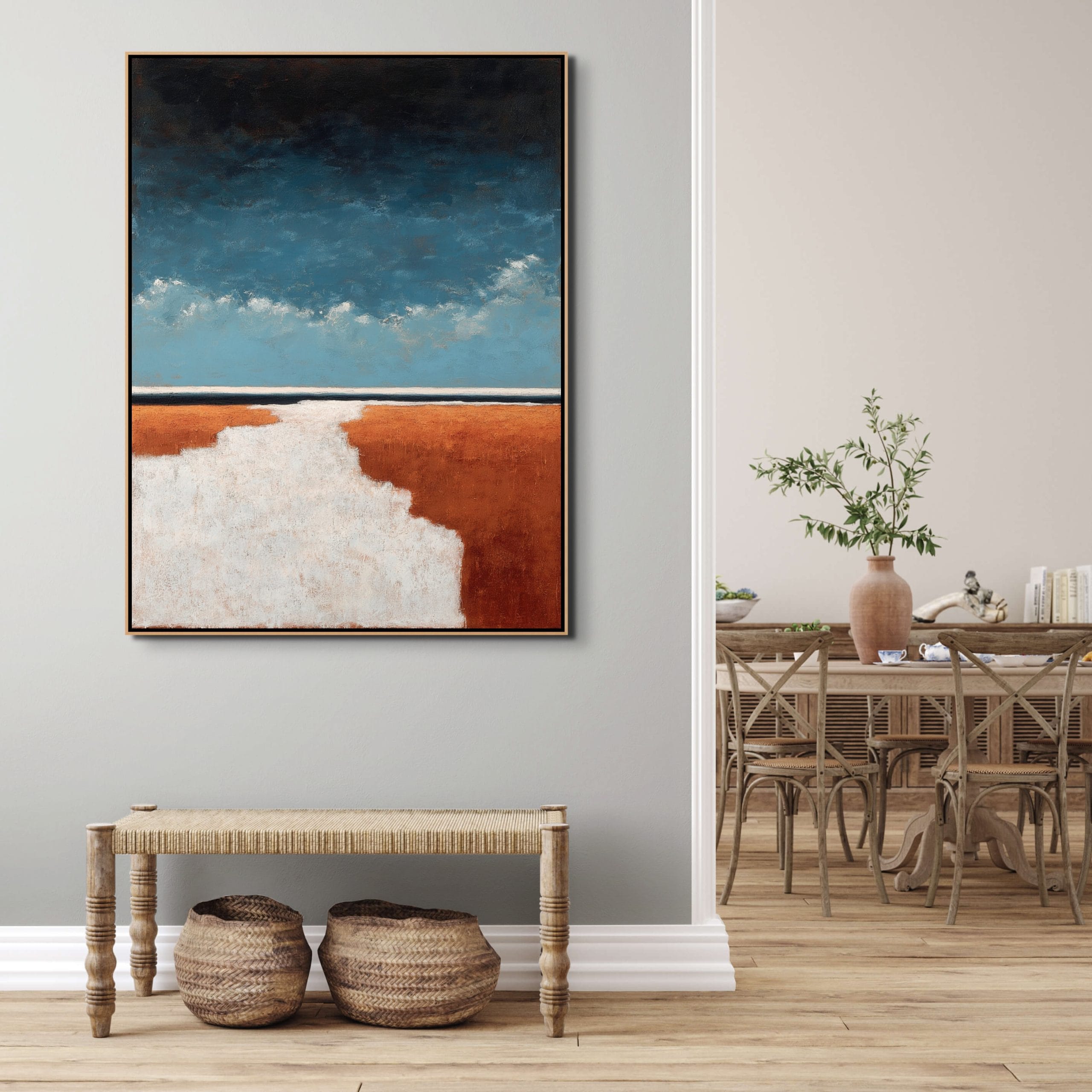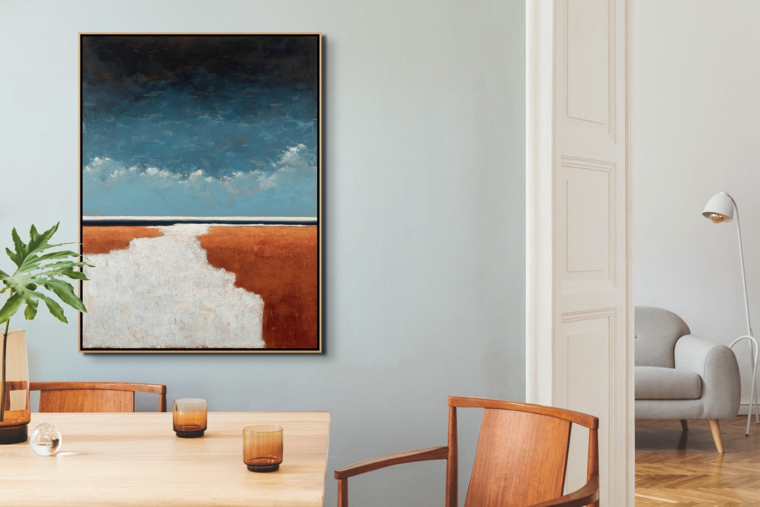 Abstraktní malby tohoto typu oslovují diváka především atmosférou a vnitřním napětím. Obraz nepředkládá konkrétní krajinu, ale spíše vnitřní prostor, ve kterém se setkává ticho, očekávání a otevřenost. Jemná struktura akrylové malby zdůrazňuje ruční charakter díla a přirozenou práci s barvou.