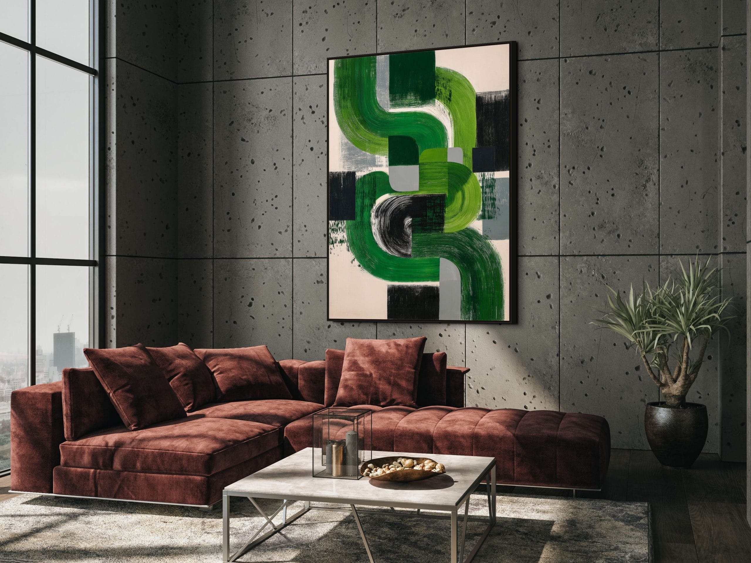 Obraz působí moderně a čistě, ale zároveň živě díky energii širokých gestických stop. Zelená škála dodává prostoru pocit svěžesti a klidu, zatímco tmavé plochy kompozici ukotvují. Díky kombinaci křivek a pravoúhlých segmentů se dílo dobře uplatní v minimalistickém i výrazněji laděném interiéru.
