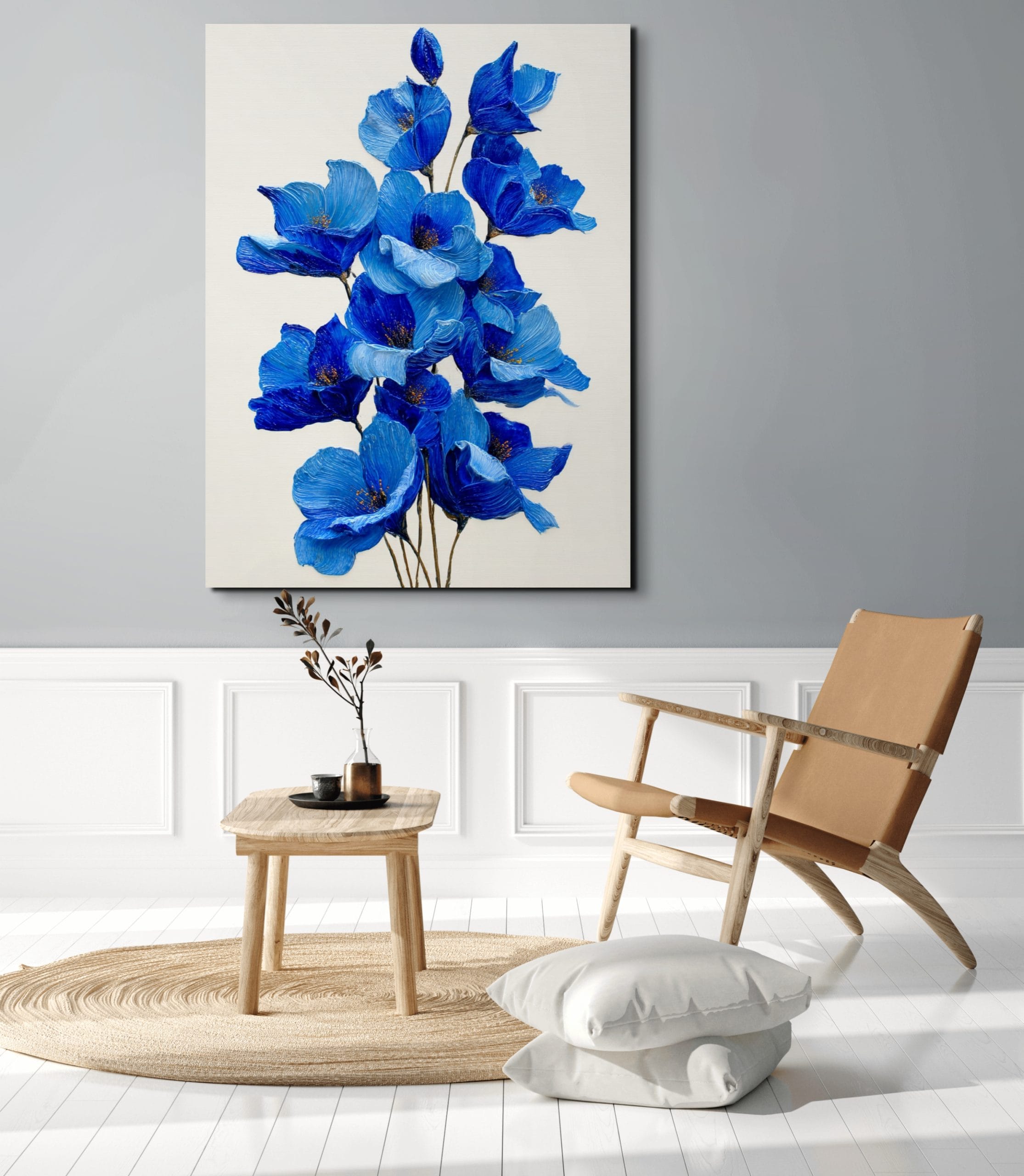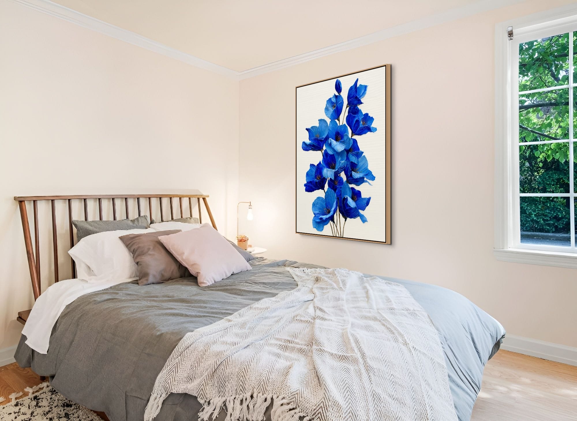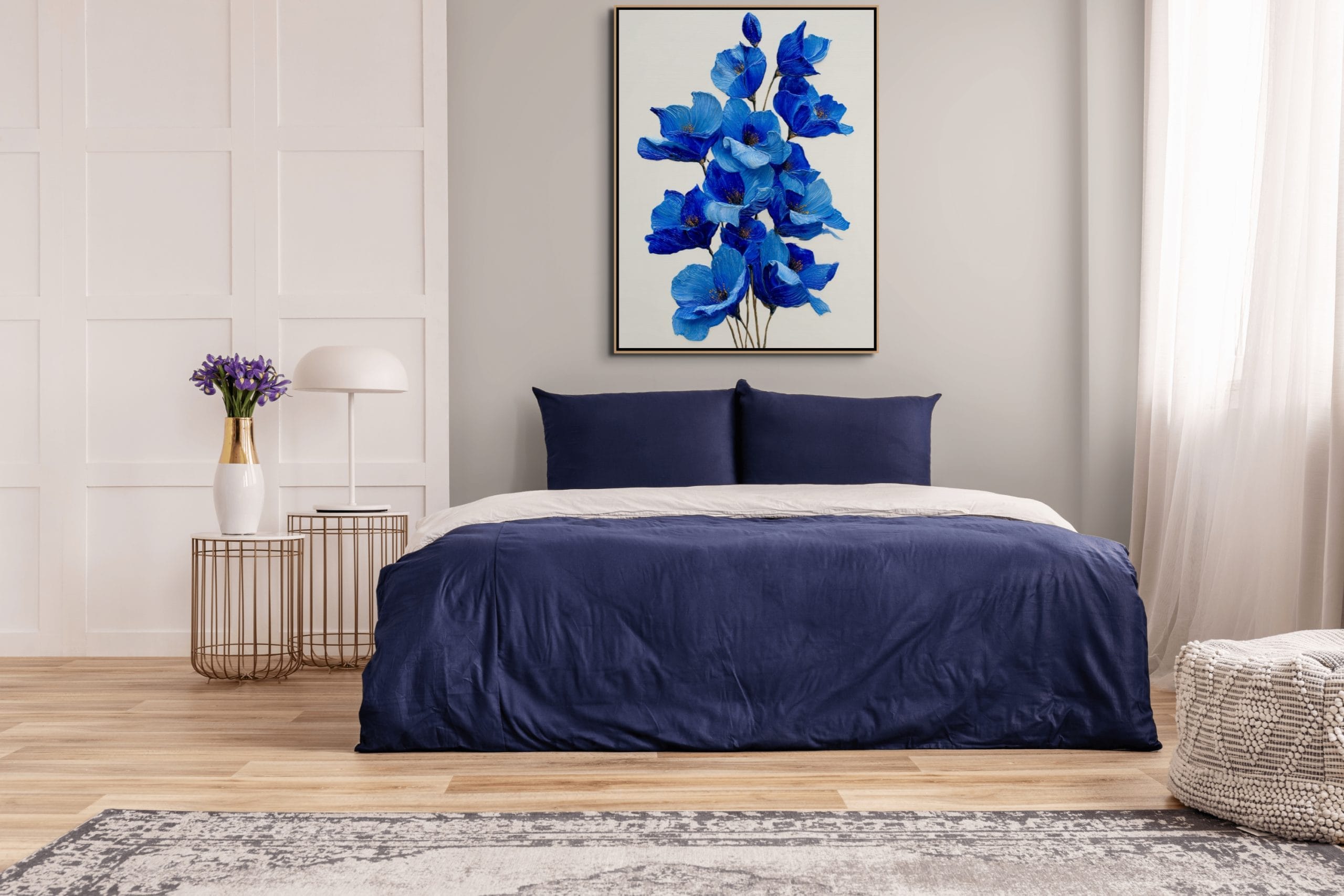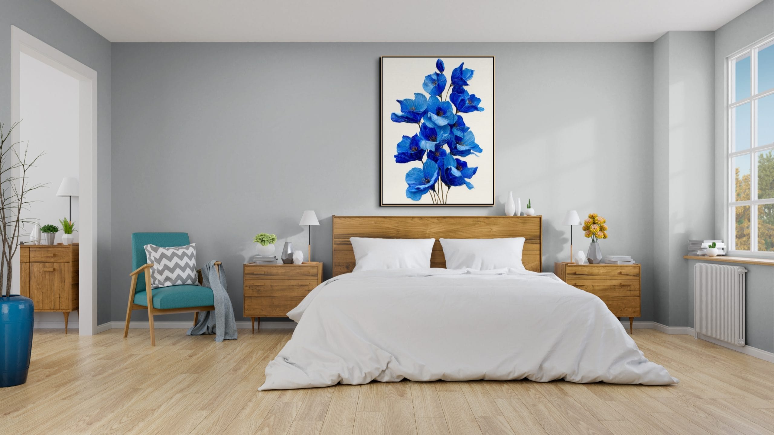 V interiéru působí jako vyvážený prvek, který prostor projasní a zjemní. Modrá barva přináší pocit stability a uvolnění – více o jejím působení v interiéru si můžete přečíst zde modrá barva a její uklidňující efekt. Obraz květin se hodí do obývacích pokojů, ložnic i pracovních prostor, kde podporuje klidnou a harmonickou atmosféru.
