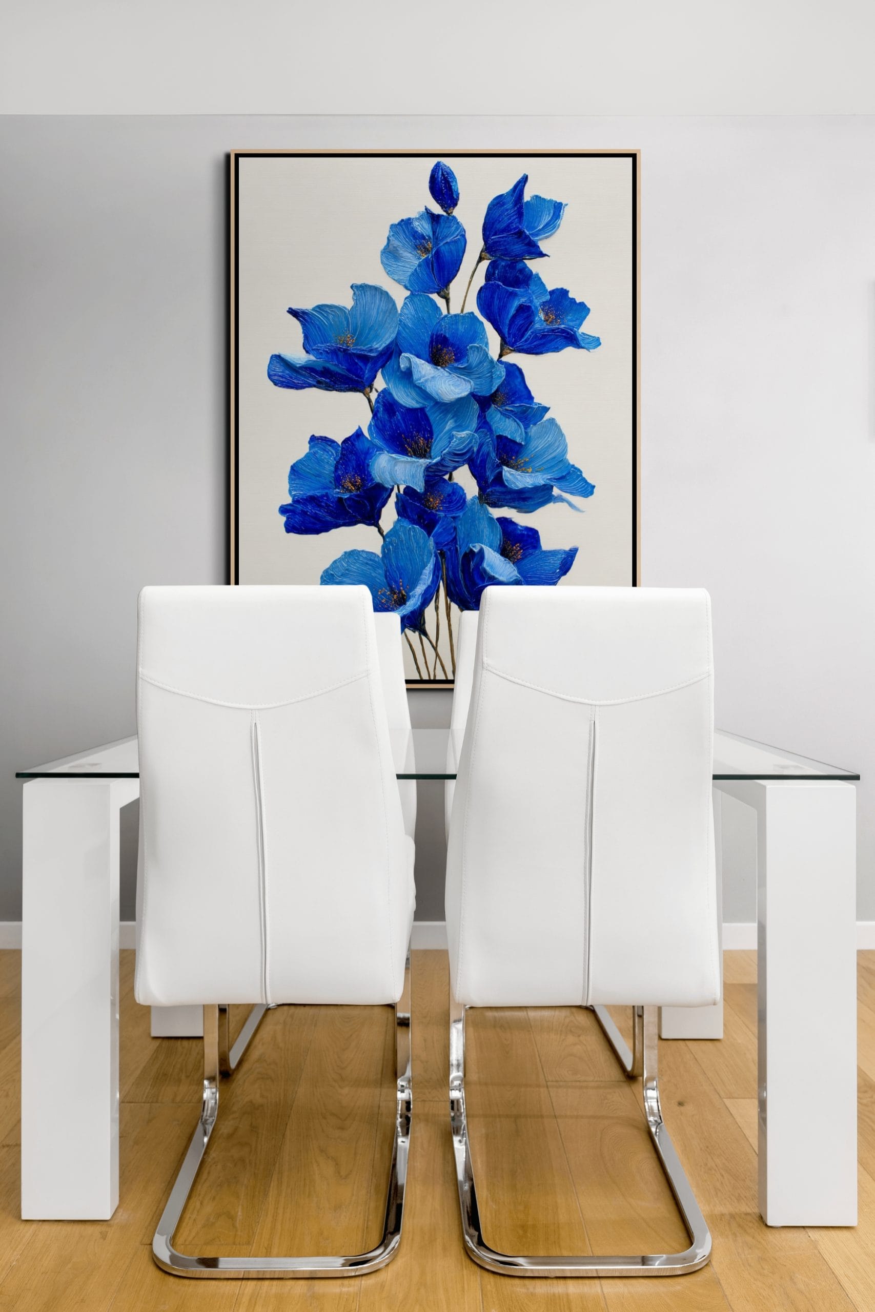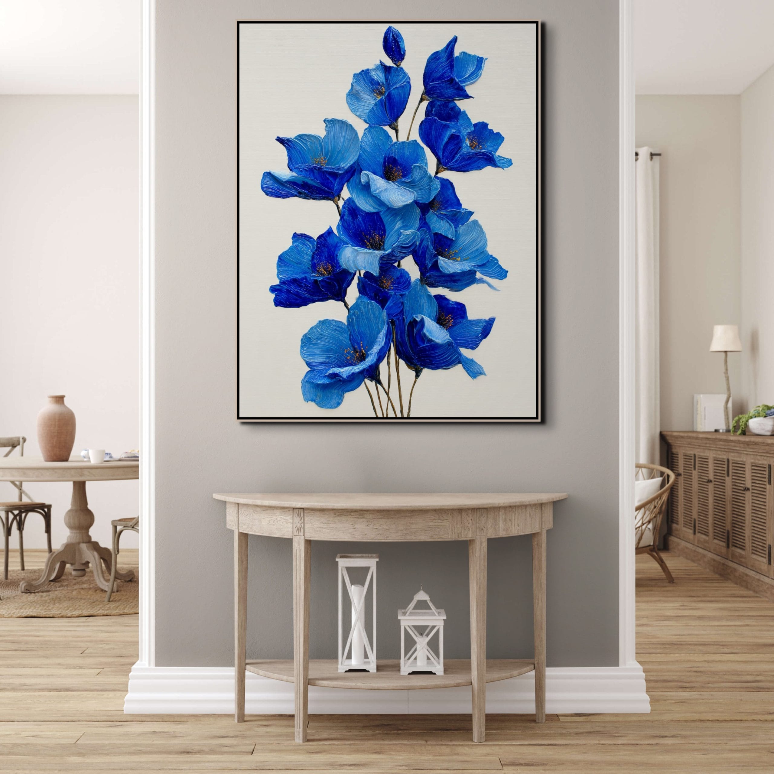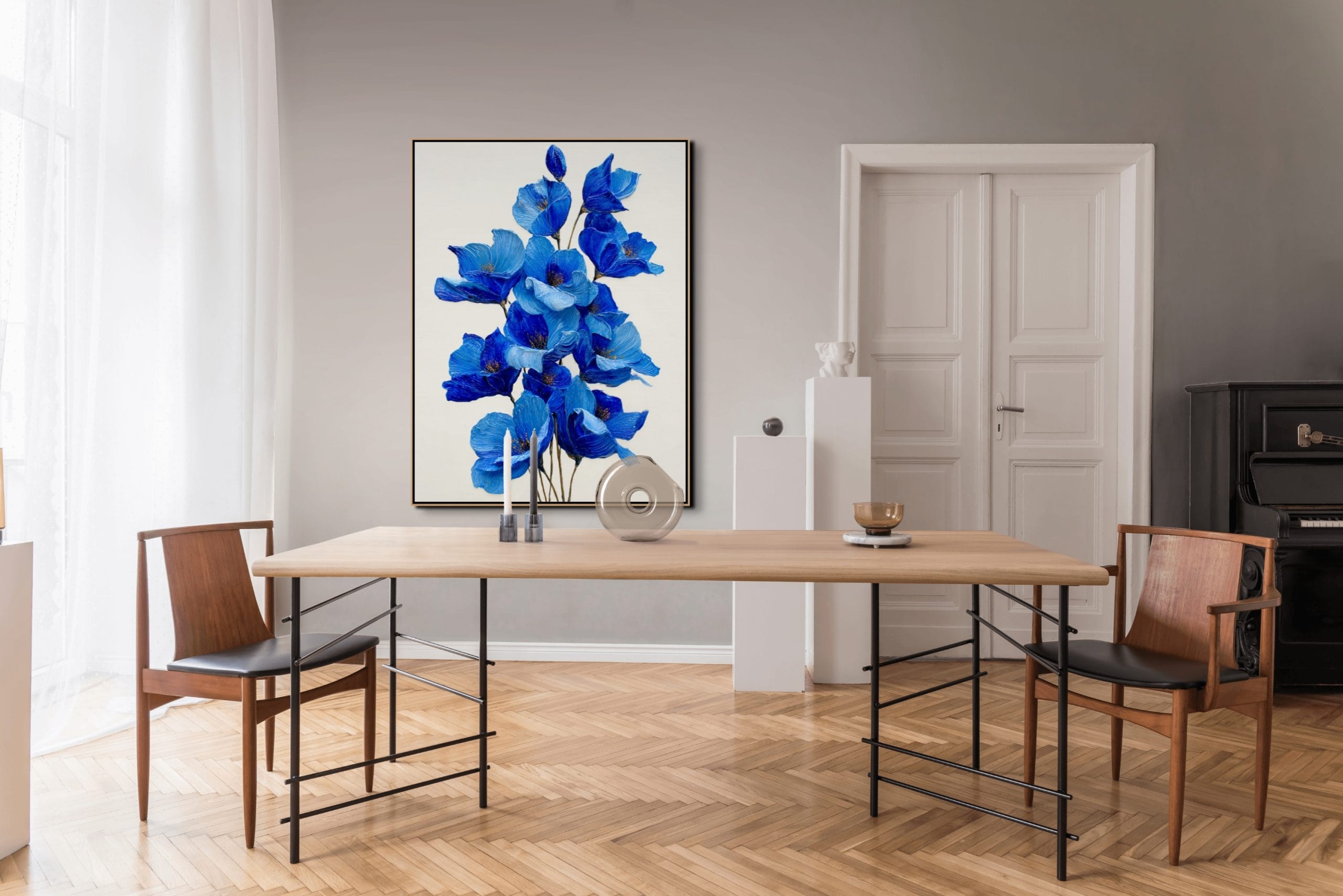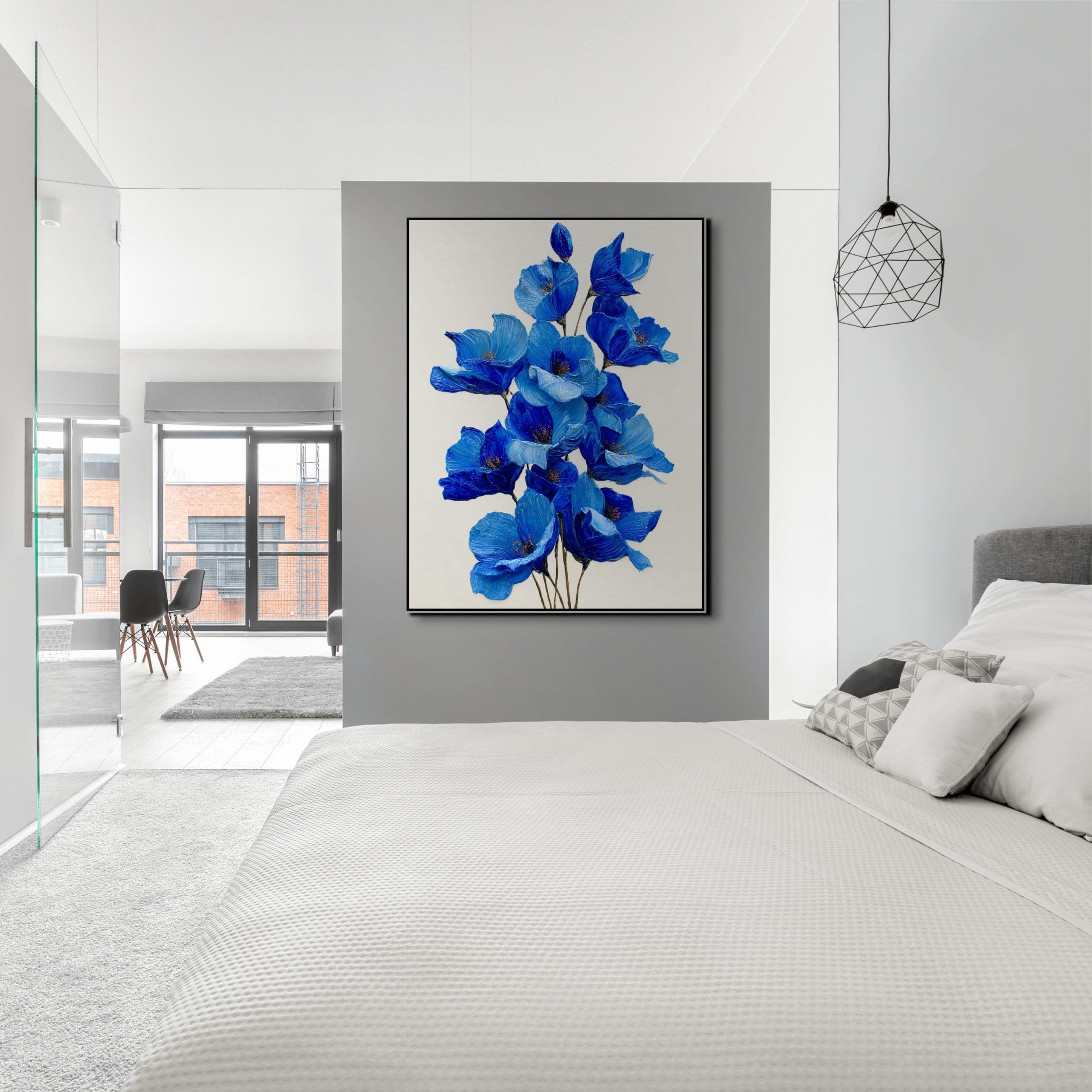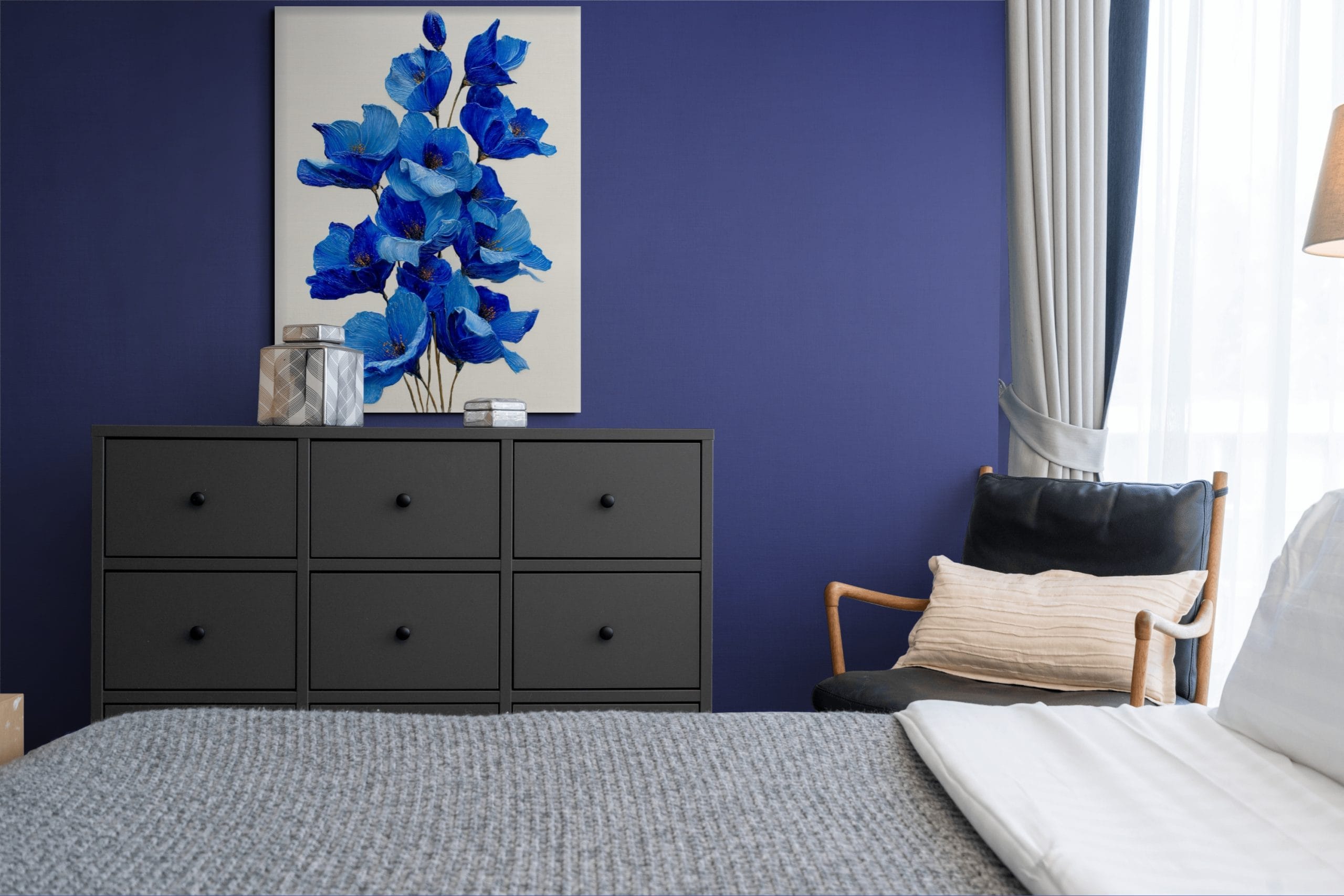 V interiéru působí jako vyvážený prvek, který prostor projasní a zjemní. Modrá barva přináší pocit stability a uvolnění – více o jejím působení v interiéru si můžete přečíst zde modrá barva a její uklidňující efekt. Obraz květin se hodí do obývacích pokojů, ložnic i pracovních prostor, kde podporuje klidnou a harmonickou atmosféru.