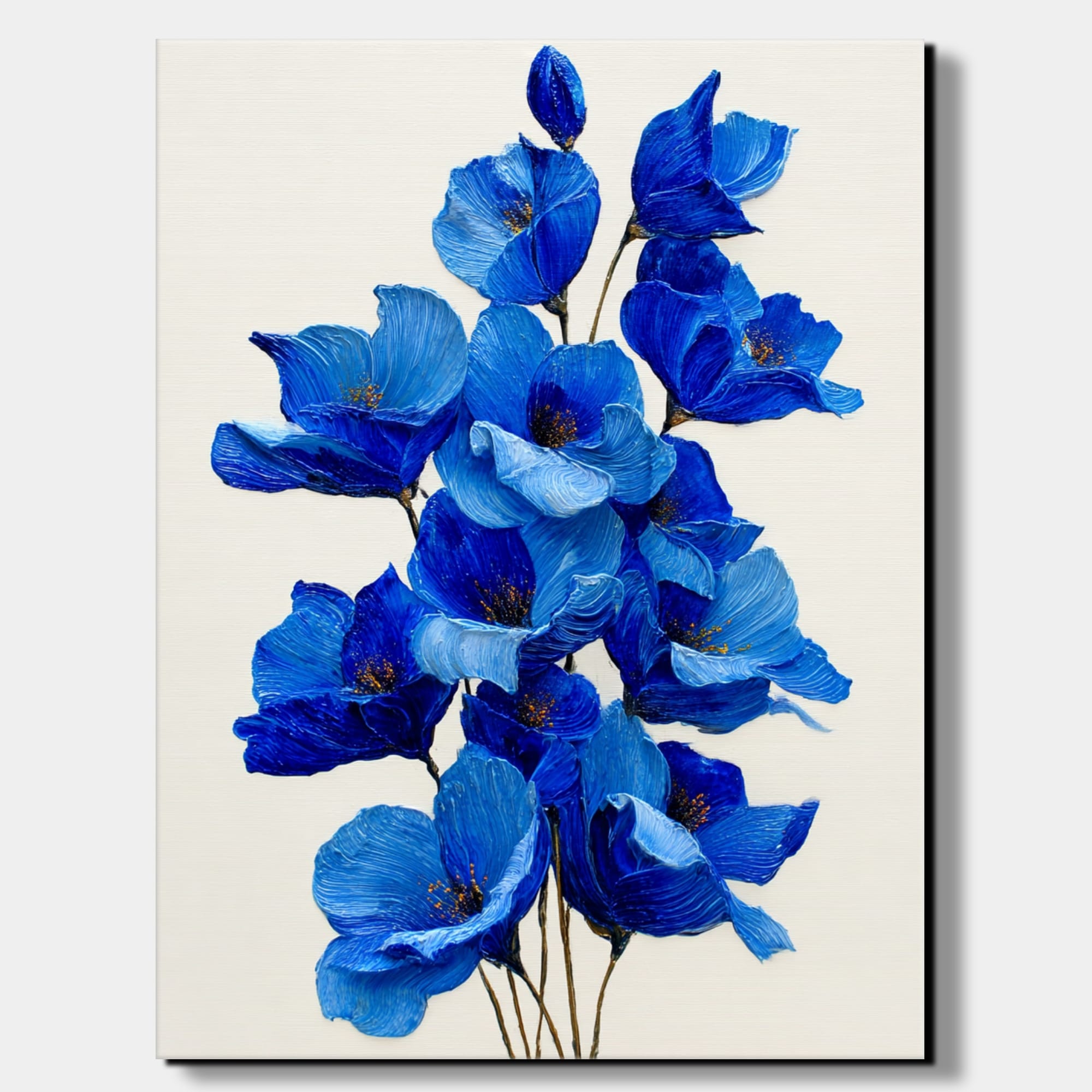 Barva, která uklidňuje. Obraz Azuro pracuje s jemnou kompozicí modrých květů, které se rozvíjejí na světlém pozadí a vytvářejí harmonický celek. Vrstvení barev a struktura tahů štětcem dodávají malbě lehkost a přirozený pohyb, zatímco odstíny modré podtrhují její klidný charakter.