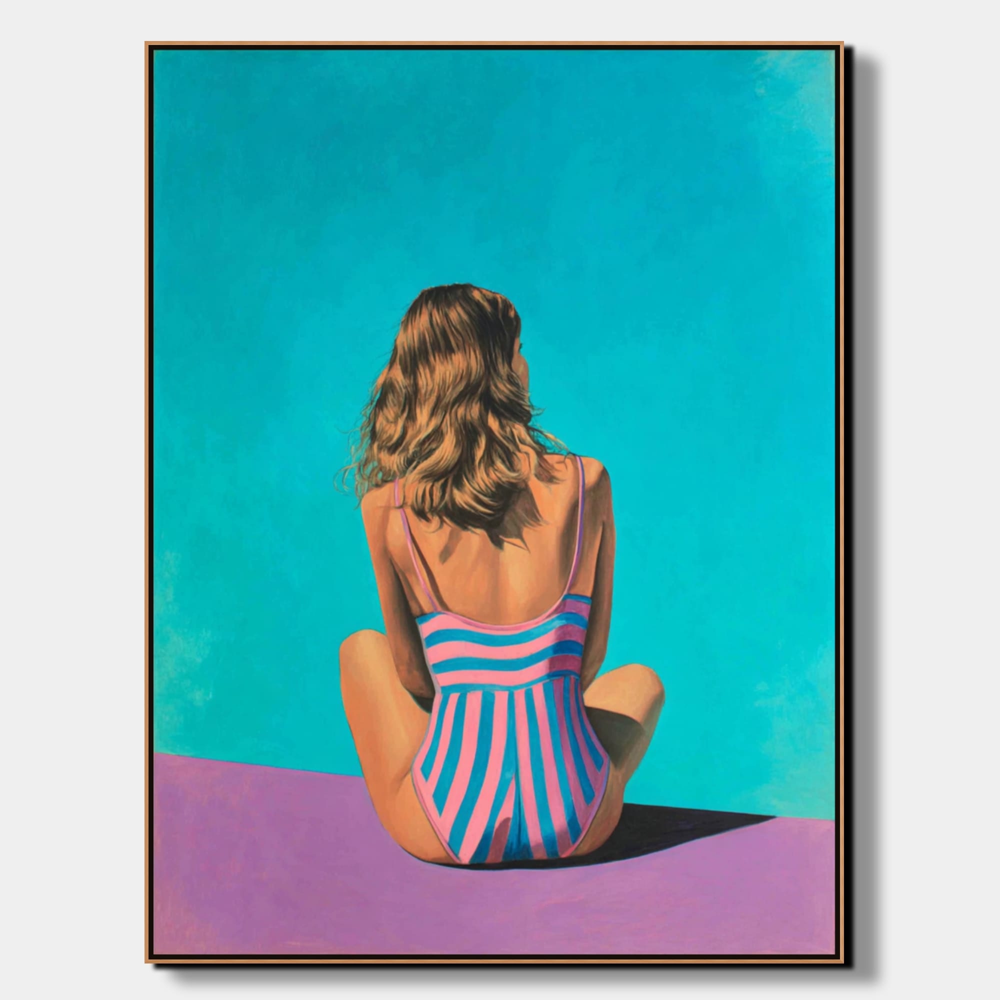 Scéna zachycuje ženu v momentě hlubokého soustředění a klidu u vody, přičemž je kladen velký důraz na realistické ztvárnění detailů pleti a odlesků na hladině. Práce s perspektivou a hloubkou prostoru dává malbě uvěřitelný rozměr, který diváka vtahuje přímo do centra dění. Tento motiv bude skvěle fungovat jako ústřední dekorace nad pohovkou nebo v ložnici, kde podtrhne moderní charakter vybavení. Podobnou tématiku vody a figury nabízí také ručně malovaný obraz Dotek oceánu, který se na koupající se postavu dívá z neobvyklé podhladinové perspektivy. Pokud dáváte přednost kompozici u bazénu, doporučujeme prohlédnout si dílo Letní ochlazení, které rovněž pracuje s atraktivním spojením postavy a vodního živlu. Tyto originální obrazy v rámu dodávají stěnám luxusní vzhled a uměleckou hodnotu.