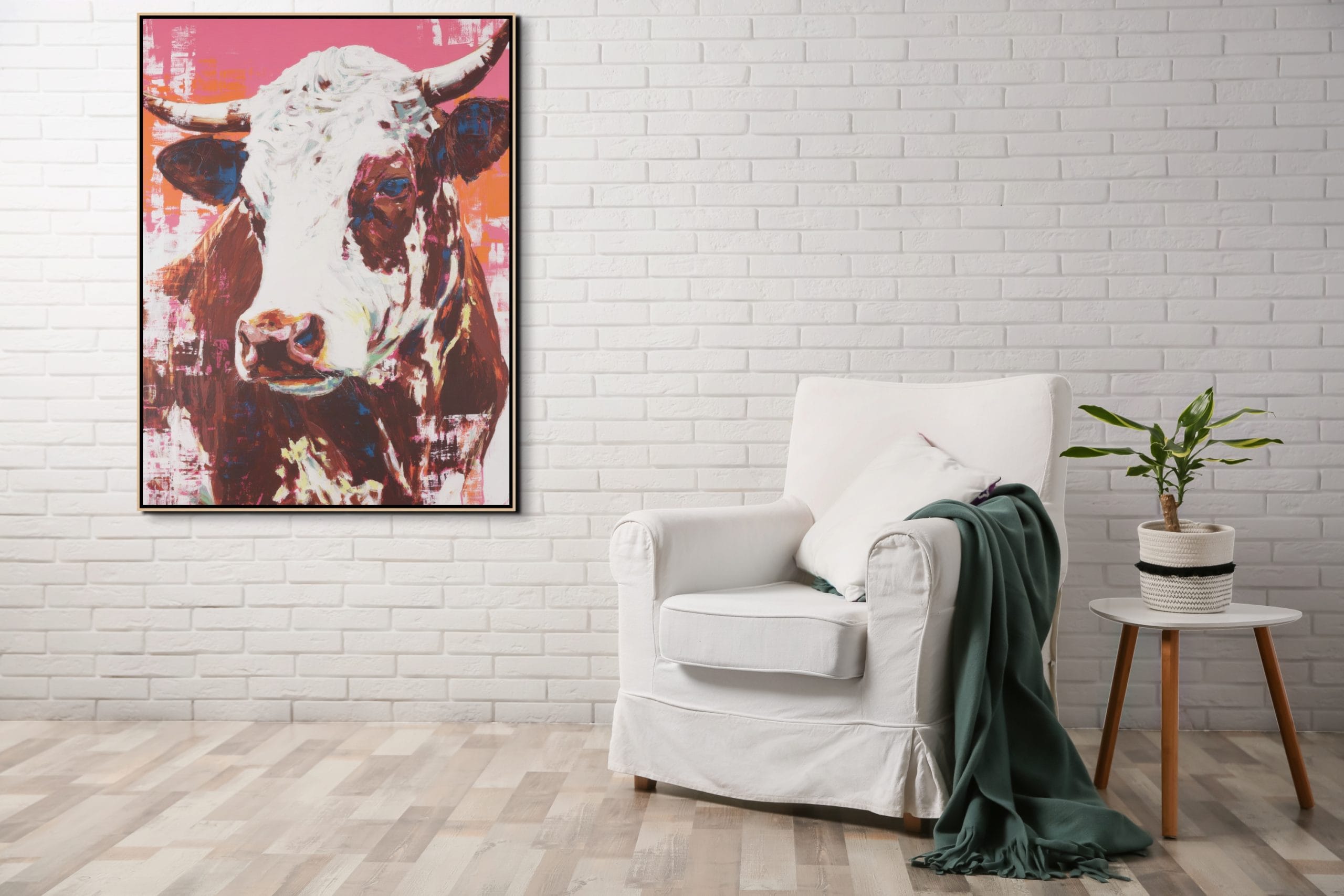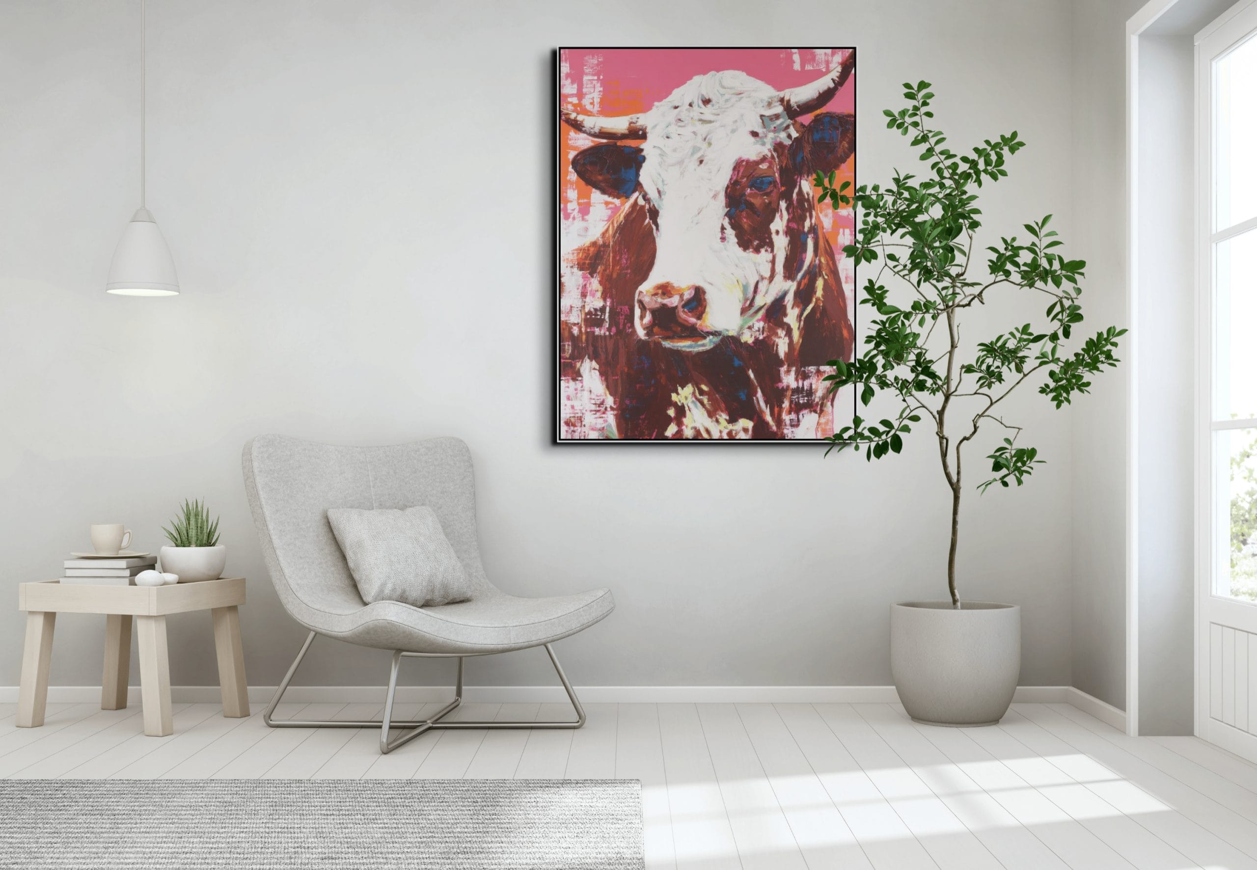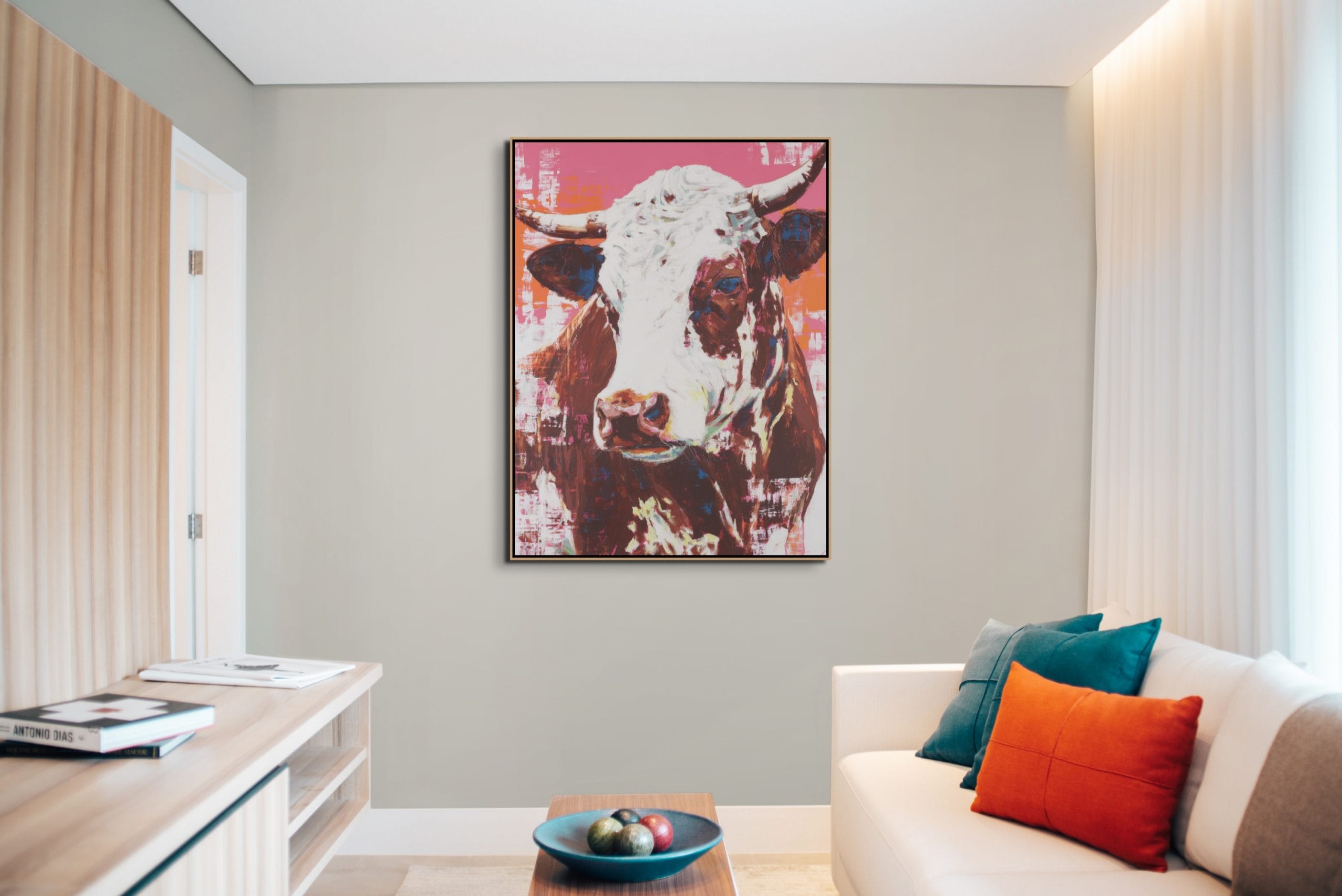 Portrét krávy je ztvárněn výraznou, expresivní malbou s důrazem na strukturu a energii tahu štětce. Kontrast světlých a tmavších ploch zvýrazňuje charakter zvířete a dodává obrazu silnou vizuální přítomnost. Barevné akcenty v pozadí vytvářejí napětí a současně podporují živost celé kompozice.