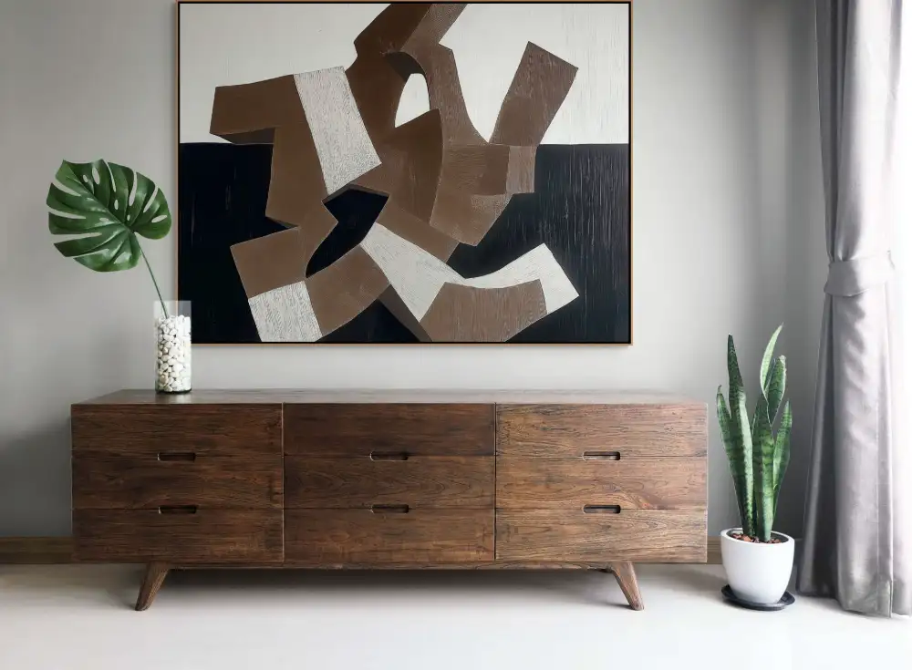 Abstraktní motivy dokážou interiér zmodernizovat a dodat mu osobitý charakter, který se hodí jak do moderních, tak do industriálně laděných prostor. Tmavší barevná základna s kontrastními světlými plochami působí elegantně a sofistikovaně, přičemž zároveň zůstává dostatečně neutrální, aby obraz ladil s různými barevnými schématy interiéru.