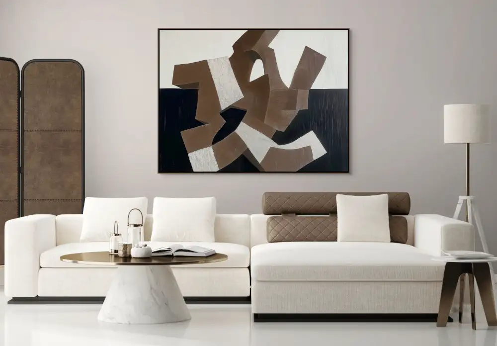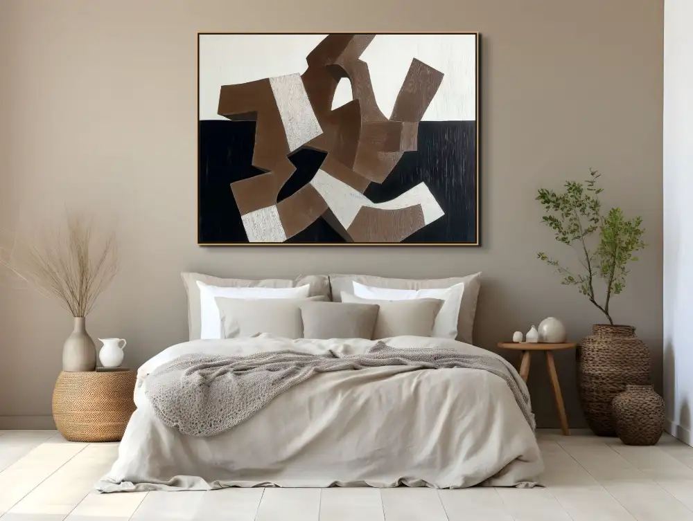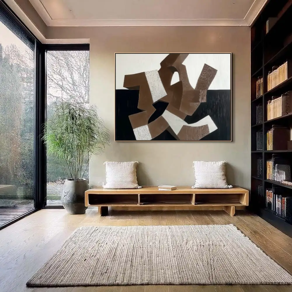 Tyto ručně malované obrazy na plátně představují abstraktní kompozici v tónech hnědé, bílé a černé, které společně vytvářejí silný vizuální dojem. Geometrické tvary se dynamicky proplétají a vytvářejí strukturu plnou pohybu a energie. Jemné textury tahů štětce zajišťují, že každý úhel pohledu odhaluje nové detaily a nuance.