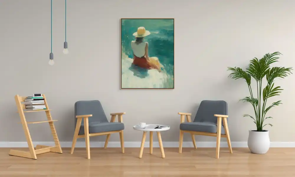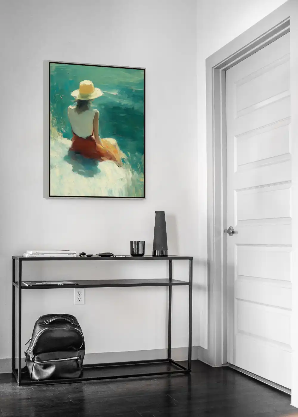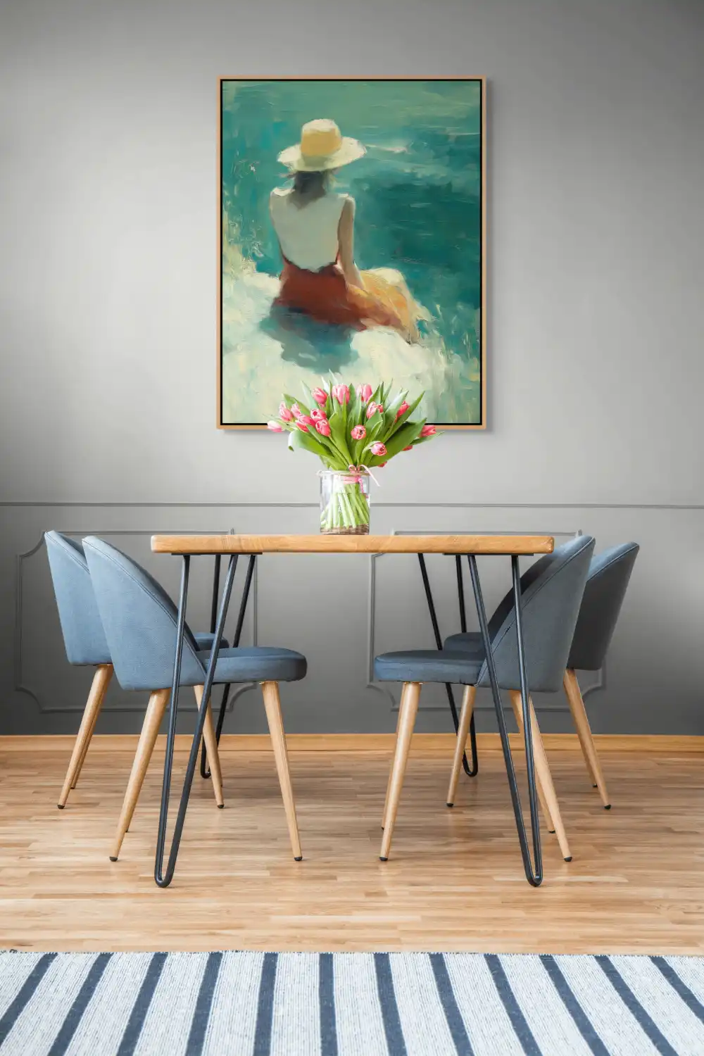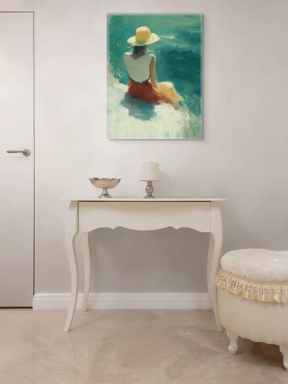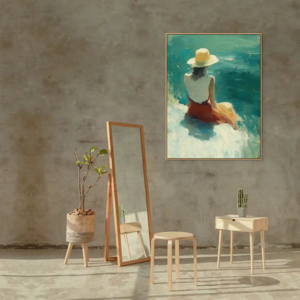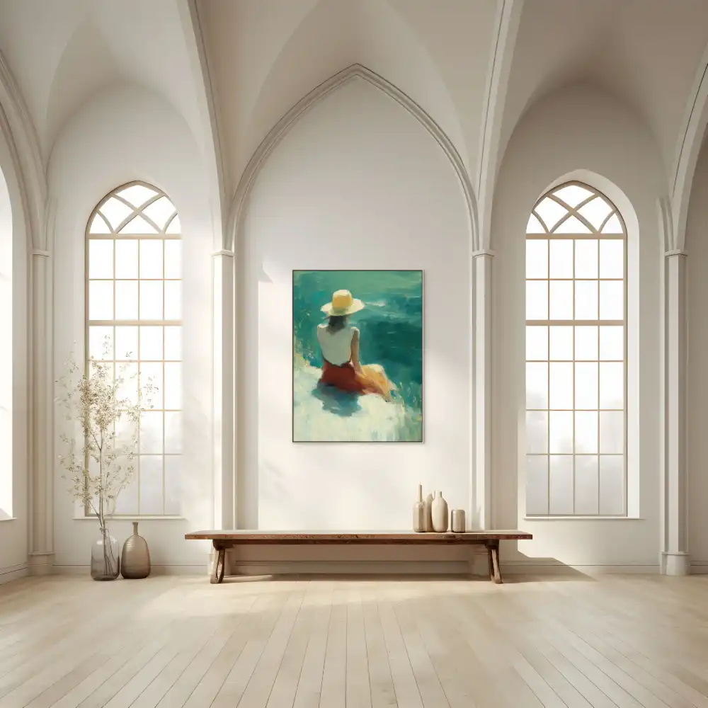 Tato malba zachycuje klidný letní moment, kdy žena v bílém topu a červené sukni sedí na břehu u vody. Její slaměný klobouk a uvolněná silueta kontrastují s tyrkysově zeleným pozadím, které evokuje klidnou hladinu jezera.