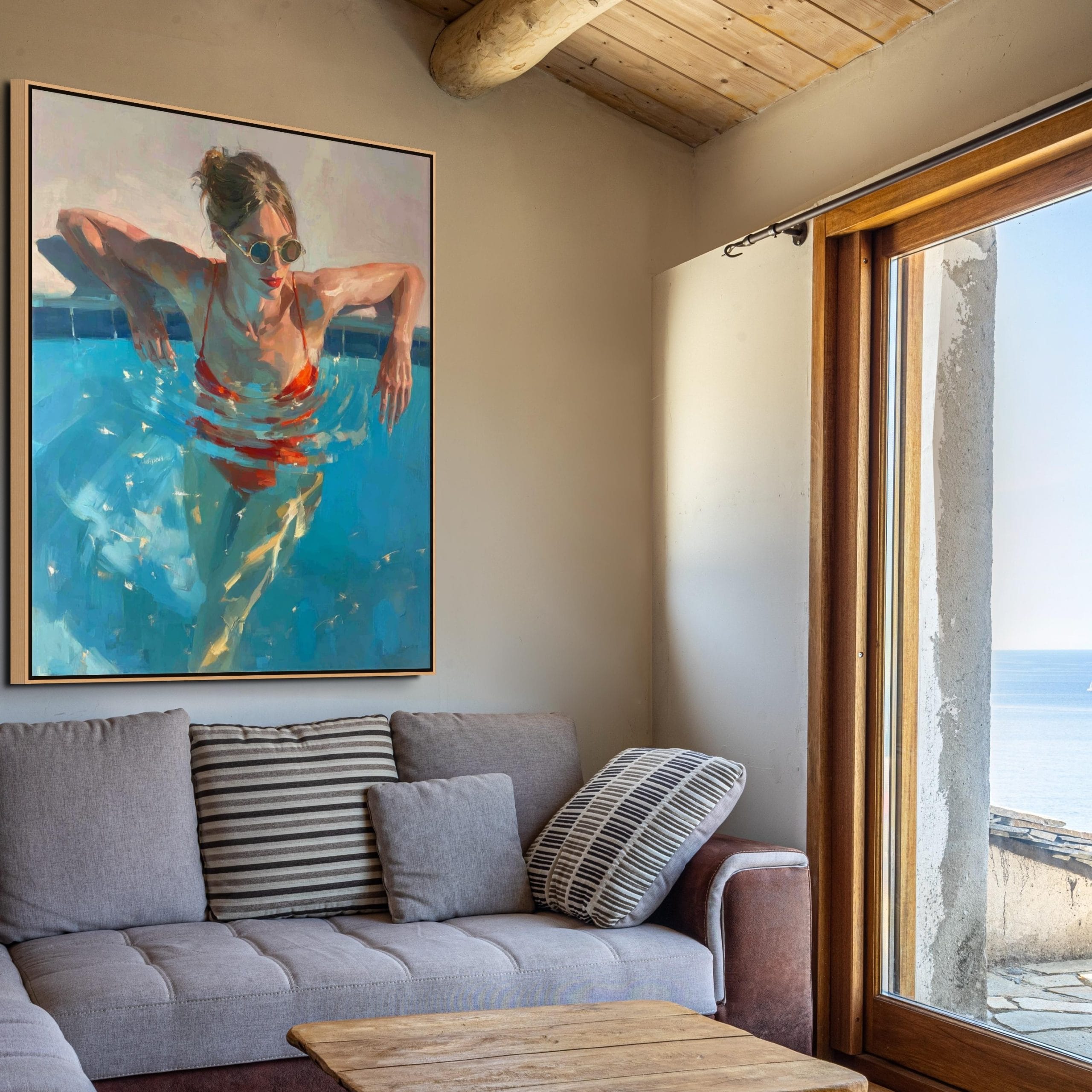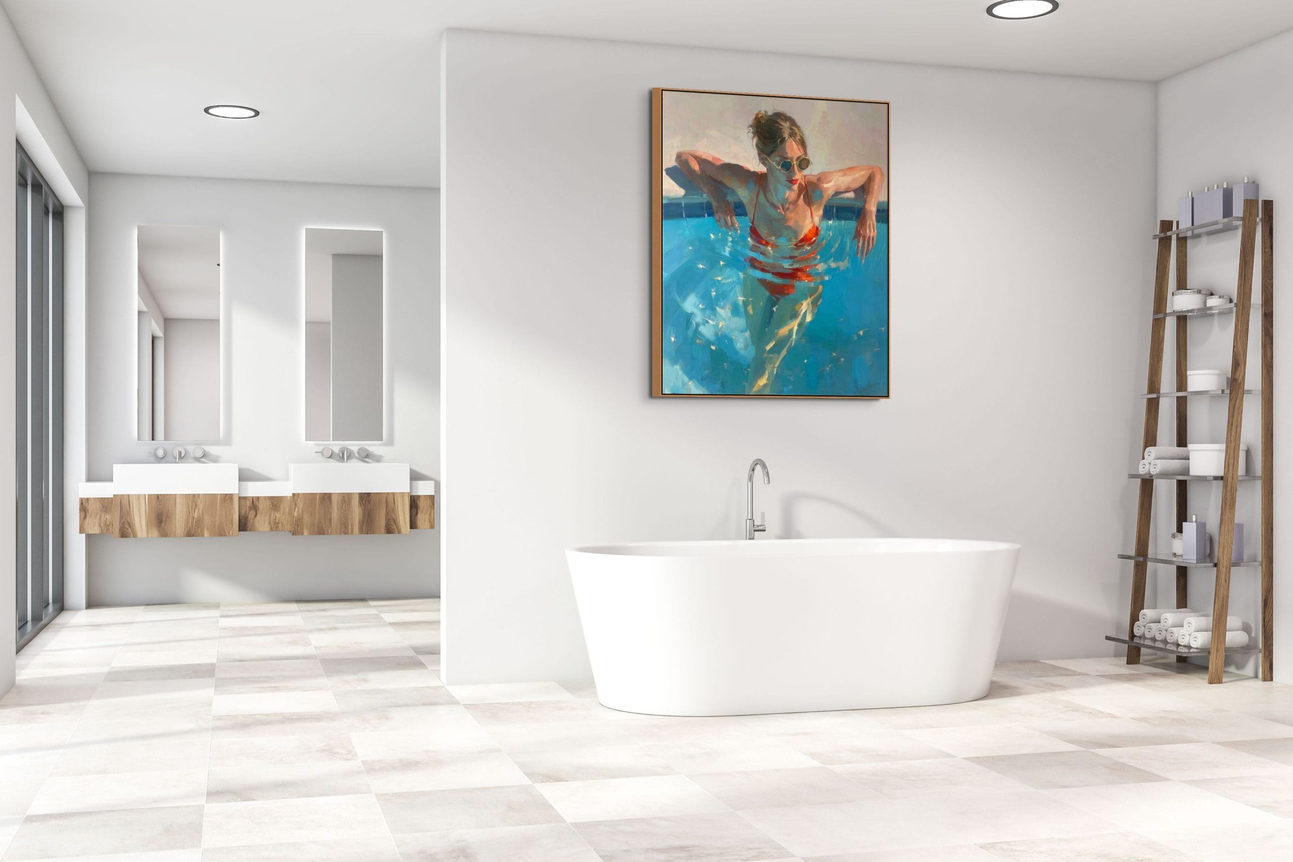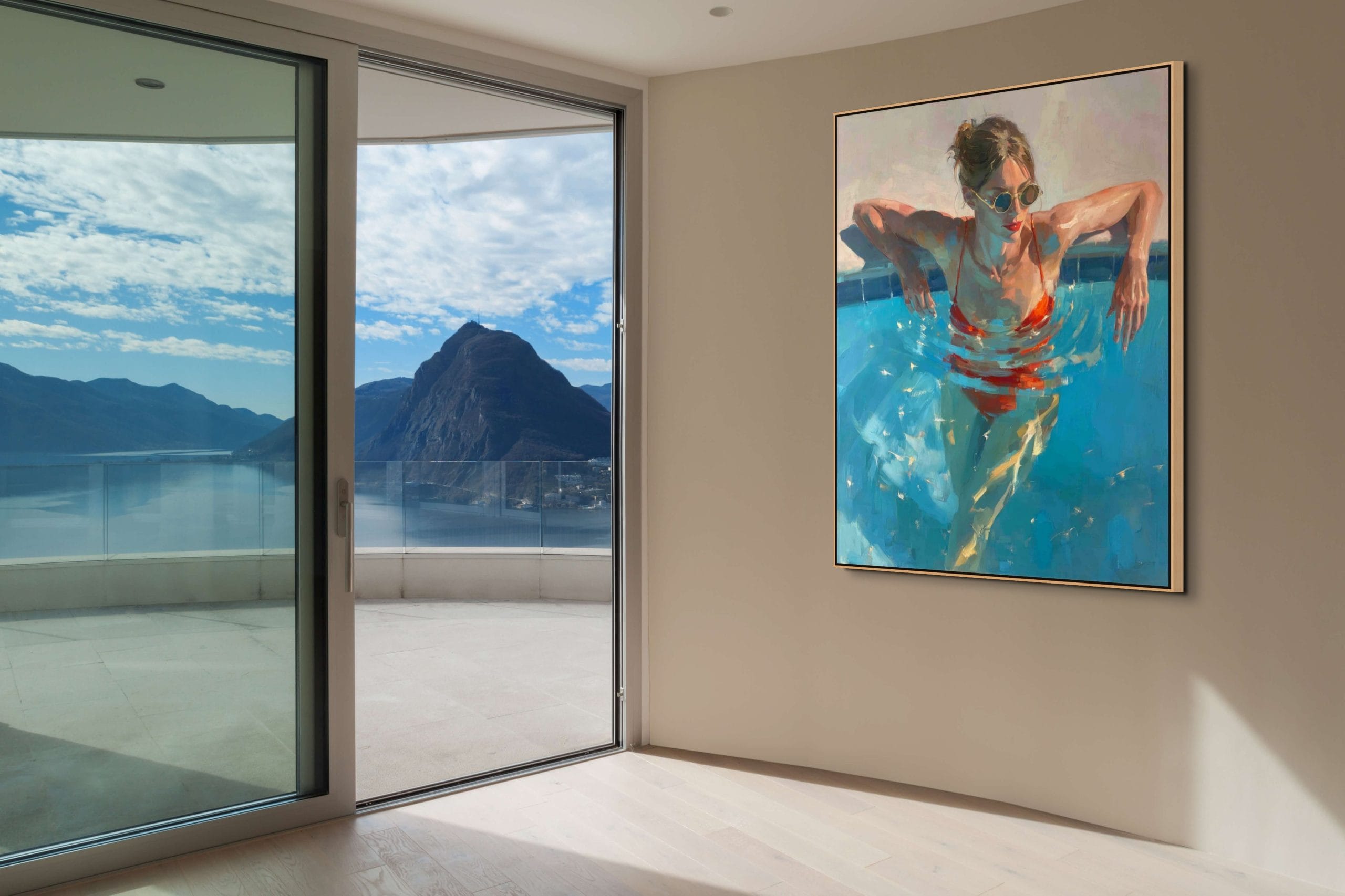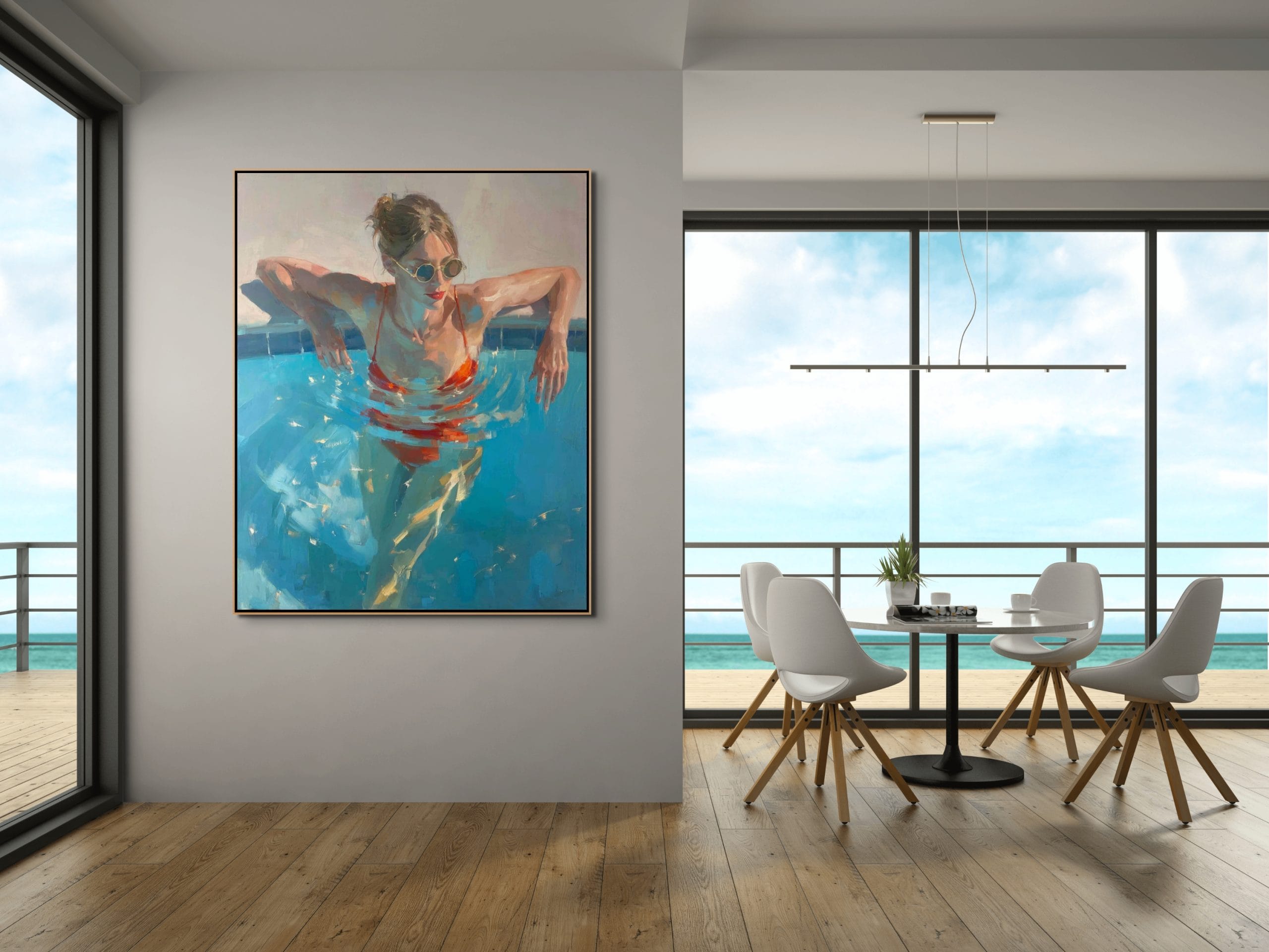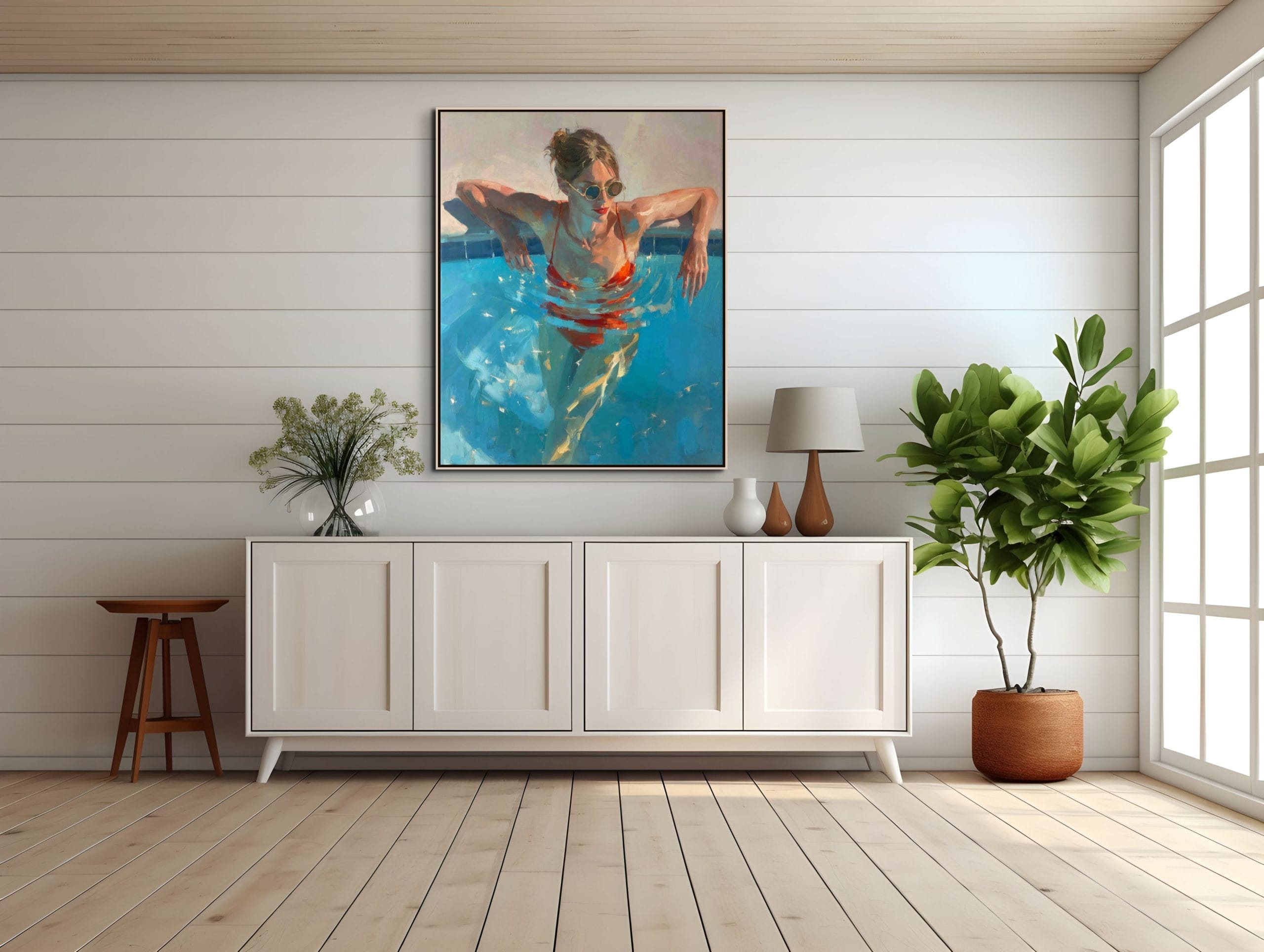 Letní ochlazení představuje dynamickou scénu ženy ponořené do tyrkysové vody bazénu. Kompozice pracuje s kontrastem chladných modrých tónů a výrazné červené barvy plavek, která okamžitě přitahuje pozornost. Hladina vody vytváří pohybové kruhy a světelné odlesky, jež dodávají celé scéně autenticitu a přirozenou hloubku. Malba na zdi zde nepůsobí pouze dekorativně, ale přenáší do interiéru atmosféru skutečného letního dne.