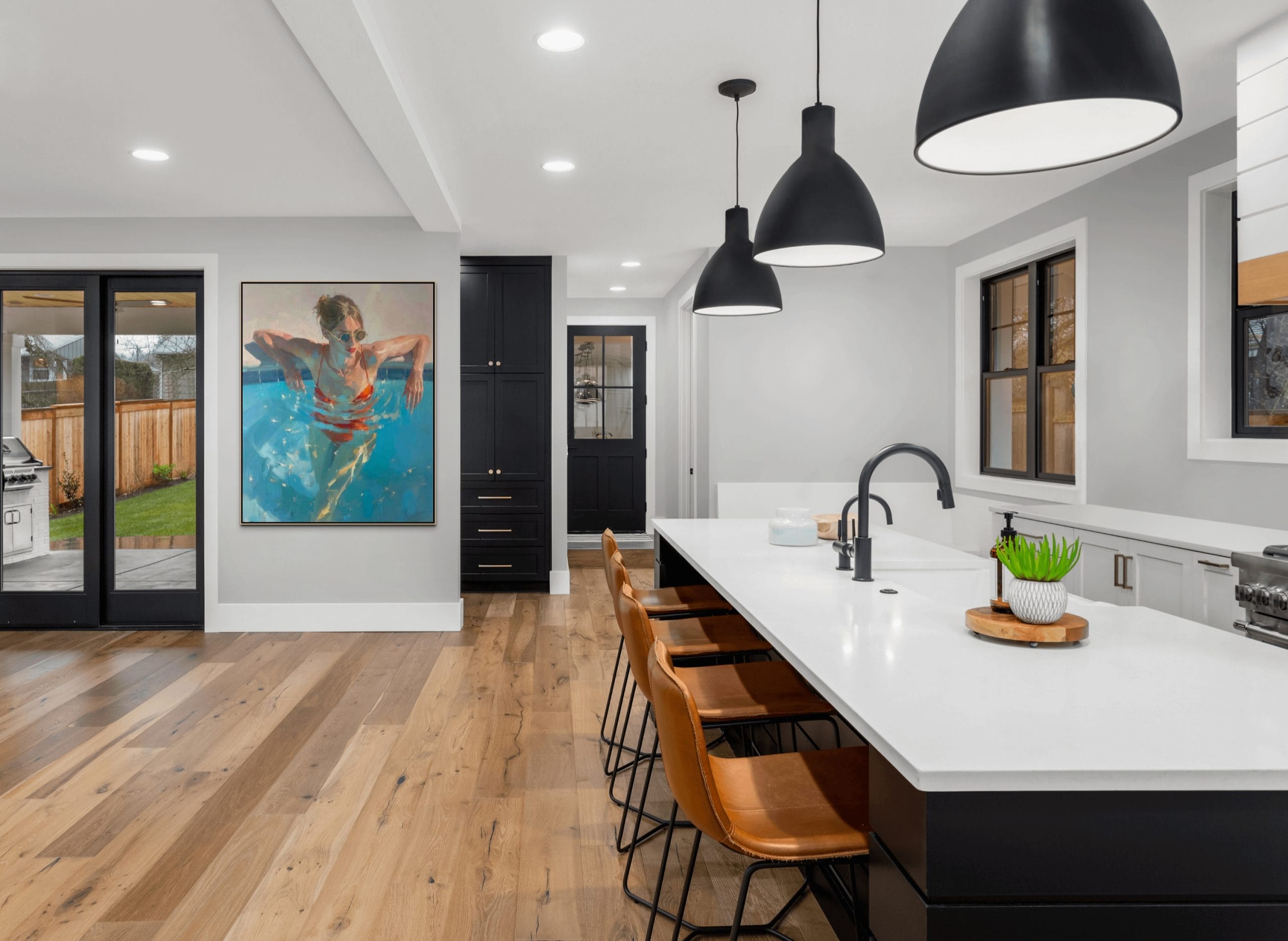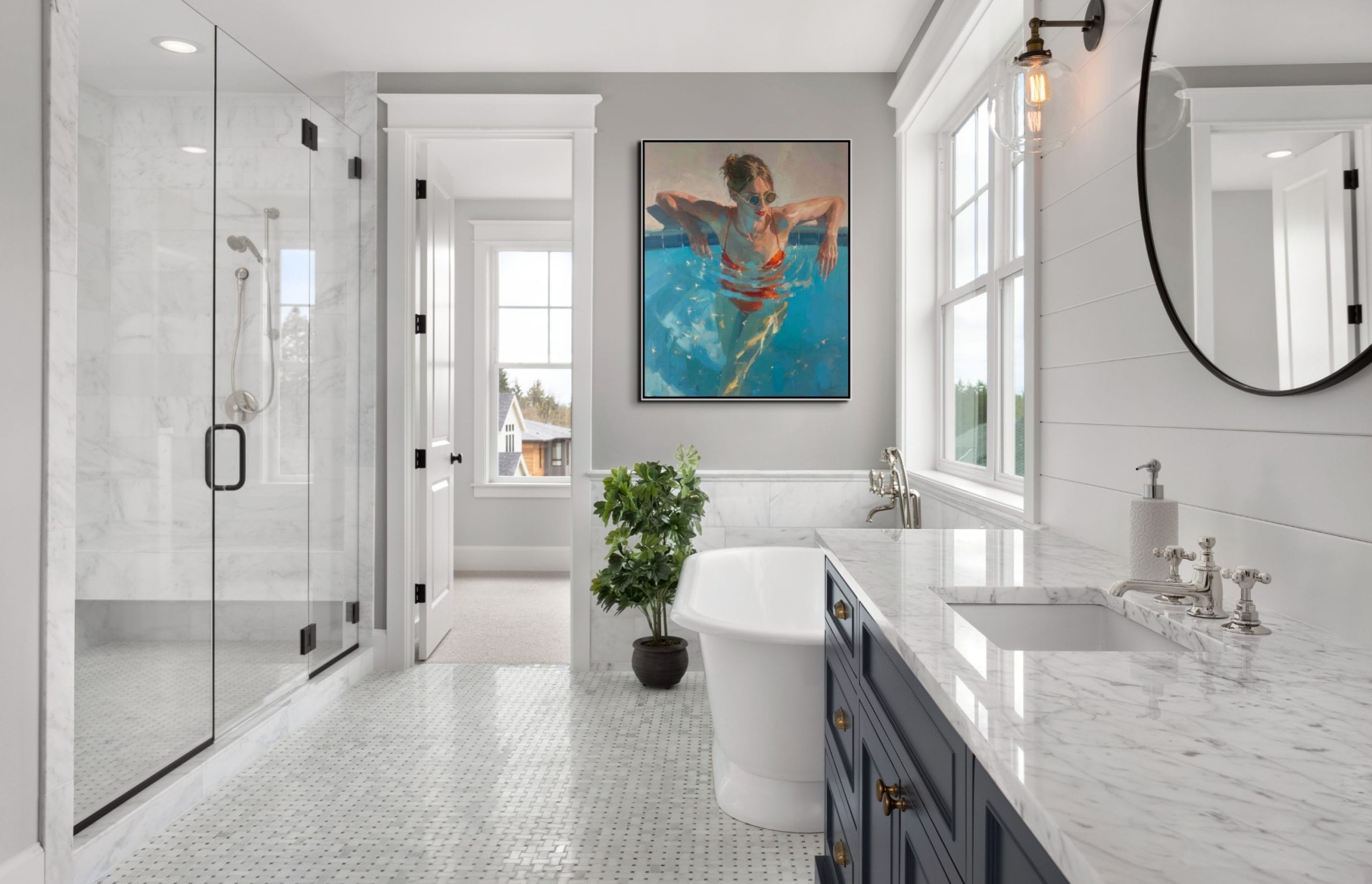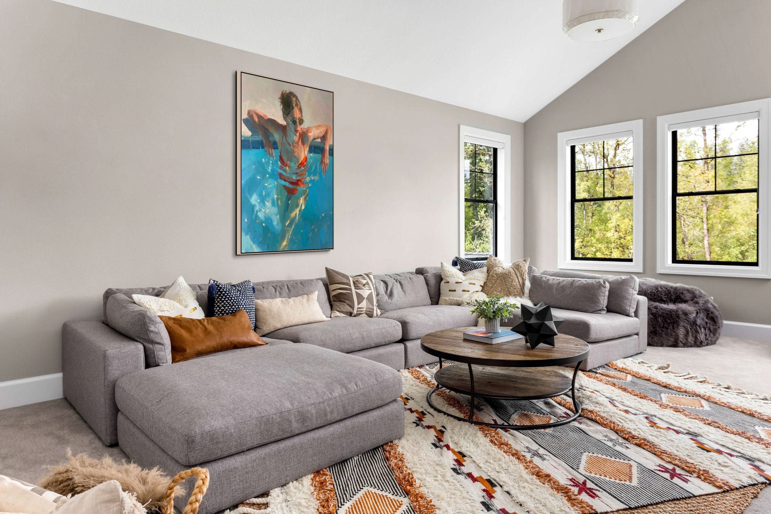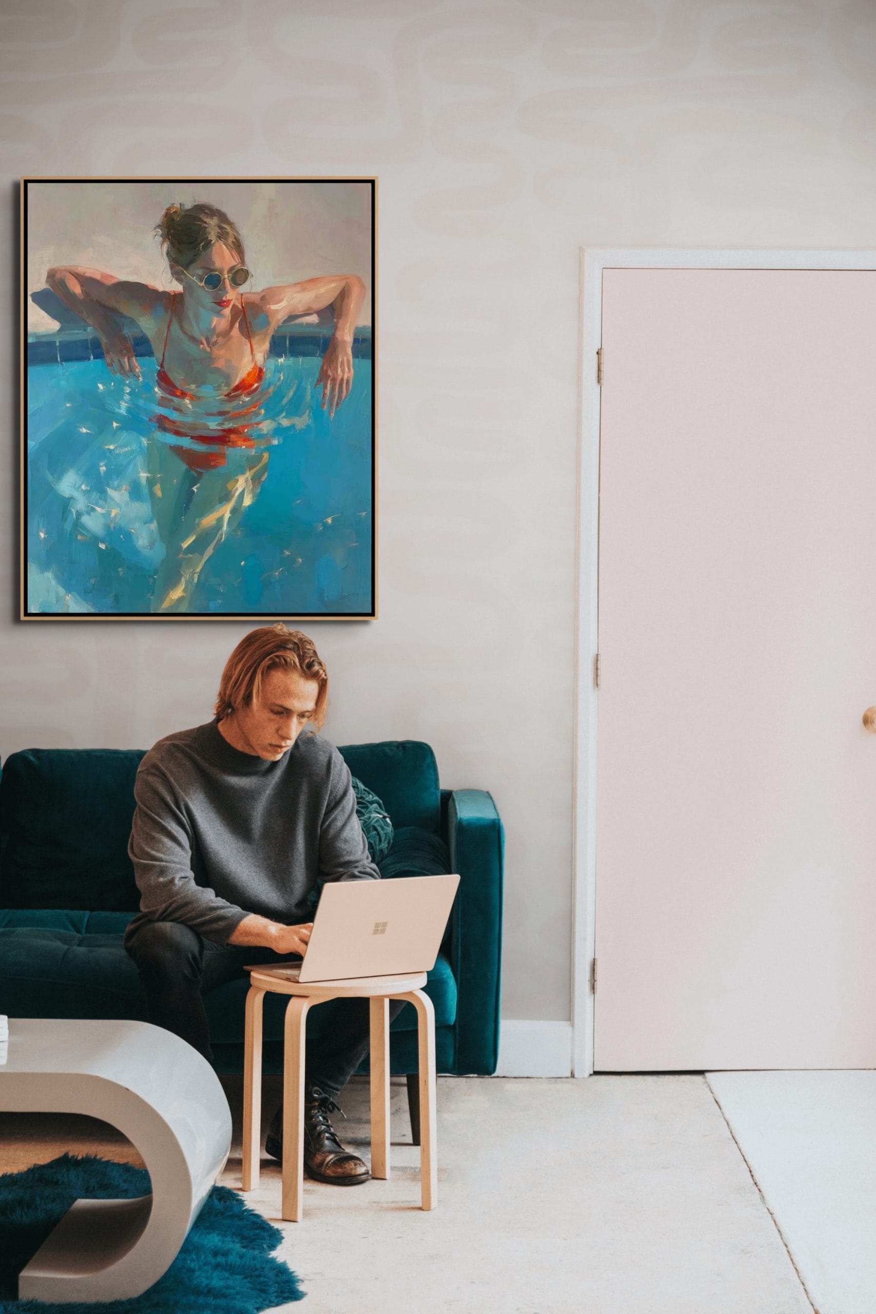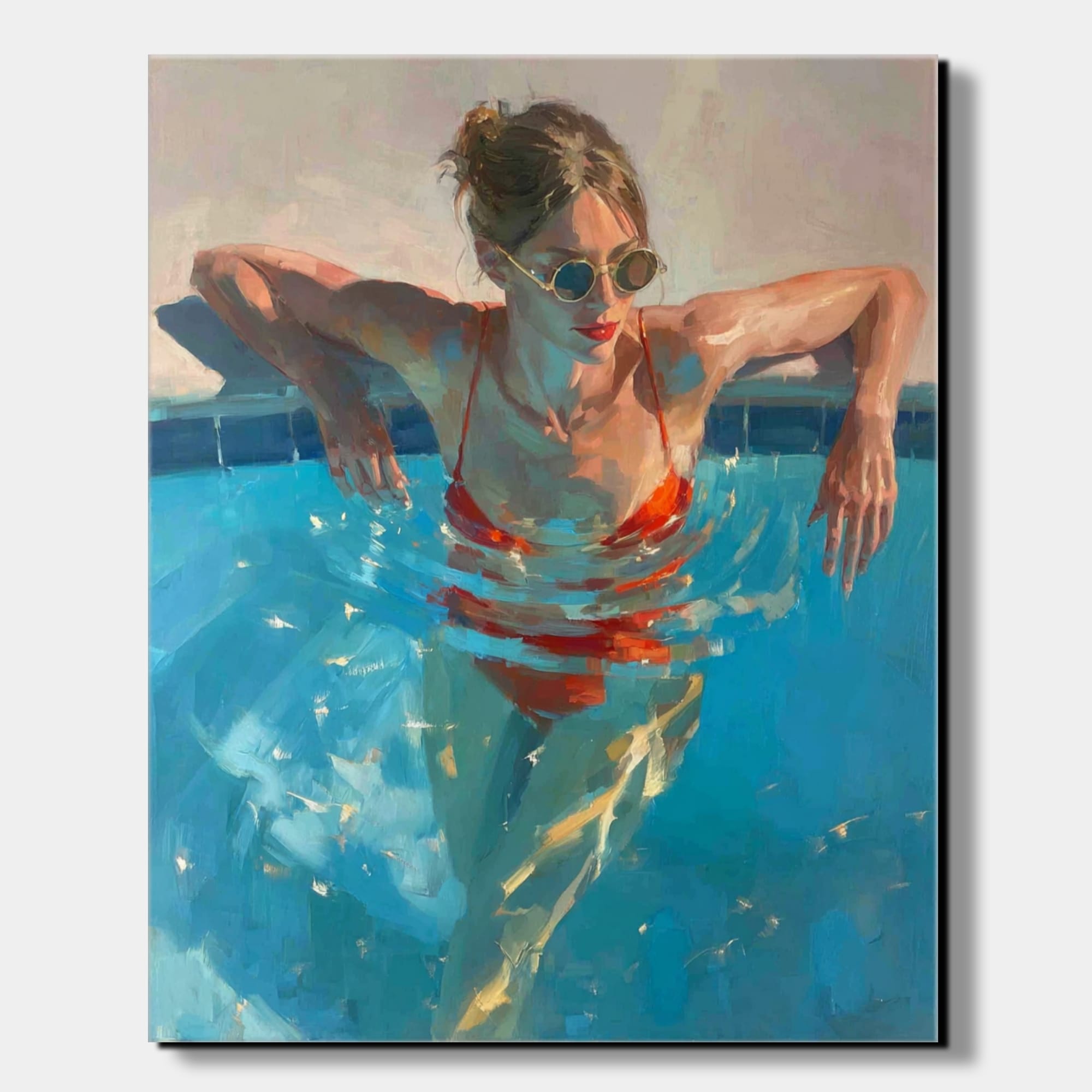 Letní ochlazení představuje dynamickou scénu ženy ponořené do tyrkysové vody bazénu. Kompozice pracuje s kontrastem chladných modrých tónů a výrazné červené barvy plavek, která okamžitě přitahuje pozornost. Hladina vody vytváří pohybové kruhy a světelné odlesky, jež dodávají celé scéně autenticitu a přirozenou hloubku. Malba na zdi zde nepůsobí pouze dekorativně, ale přenáší do interiéru atmosféru skutečného letního dne.