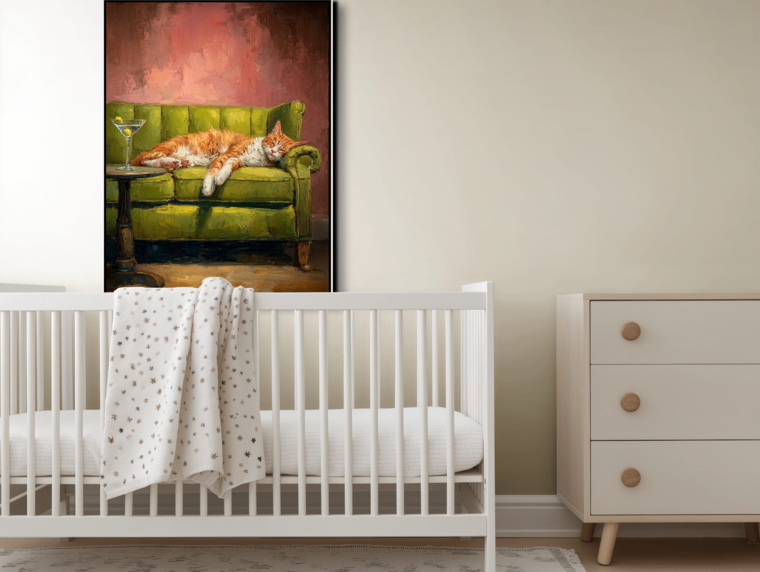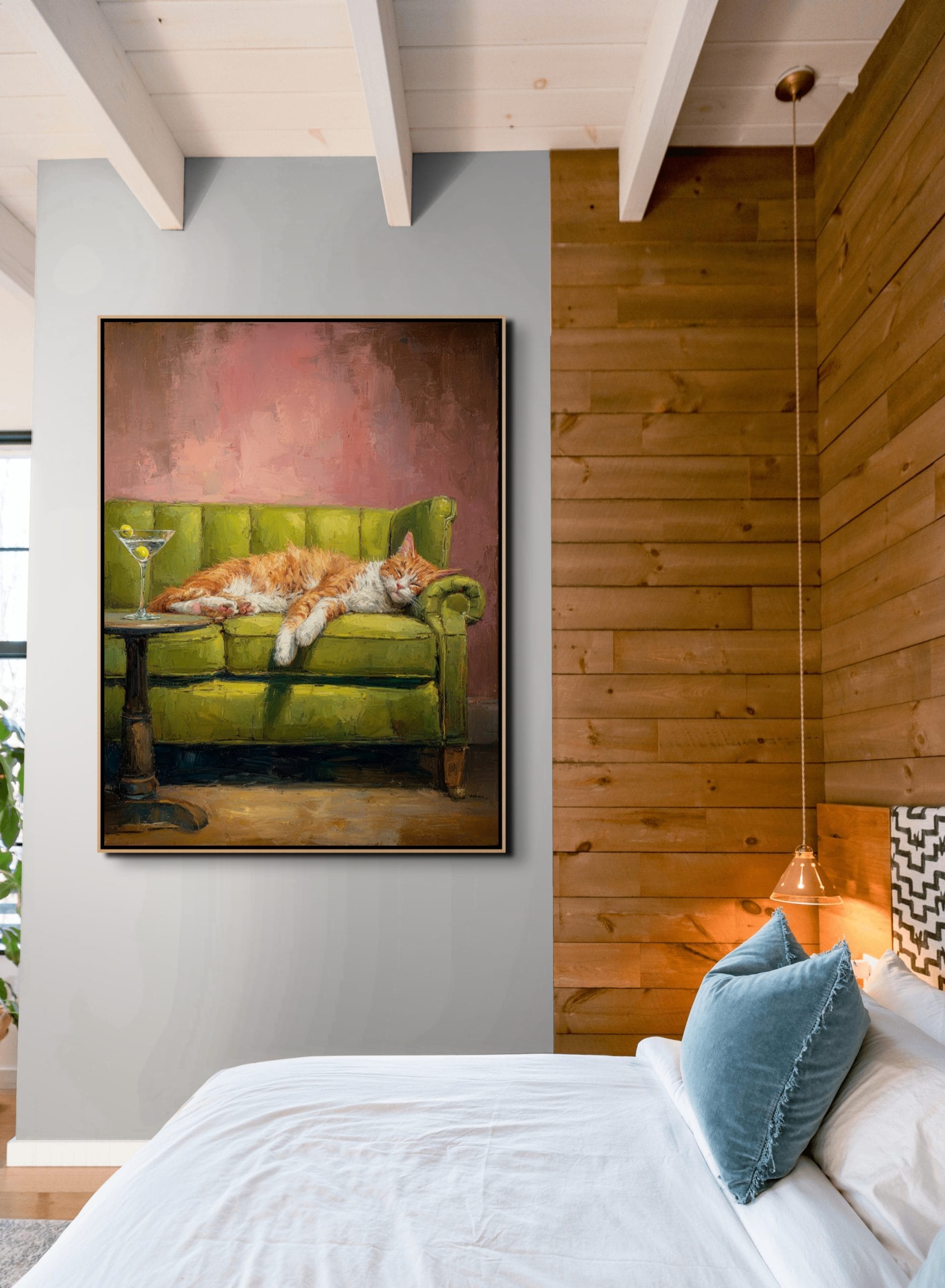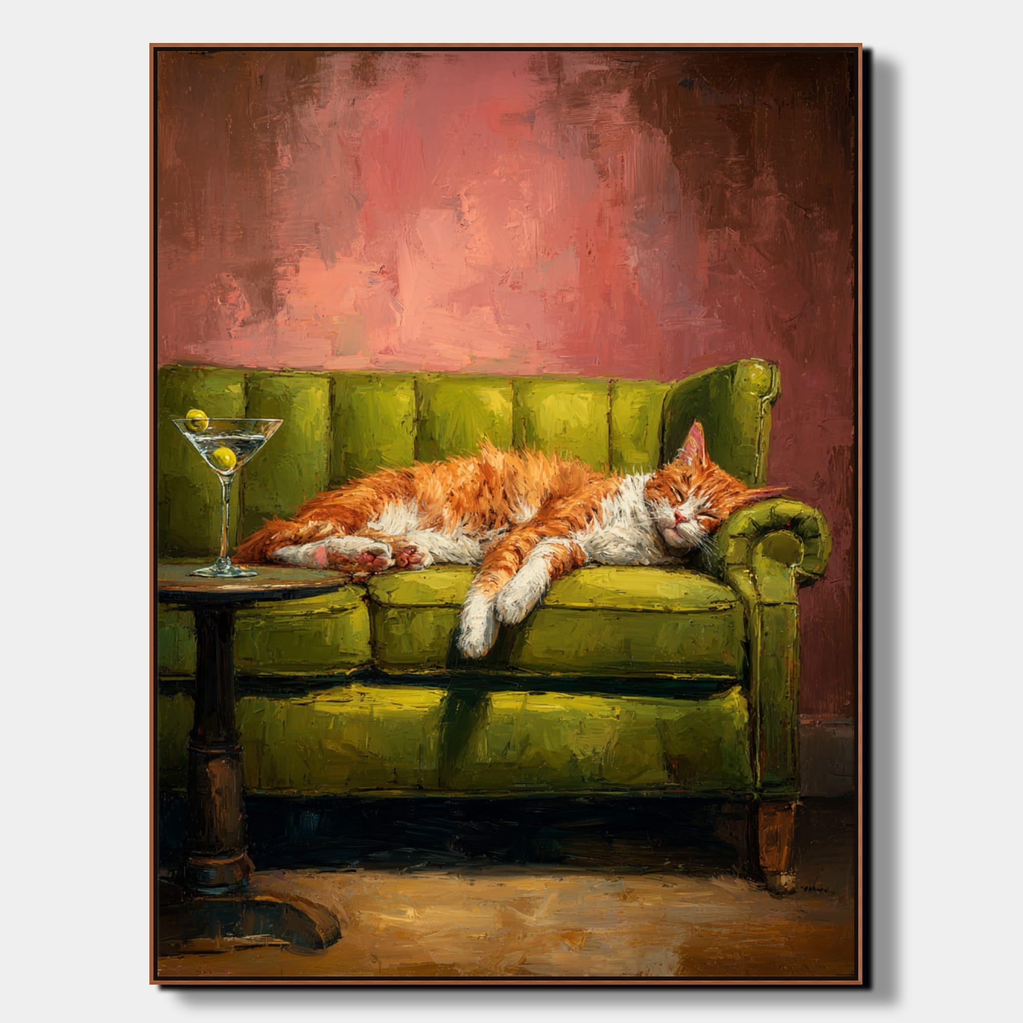 Kočičí siesta ukazuje, jak mohou malované obrazy koček působit hřejivě a zároveň elegantně. Zrzavý kocour se uvolněně rozvaluje na zelené pohovce a celé scéně dominuje příjemný kontrast teplých oranžových tónů s tlumenou zelení. Hrubší textura a viditelné tahy štětce dodávají obrazu živost, aniž by ztratil klidný charakter. Malý stolek se sklenkou a jemné světlo v pozadí vytvářejí atmosféru pohodového večera.