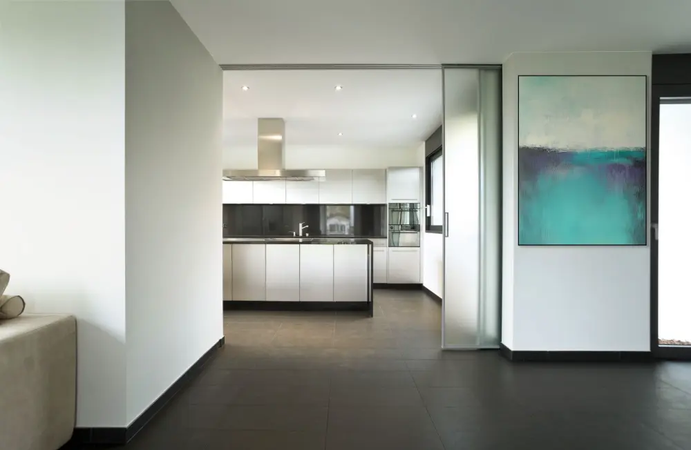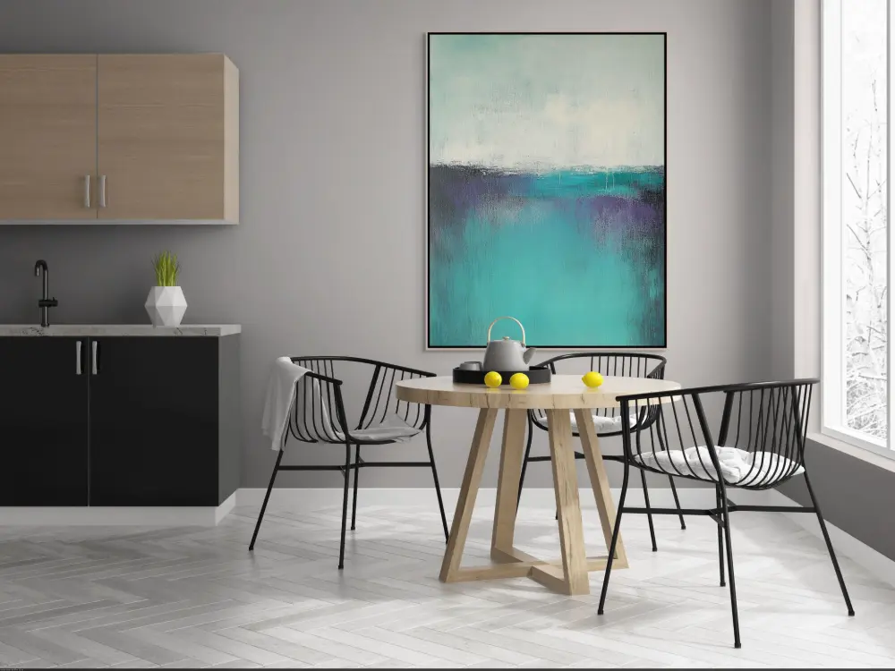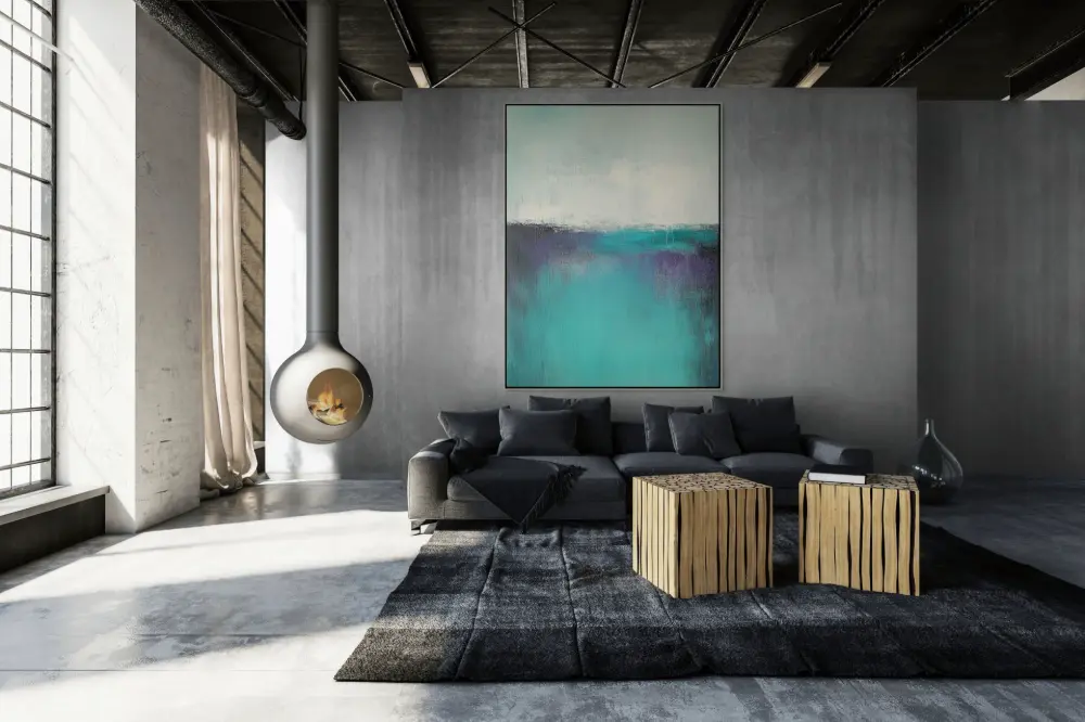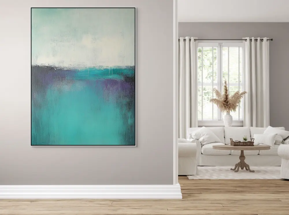 Ručně malovaná struktura působí záměrně rozostřeně, což umožňuje divákovi vnímat prostor podle vlastních emocí. Obraz se skvěle hodí do moderních interiérů, zejména tam, kde je cílem navodit klidnou atmosféru bez rušivých prvků. Jeho svislý formát navíc opticky prodlužuje stěnu a díky studeným odstínům působí jako vizuální osvěžení prostoru. Ideální pro obývací pokoj, chodbu nebo klidové zóny.