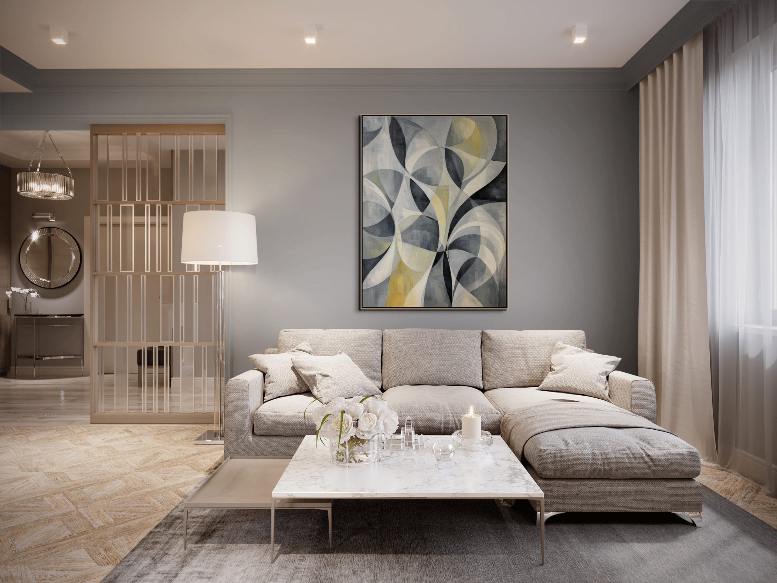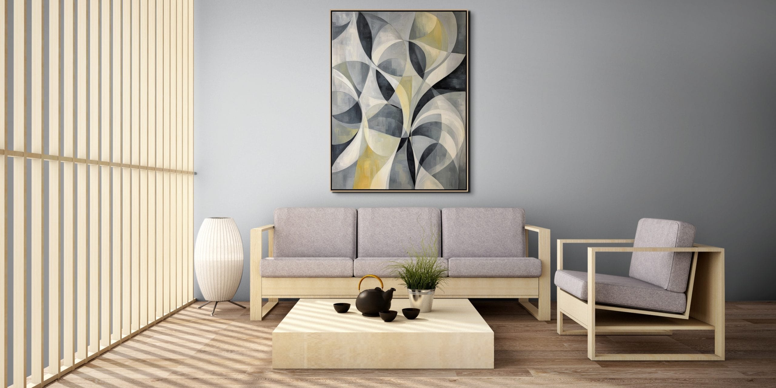 Moderní abstraktní umění se v tomto díle projevuje důrazem na formu, rytmus a harmonii bez konkrétního námětu. Obraz nepracuje s popisem reality, ale s vnitřním řádem a vizuální rovnováhou. Tlumená barevnost podporuje soustředěnou atmosféru a nechává vyniknout samotnou stavbu tvarů.