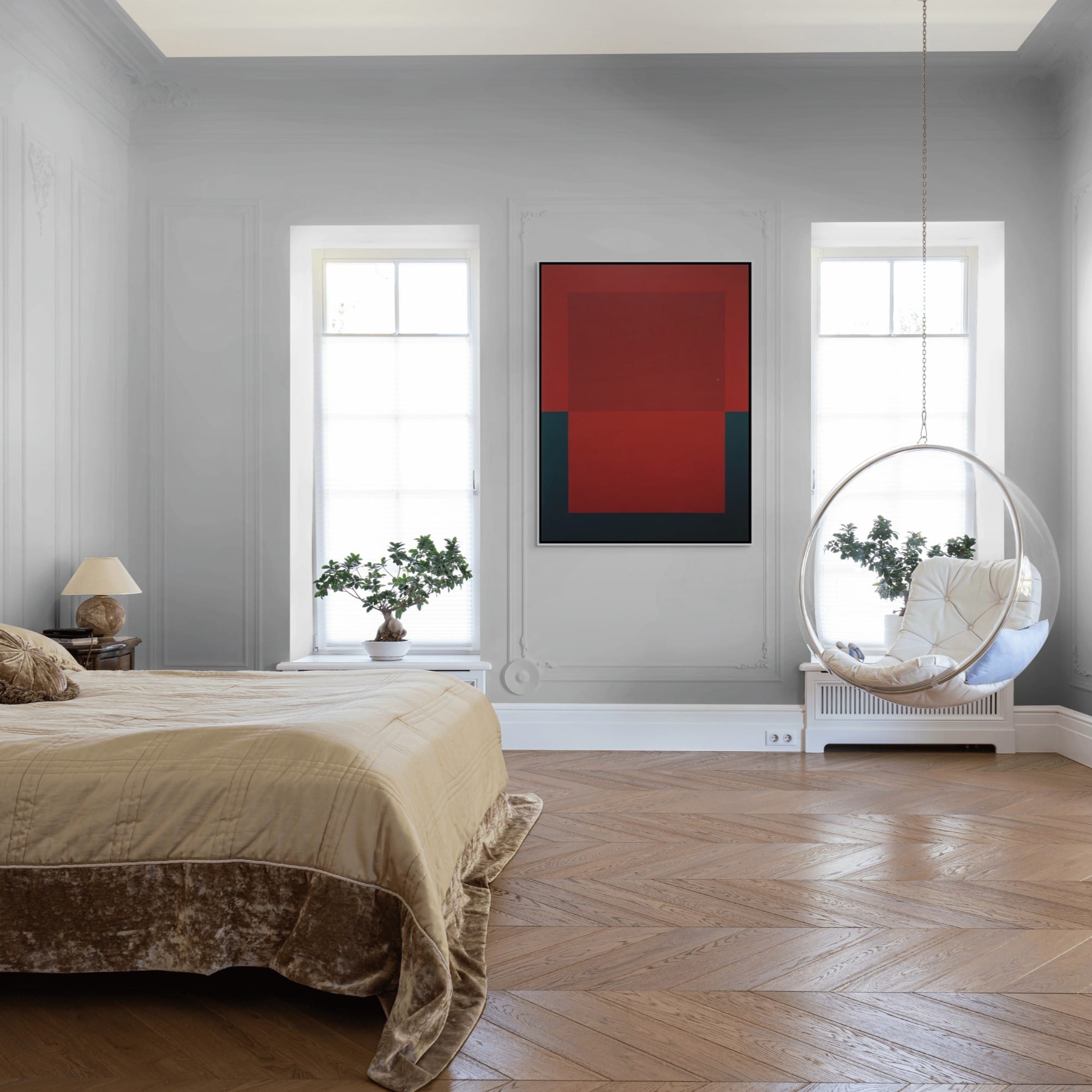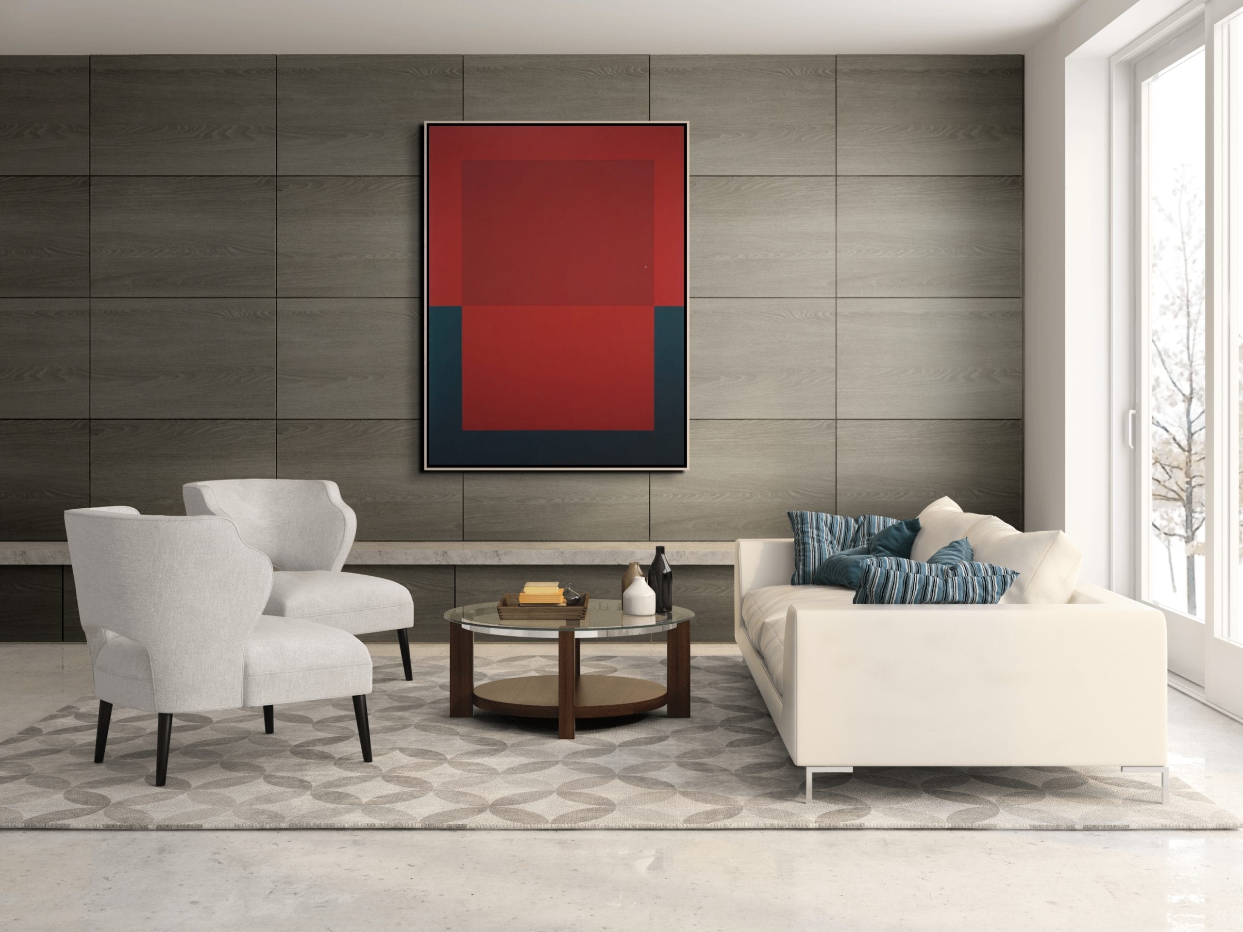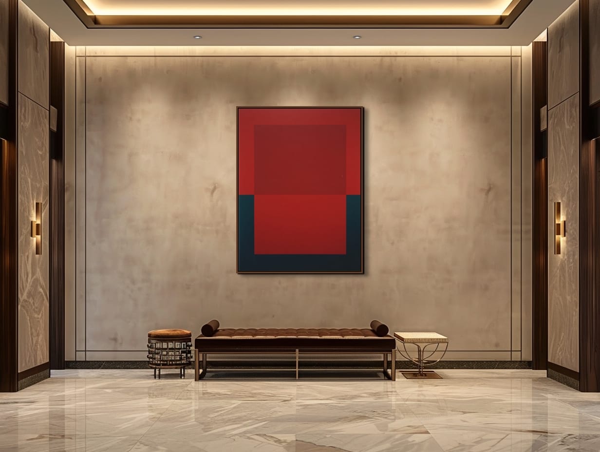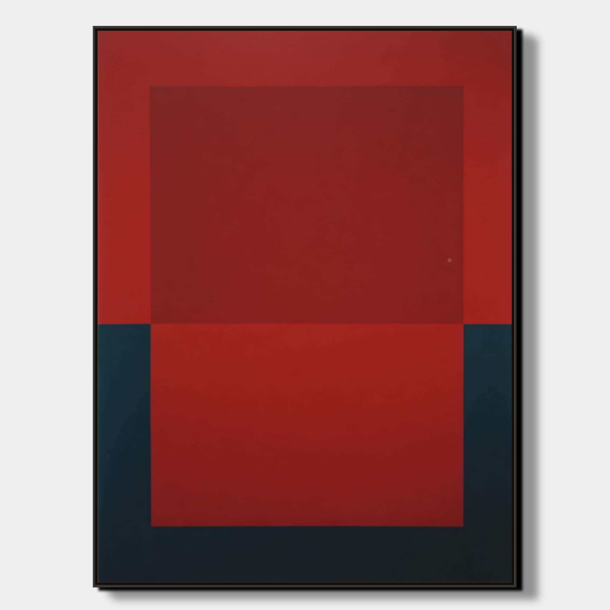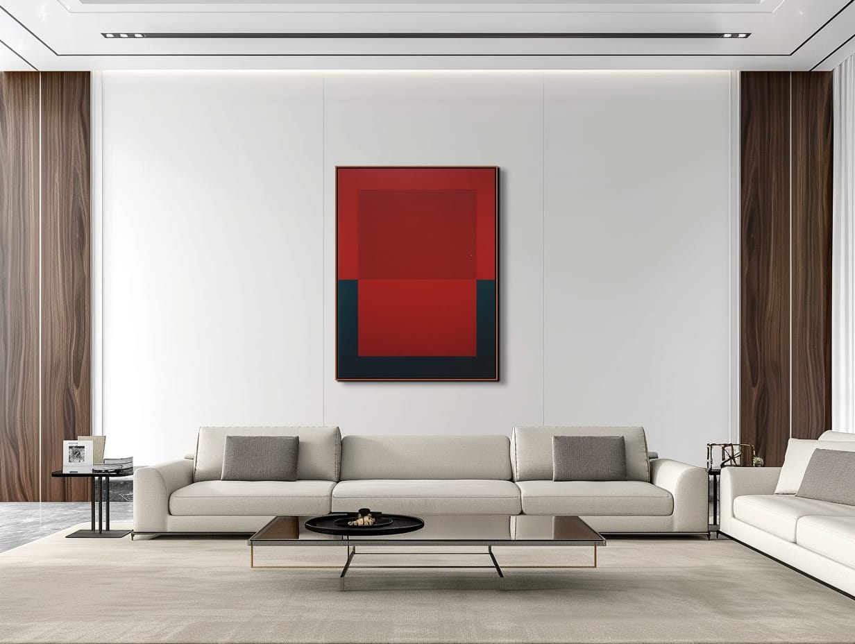 Barevnost obrazu je založena na kontrastu syté červené a hlubokých tmavých tónů. Červená plocha působí energicky a dynamicky, zatímco tmavé prvky v dolní části obrazu vytvářejí stabilní základ kompozice. Díky jednoduché geometrické struktuře obraz působí současně klidně i výrazně a dokáže se stát dominantním vizuálním prvkem moderního interiéru.