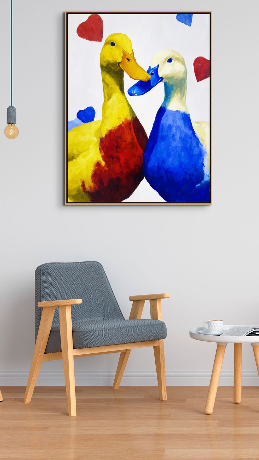 Moderní obraz husy s názvem Husí pochod přináší do interiéru neobyčejný vizuální zážitek postavený na sytých odstínech a hravé pop-artové kompozici. Ústřední dvojice hus, zachycená v originálním kontrastu žluté a modré, dominuje čistému bílému pozadí, které dává naplno vyniknout každému tahu štětce. Symboly srdcí vznášející se v prostoru podtrhují radostný podtón díla a dělají z něj ideální doplněk pro moderní obývací pokoje, prosvětlené haly nebo stylové kuchyně. Tento moderní obraz husy funguje jako nositel pozitivní energie, která okamžitě osvěží atmosféru celého prostoru.