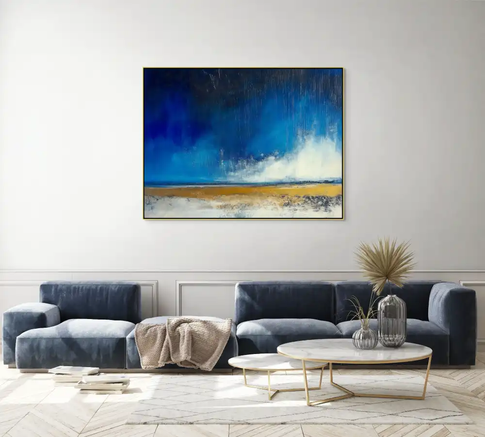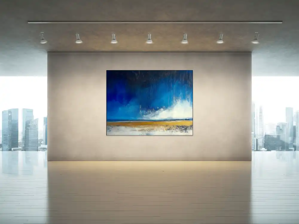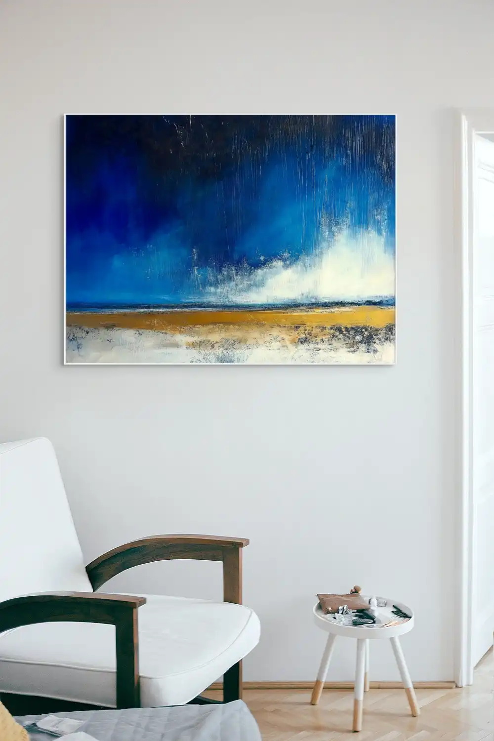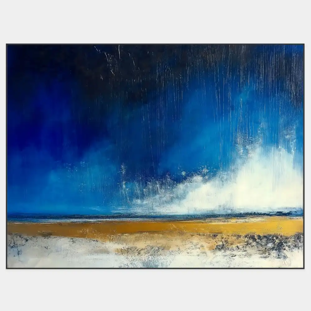 Abstraktní obraz zachycuje stylizovanou krajinu s temnou oblohou a pískovými přechody. Modré tóny postupně přecházejí od hluboké tmavě modré po světlejší odstíny, čímž vytvářejí silný vizuální dojem. Vertikální tahy štětcem a jemná struktura přinášejí do malby hloubku a dynamiku. Zlatavý pás země pak obraz jemně vyvažuje a dodává mu teplejší akcent.
