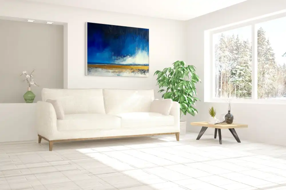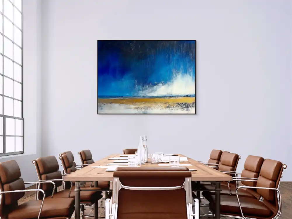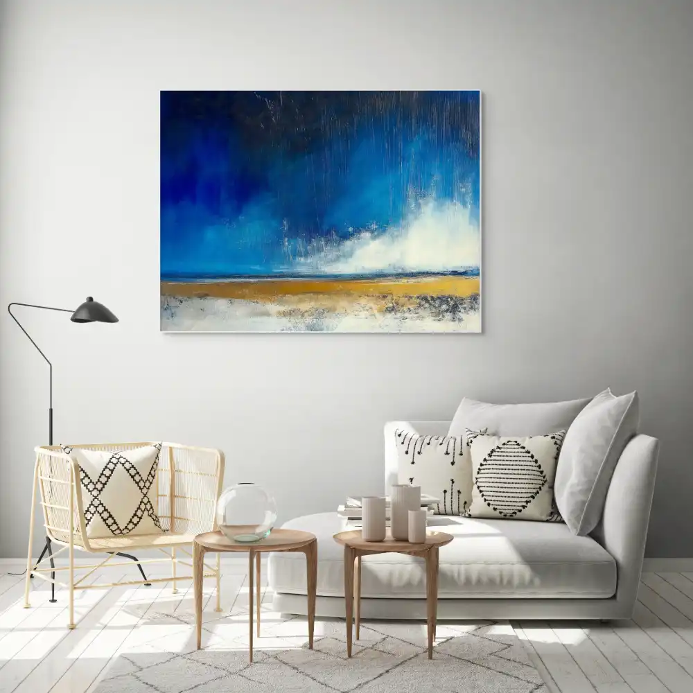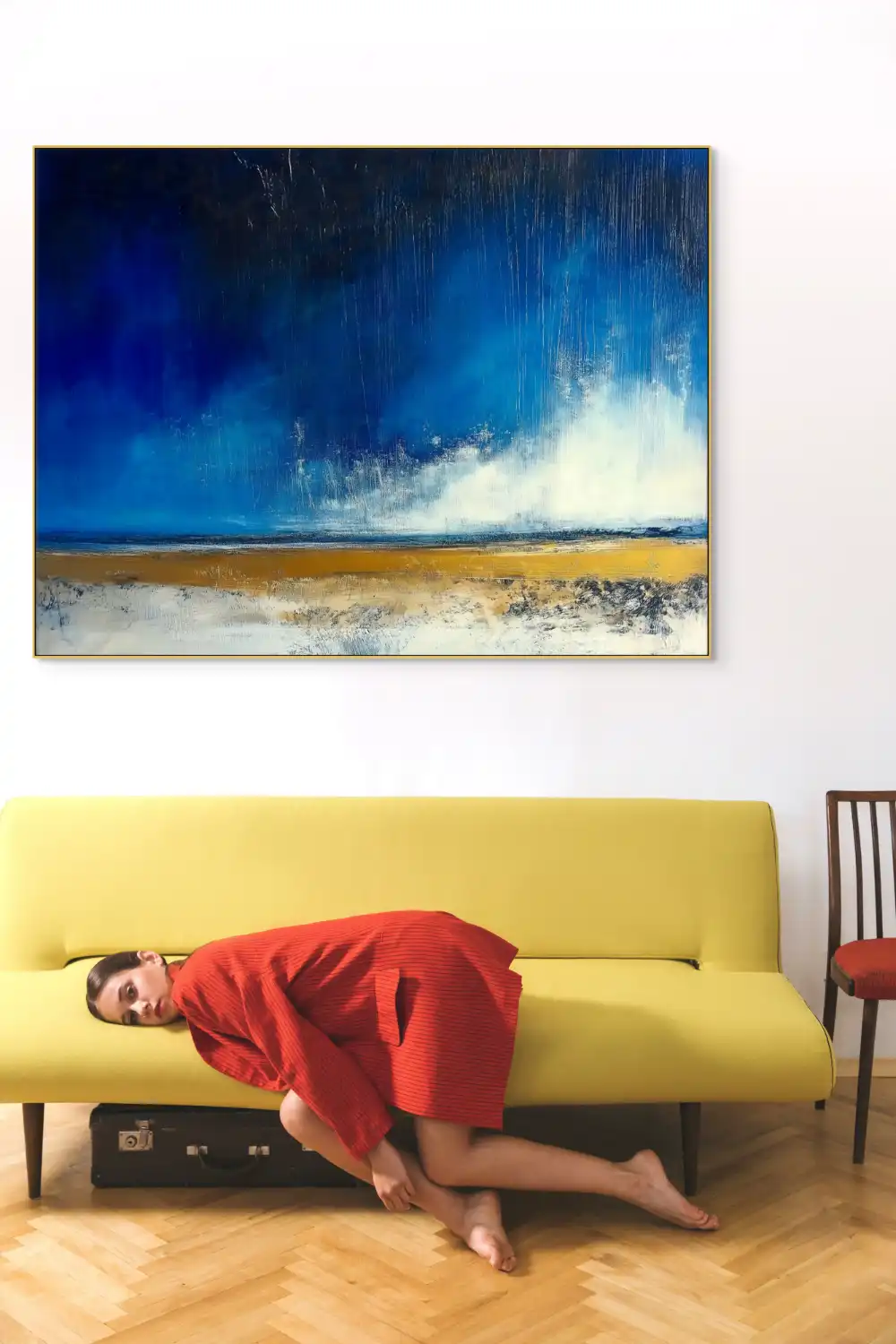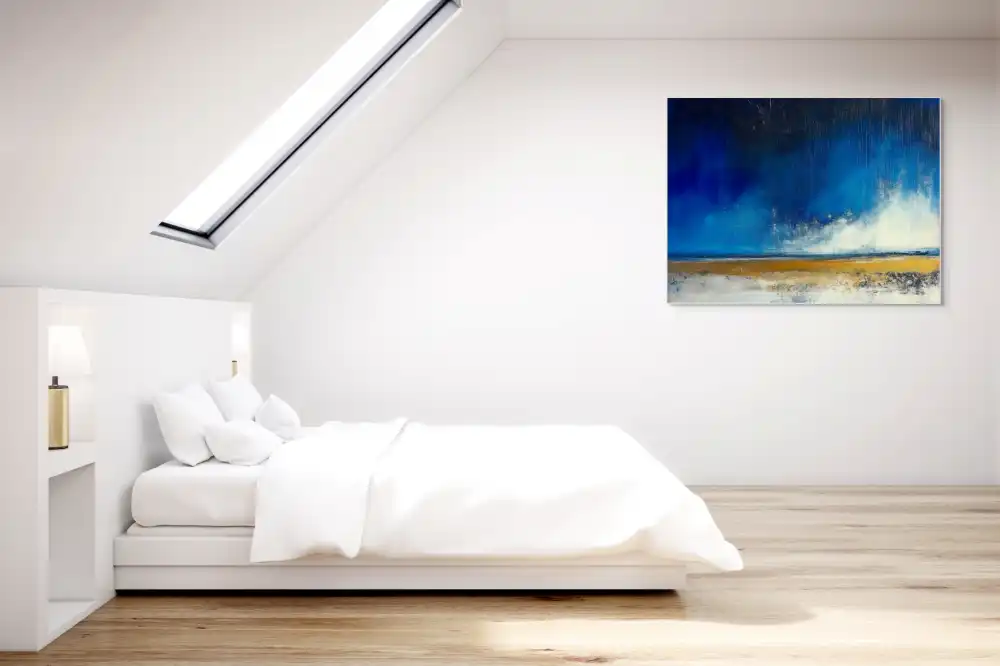 Tato moderní malba je ideální volbou pro ty, kdo hledají originální prvek do svého interiéru. Výrazné barevné kontrasty a napětí kompozice vyniknou zejména ve světlejších místnostech, kancelářích i reprezentativních prostorách. Díky uměleckému ztvárnění horizontu a oblohy působí malba energicky a zároveň harmonicky.