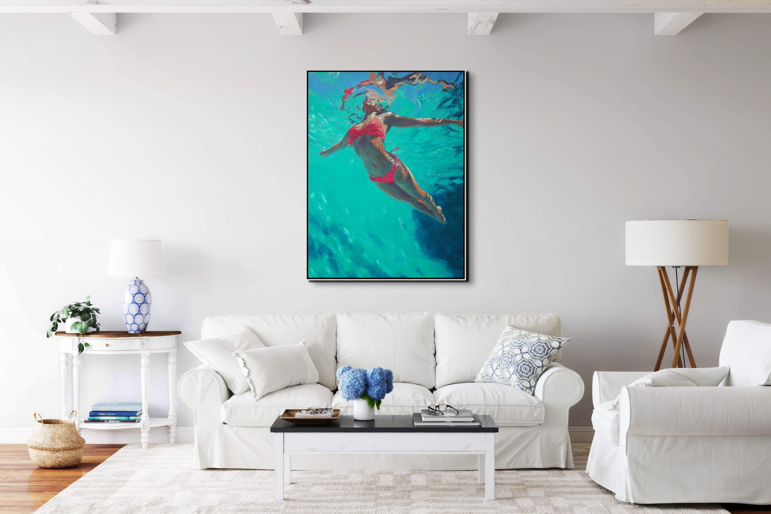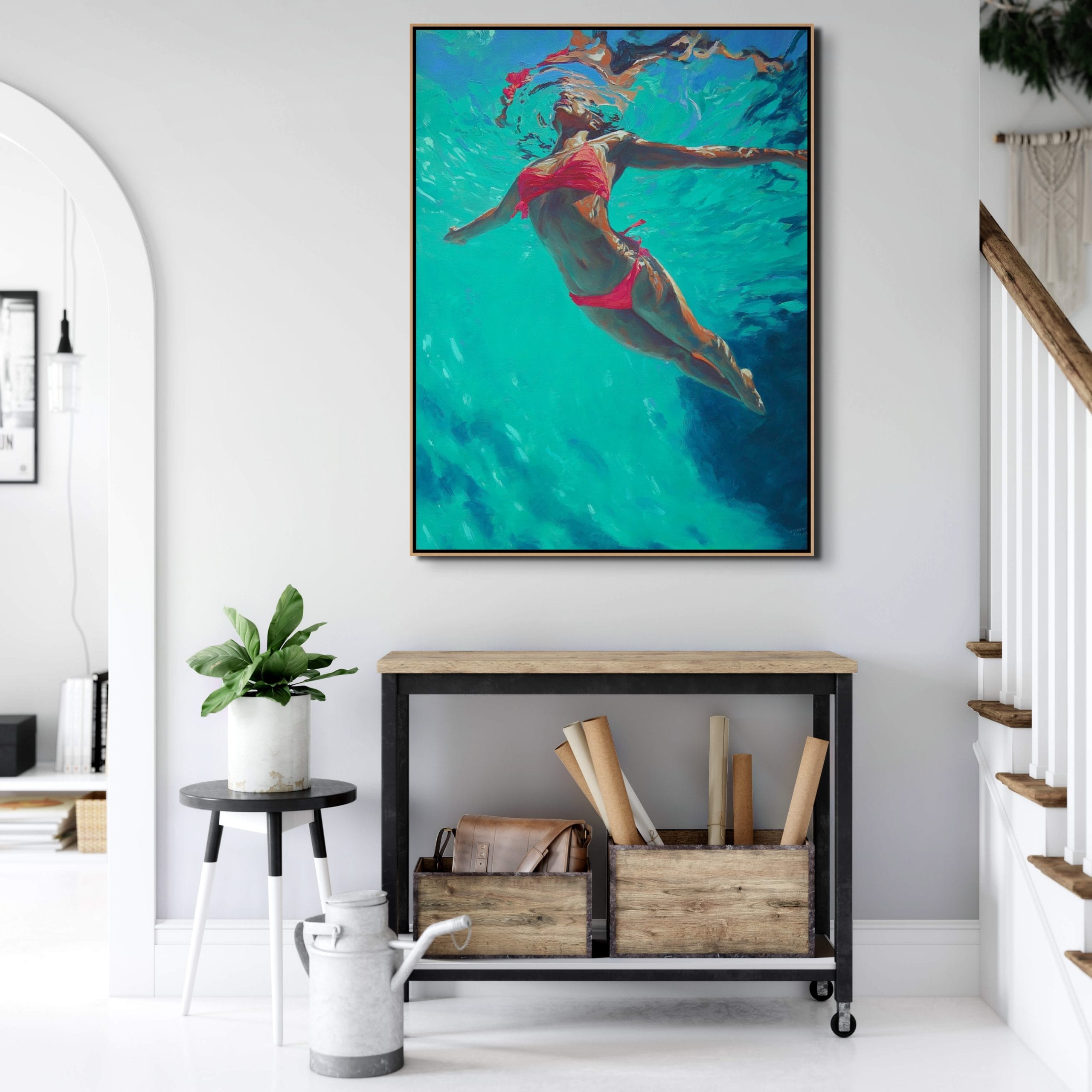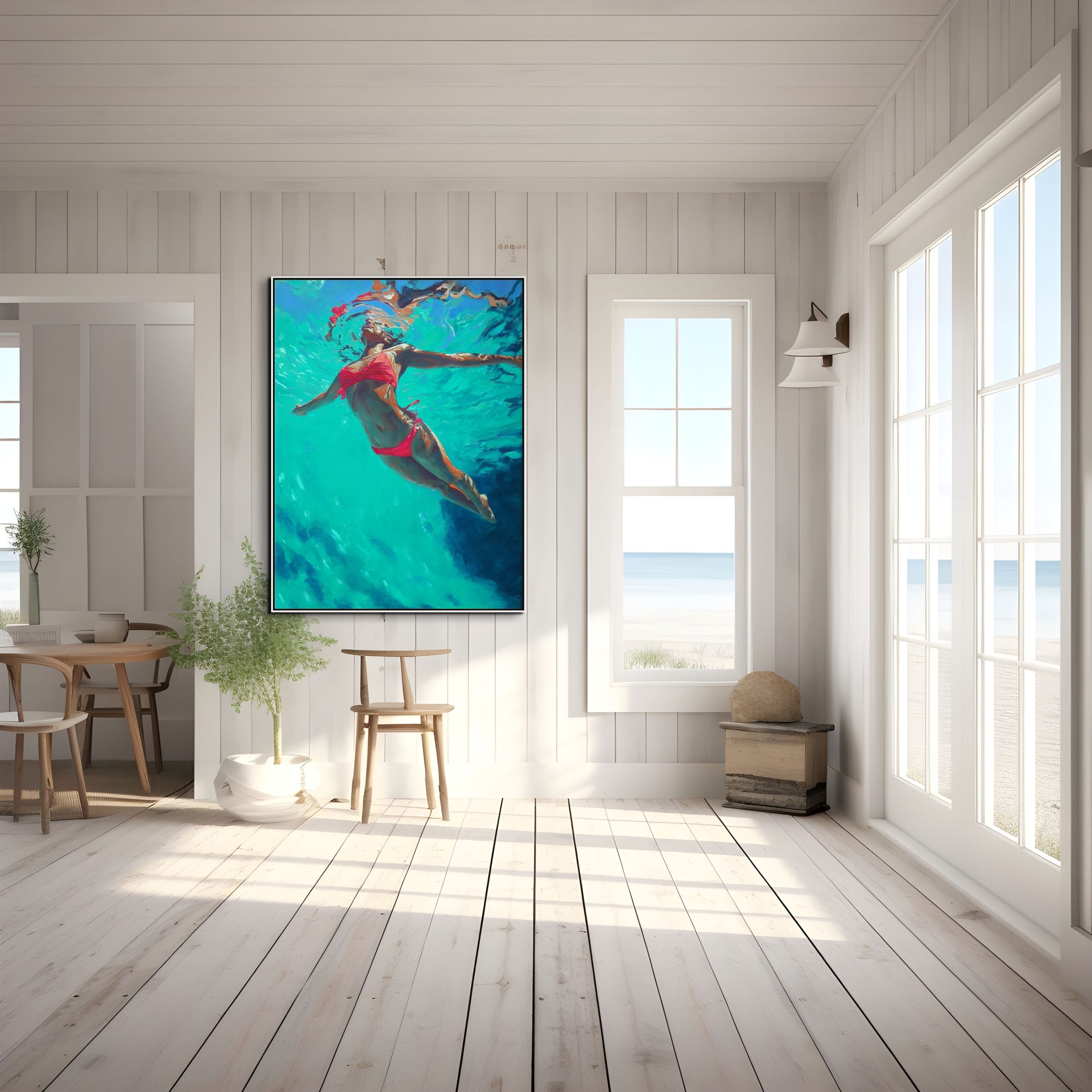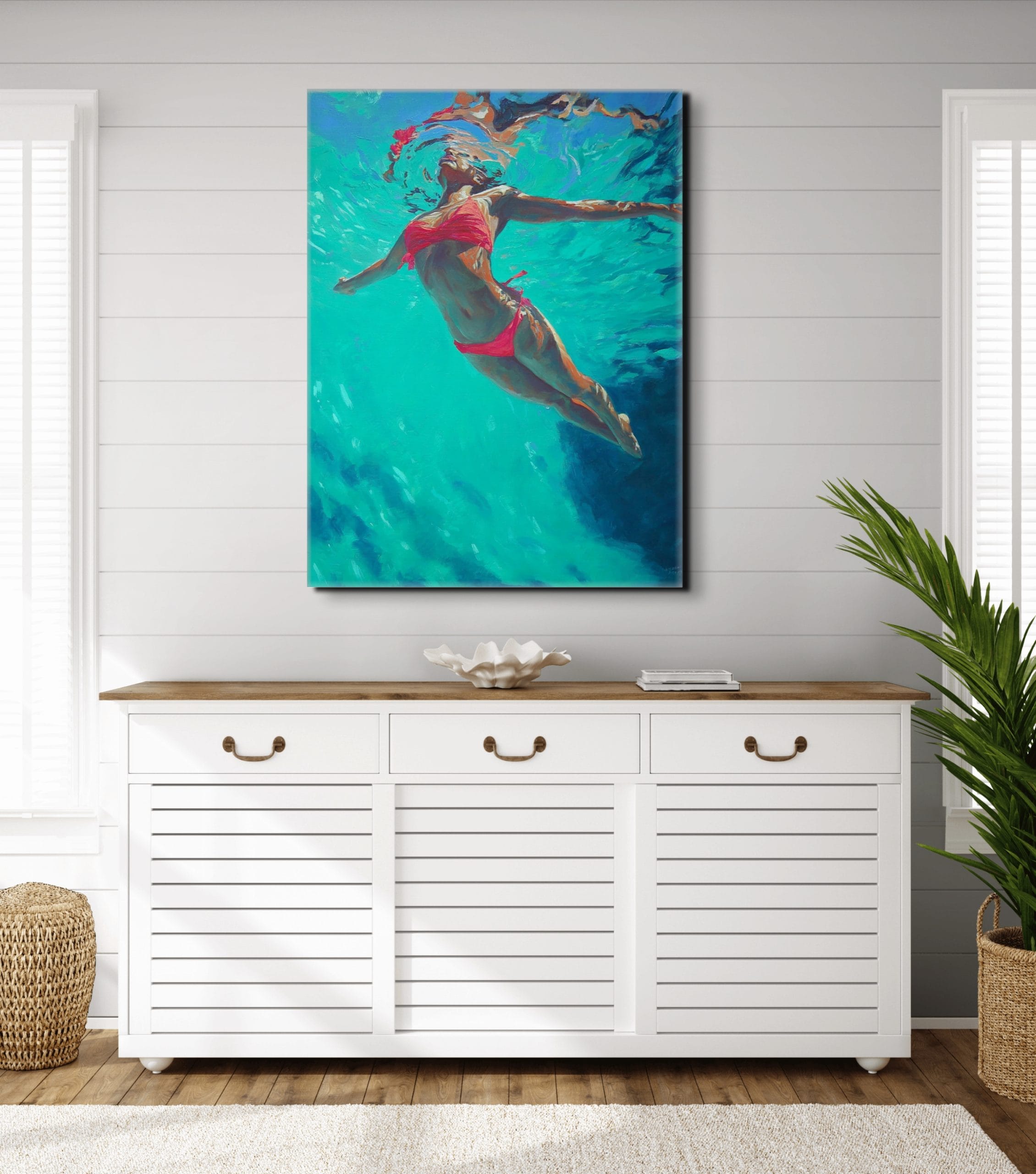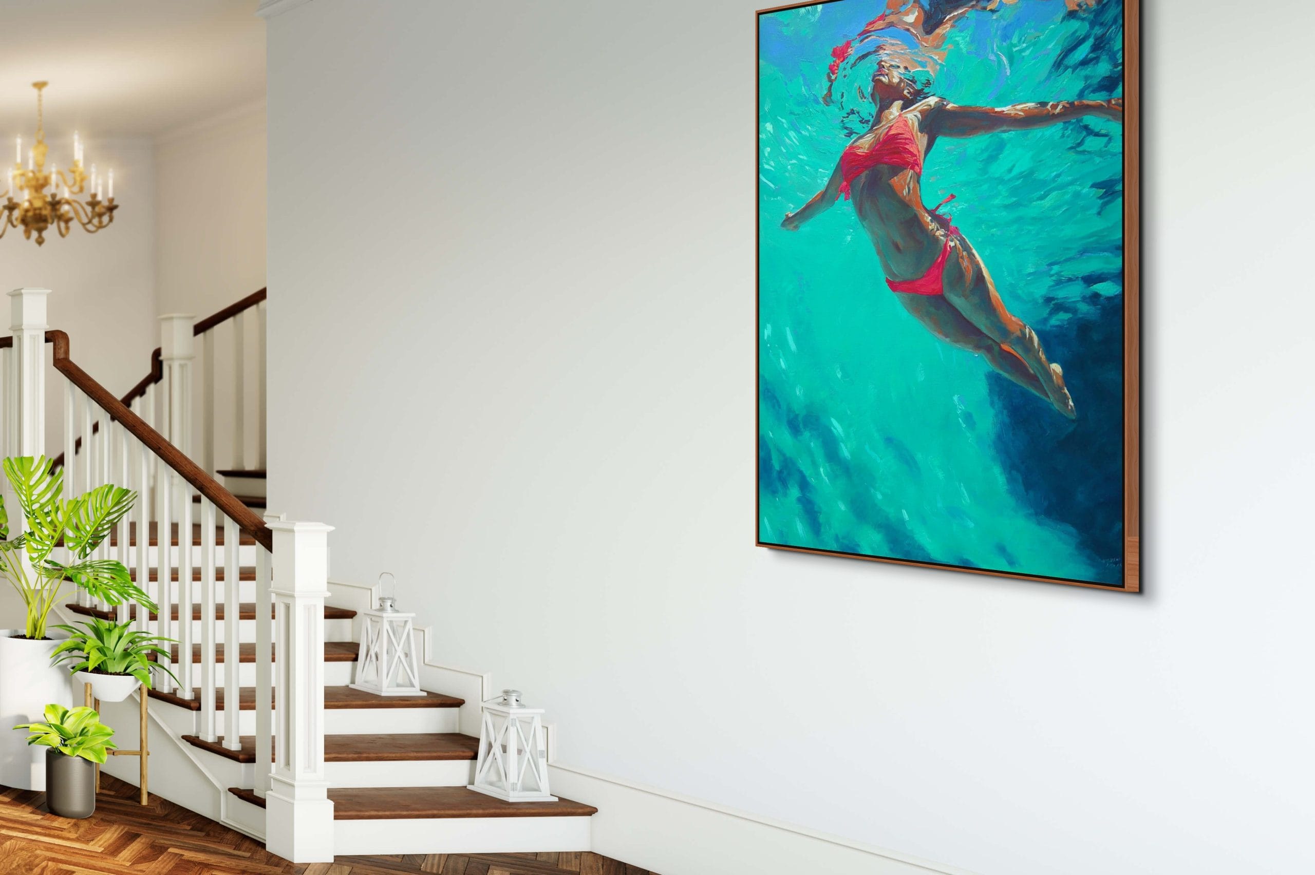 Barva, která vytváří hloubku. V tomto obraze není voda jen prostředím, ale hlavním nositelem atmosféry. Postava ženy se pohybuje pod hladinou, kde se světlo láme do tyrkysových a smaragdových tónů a vytváří téměř abstraktní strukturu proudění. Červený akcent plavek narušuje chladnou barevnost a dodává kompozici napětí i vizuální kontrast.