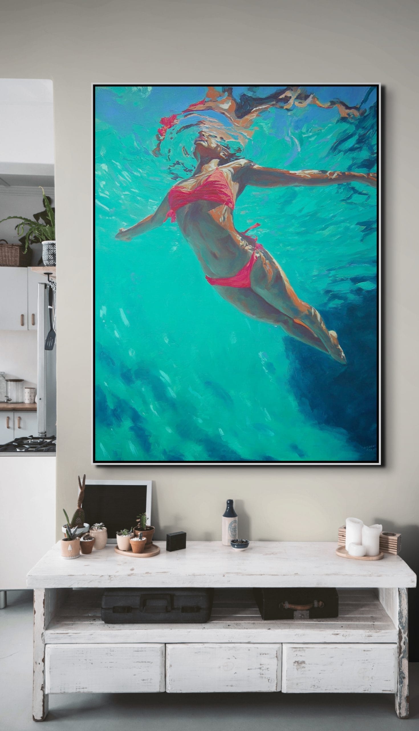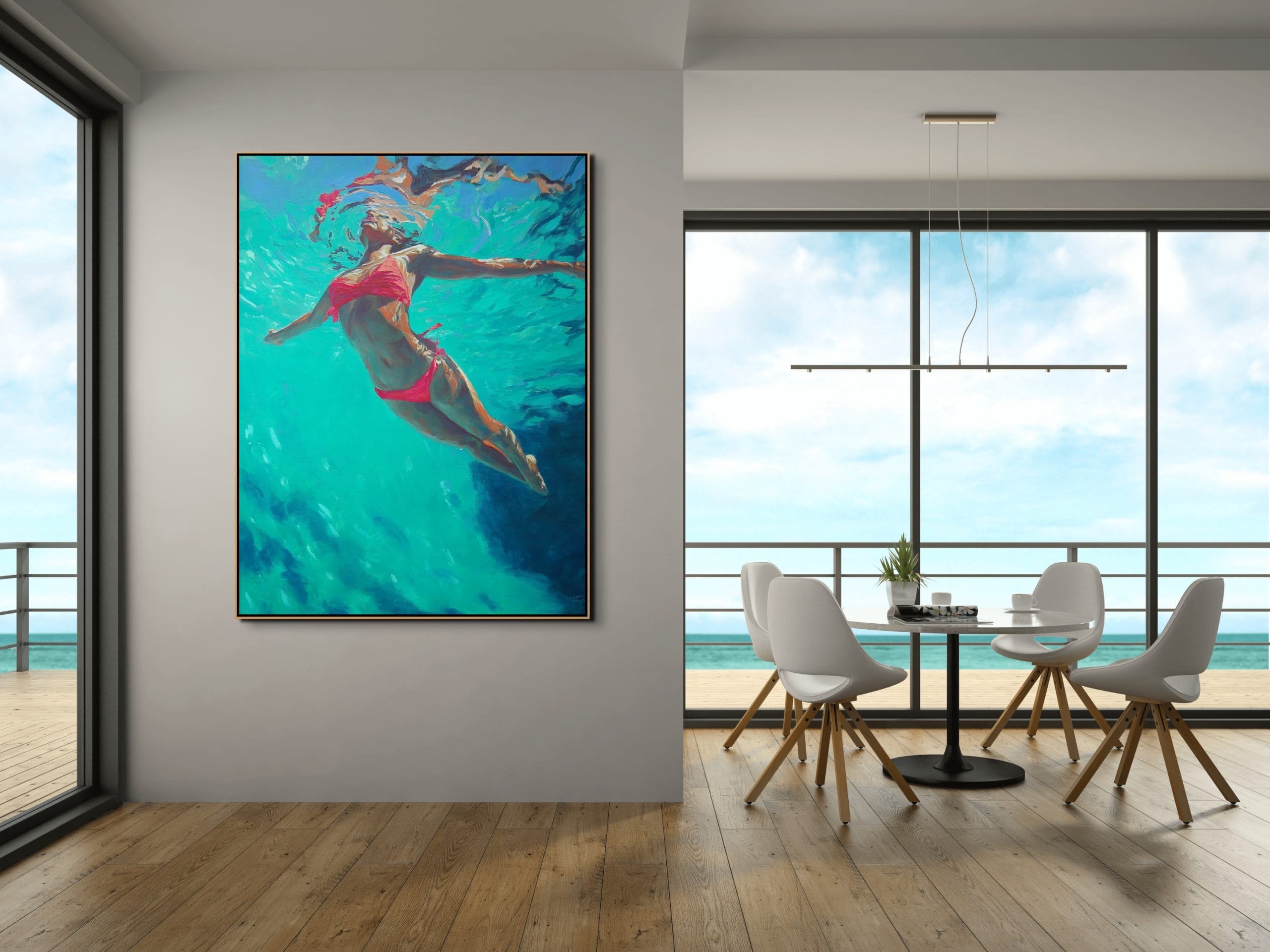 Originální obrazy prodej  – Dotek oceánu přináší podmořskou scénu s výrazným kontrastem tyrkysové vody a růžových plavek. Dynamická, přitom klidná malba pro moderní interiér.