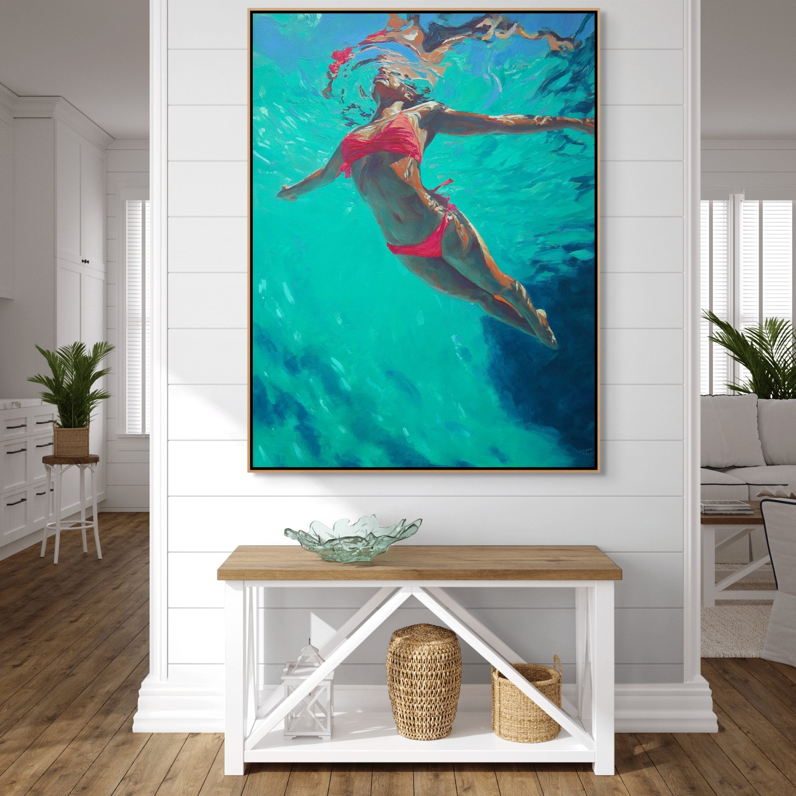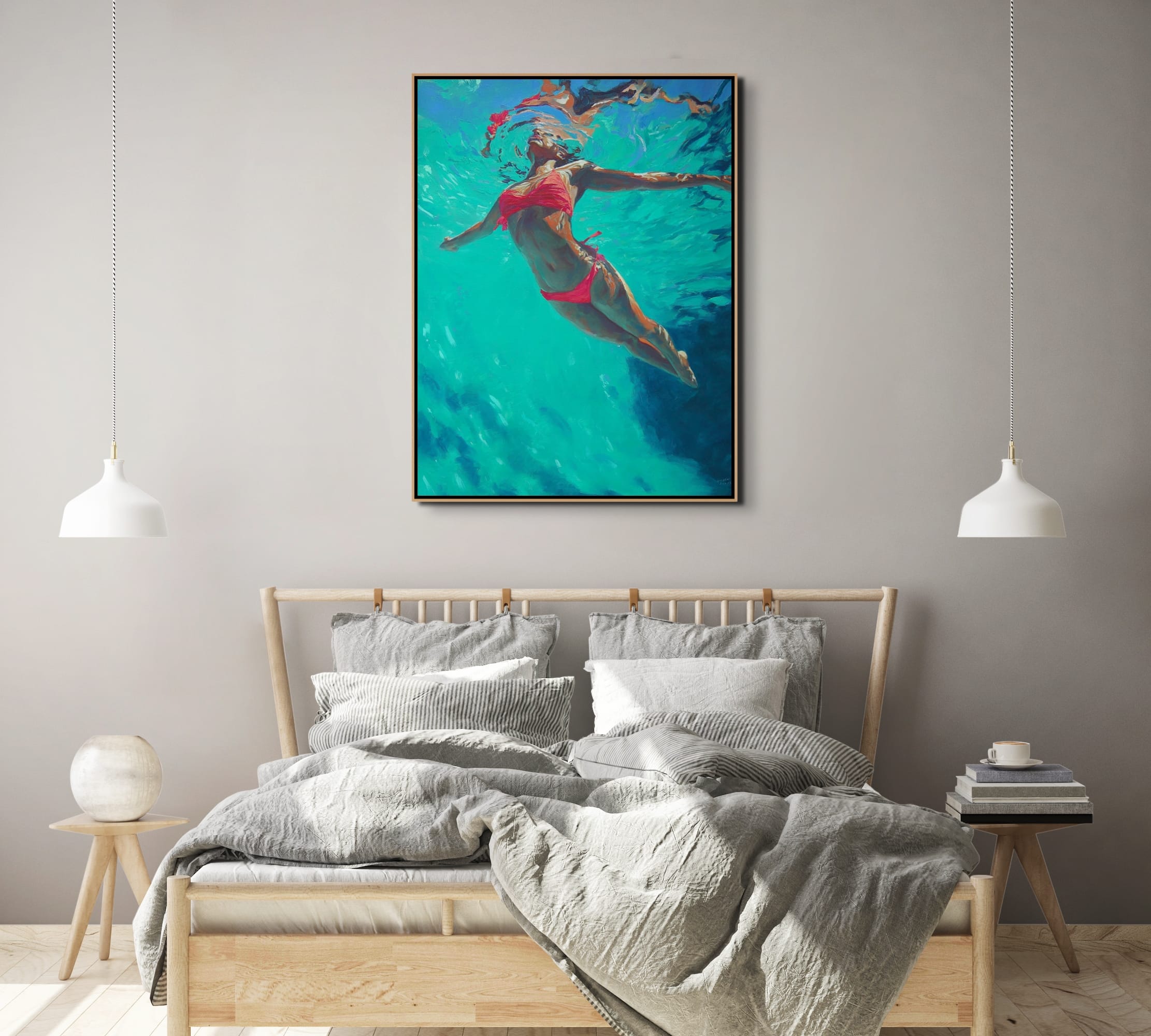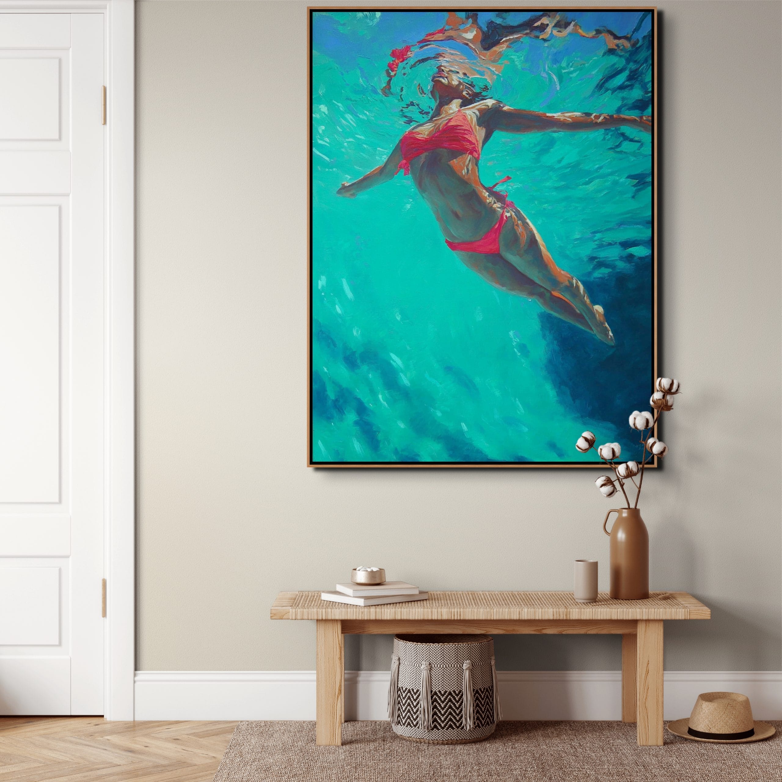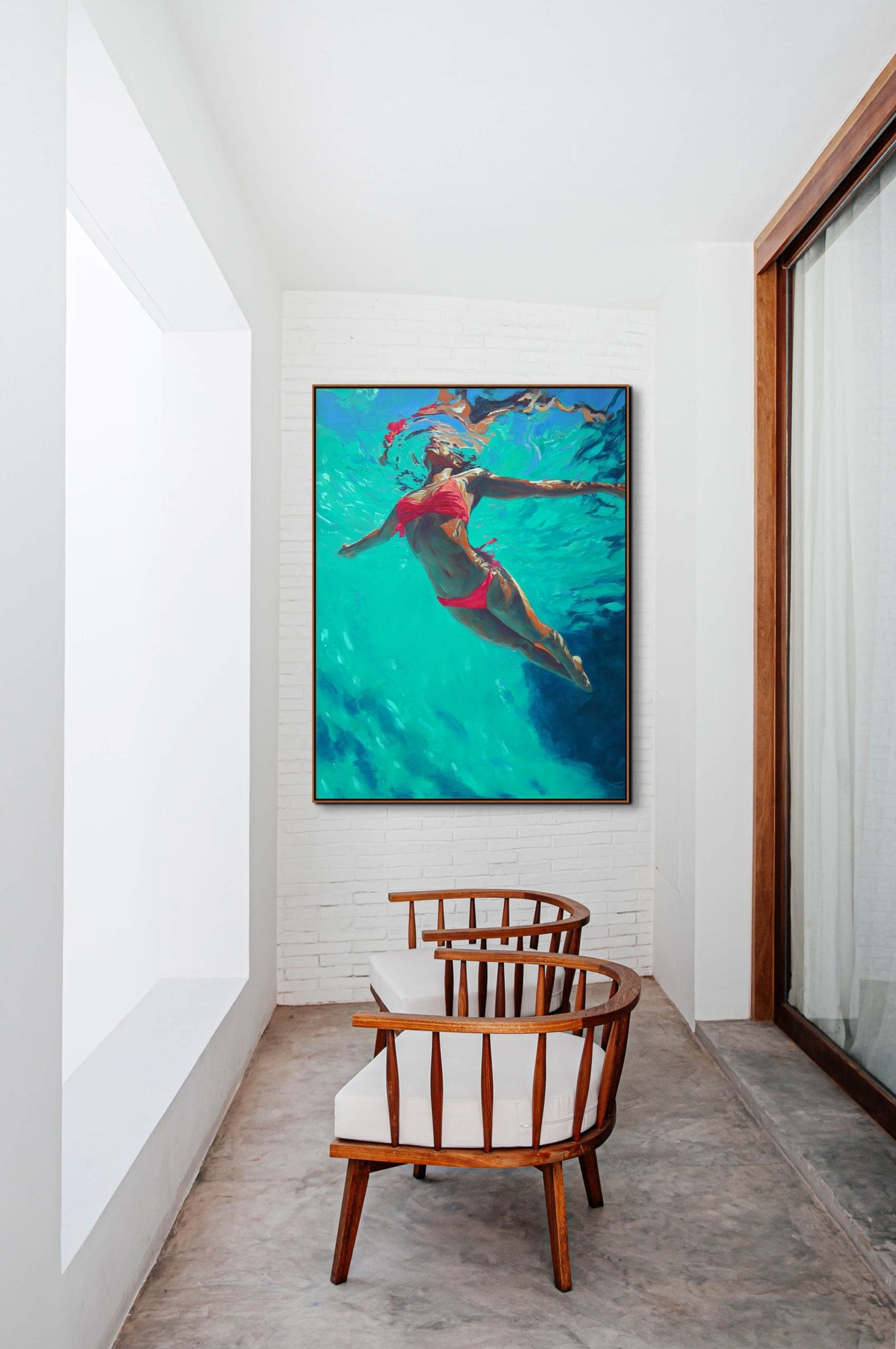 Ručně malovaná struktura pracuje s kontrastem mezi klidem lidského těla a dynamikou vody. Tahy štětce jsou místy uvolněné, jinde vrstvené, což vytváří iluzi skutečné hloubky pod hladinou.
