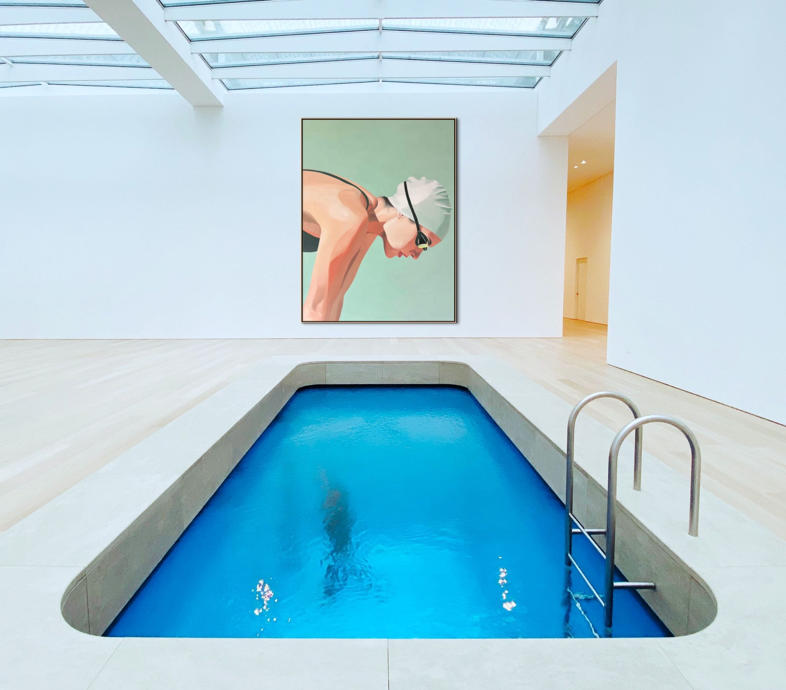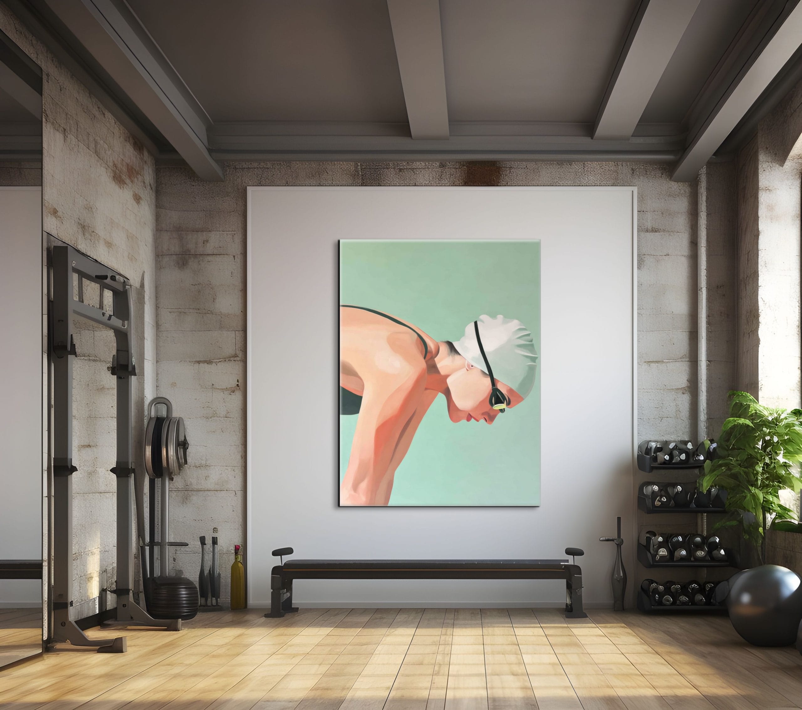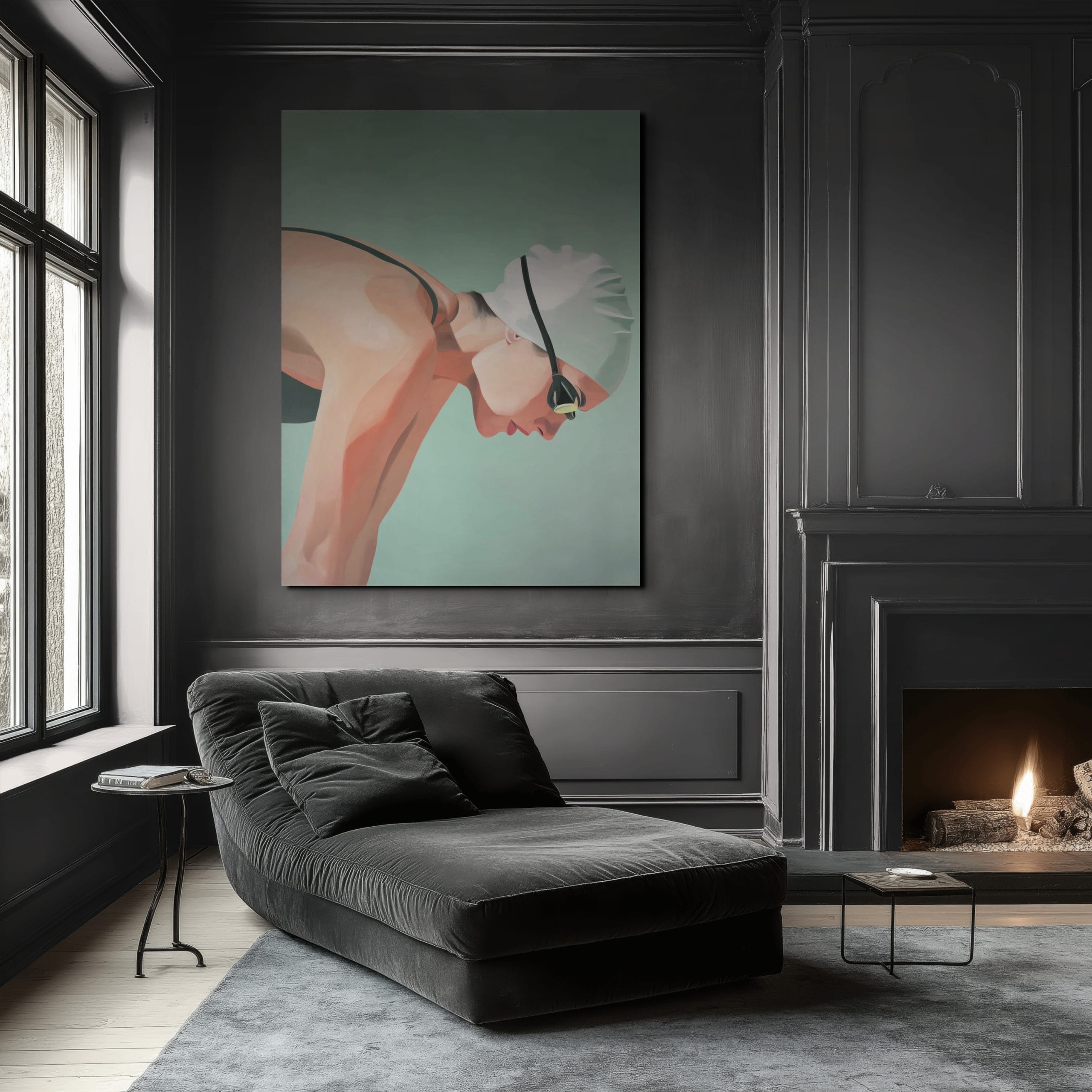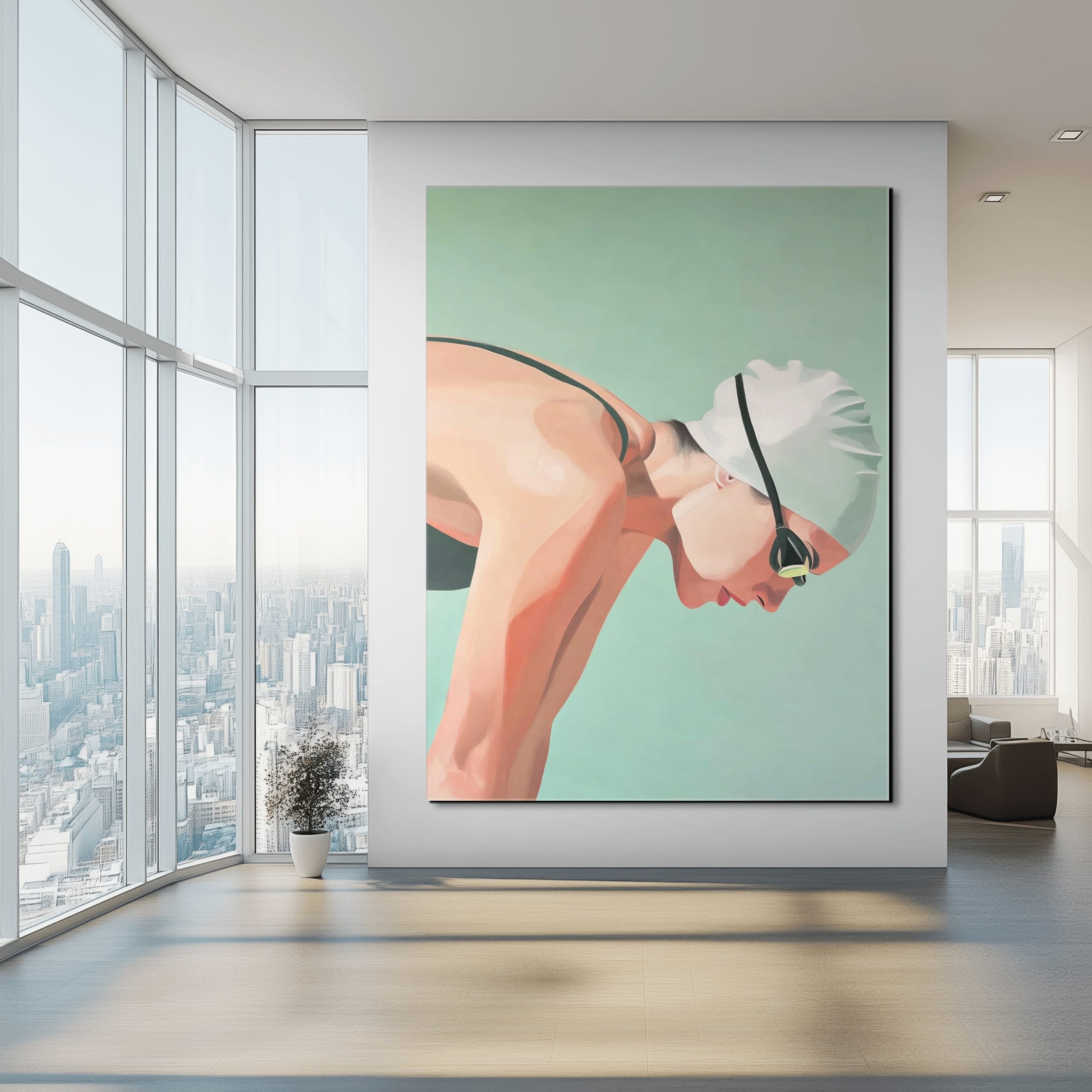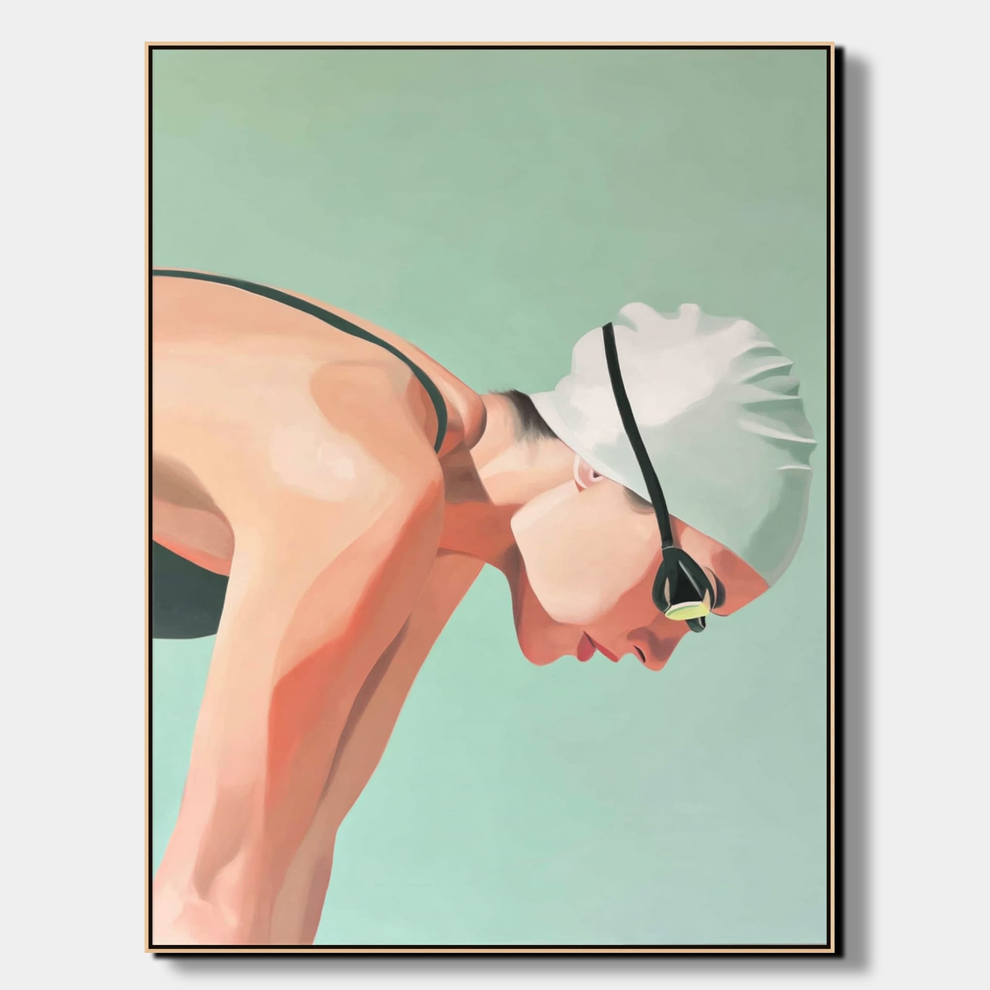 Před startem zachycuje sportovkyni v okamžiku maximální koncentrace, těsně před tím, než se její tělo dá do pohybu. Minimalistická kompozice nechává vyniknout tvar paží, profil obličeje i napětí ve svalech. Jemné přechody světla na pokožce kontrastují s klidným tyrkysovým pozadím, které podtrhuje čistotu a moderní charakter celé scény. Obraz působí vyváženě, současně a přitom velmi emotivně – pracuje s tichem před výkonem, s očekáváním i vnitřní silou.