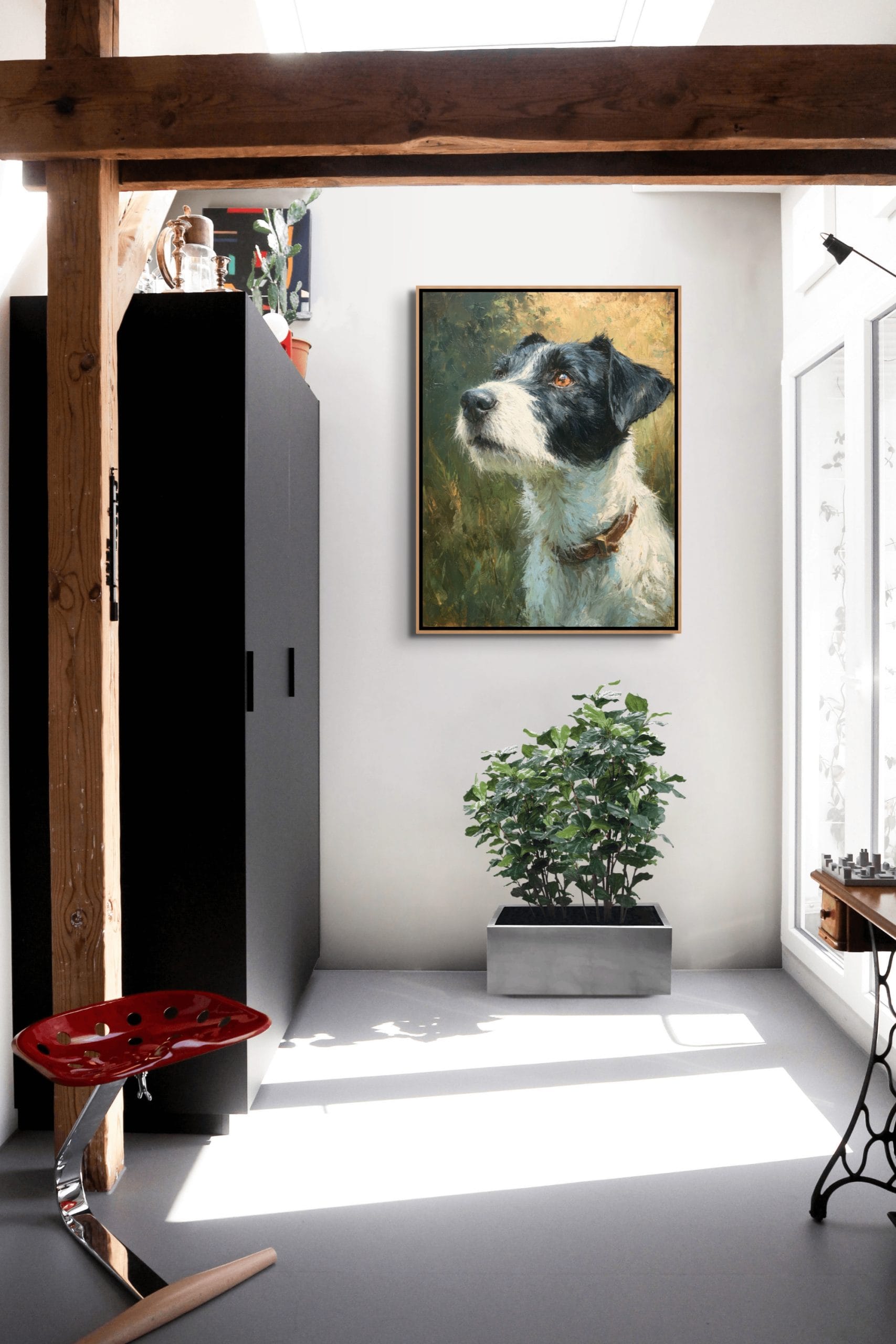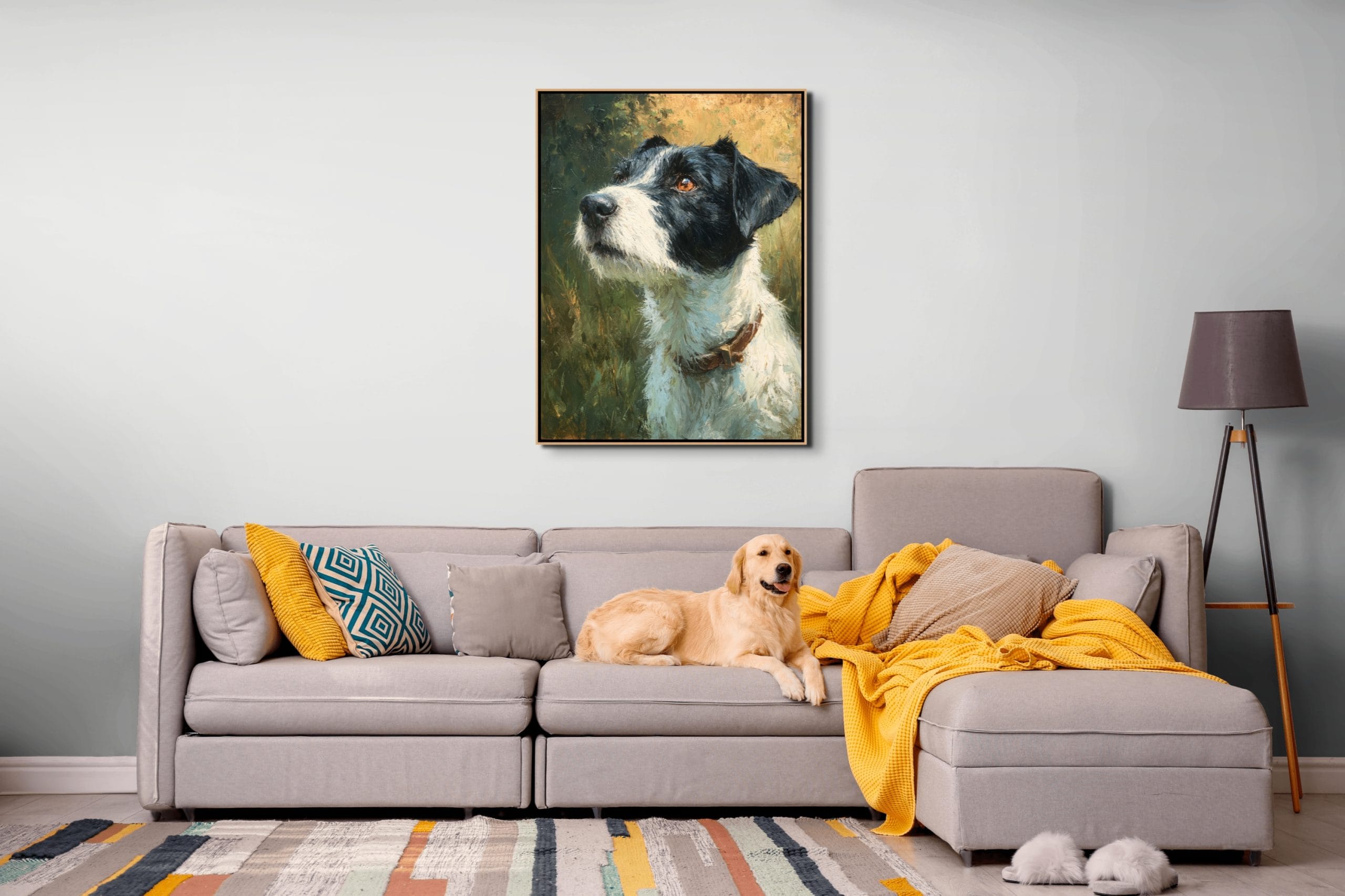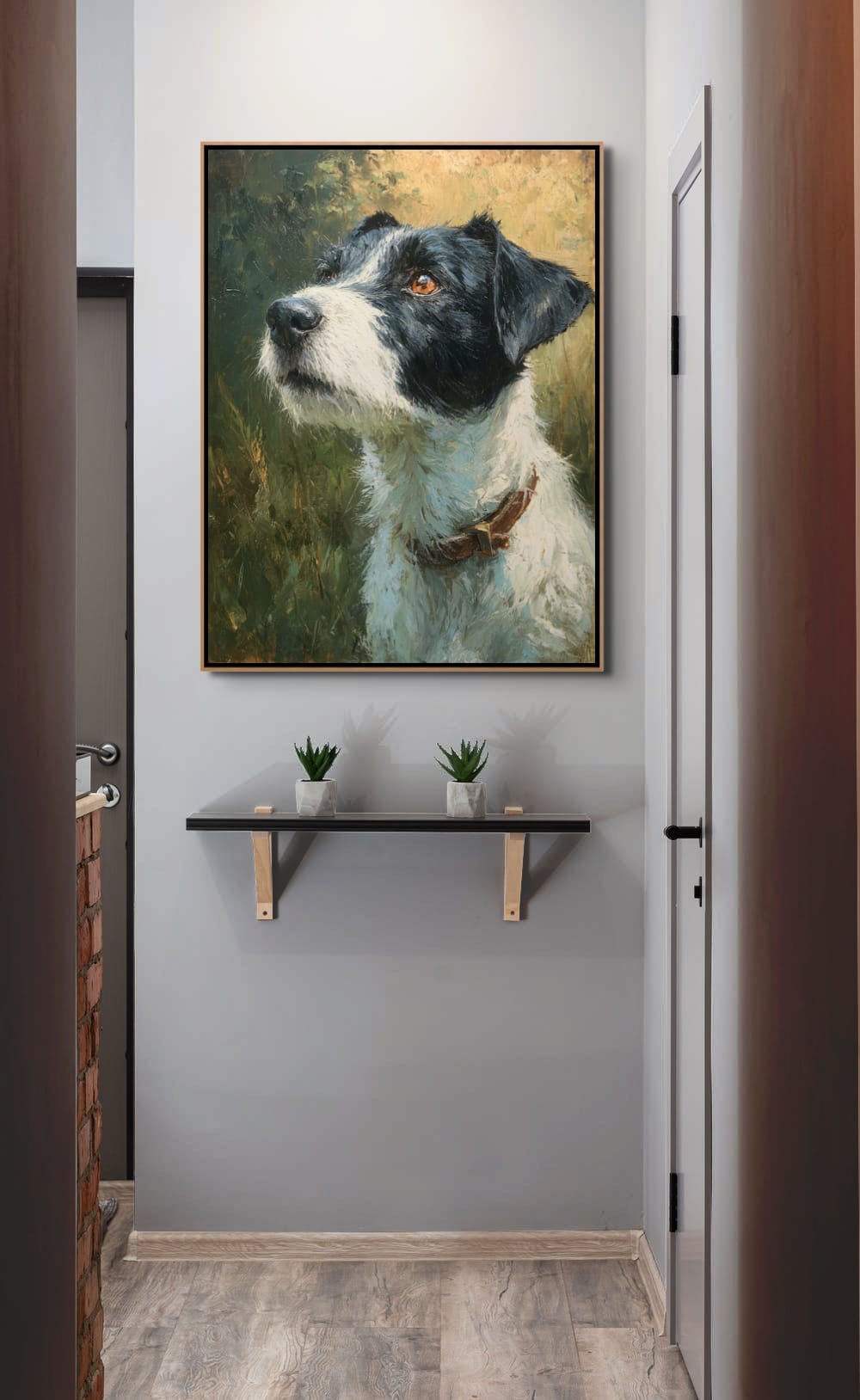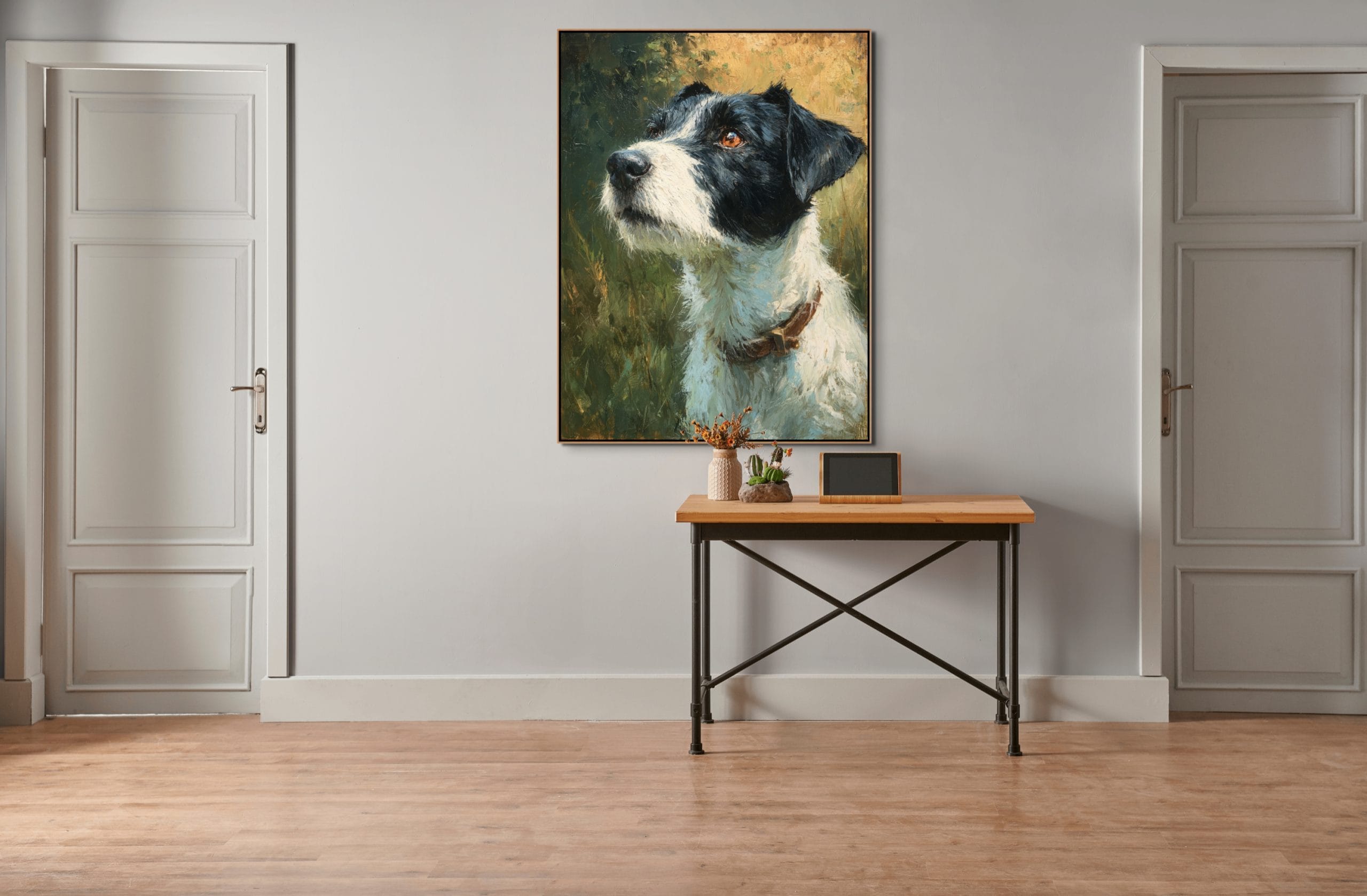 Ručně malovaný portrét psa s moudrým pohledem vnáší do interiéru pocit věrnosti, klidu a hřejivou atmosféru domova v přírodních tónech.