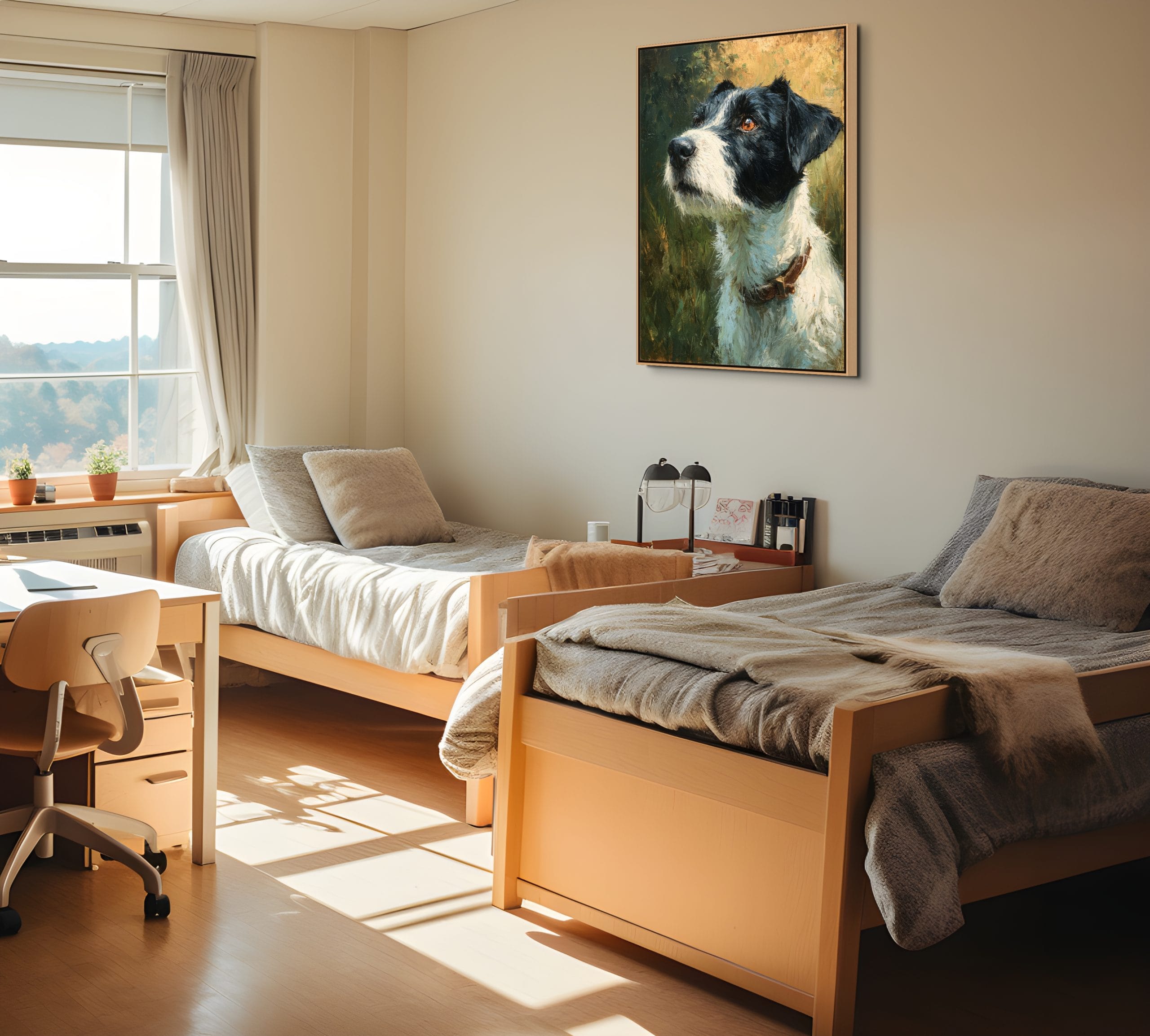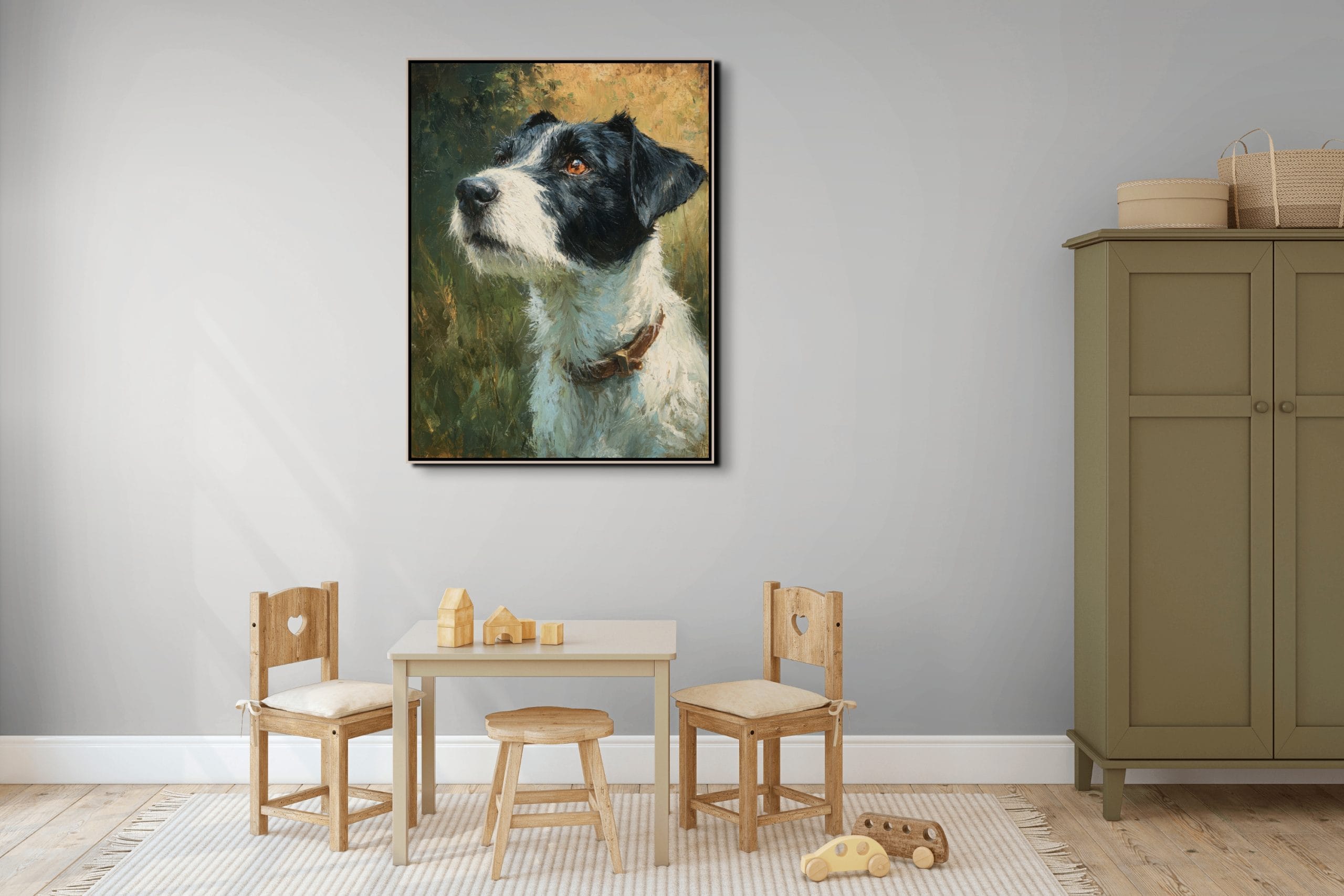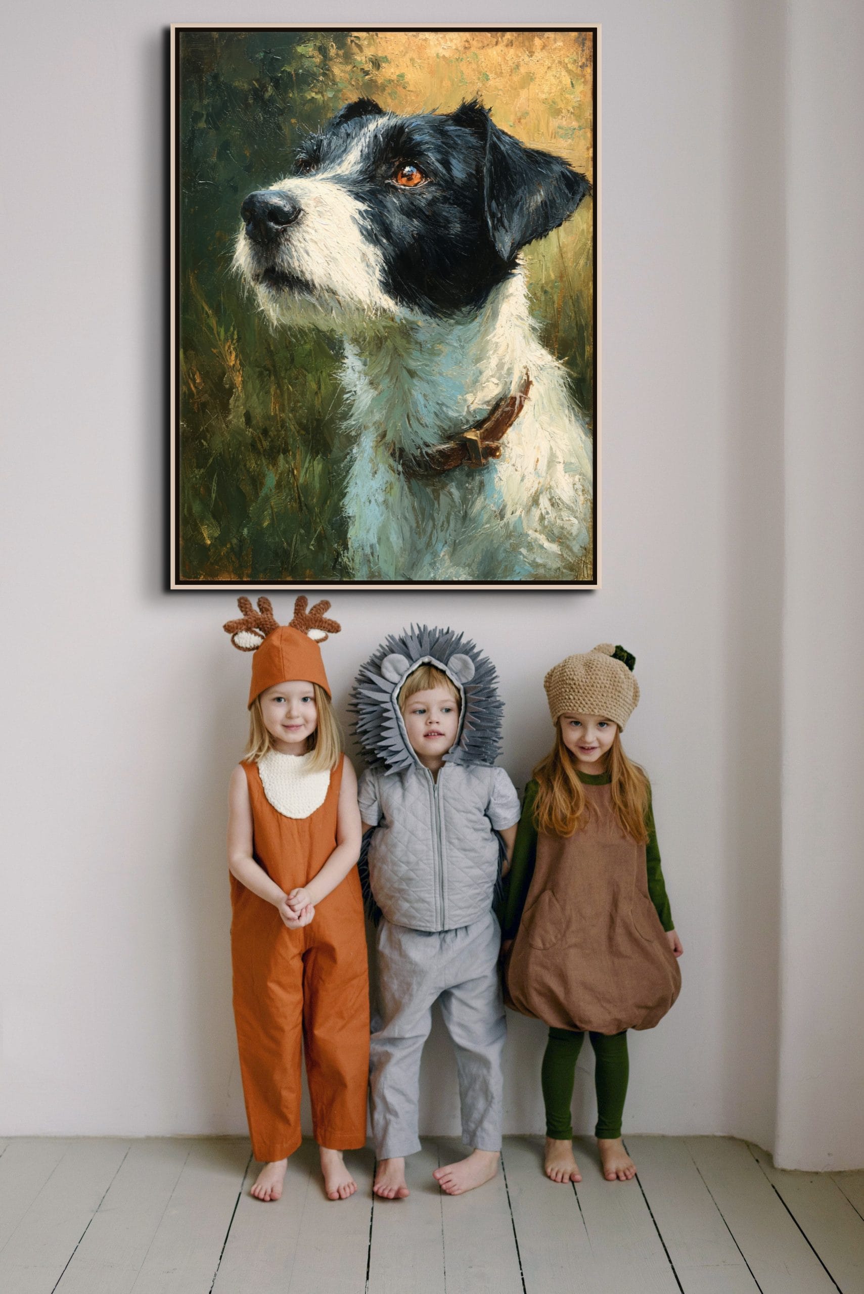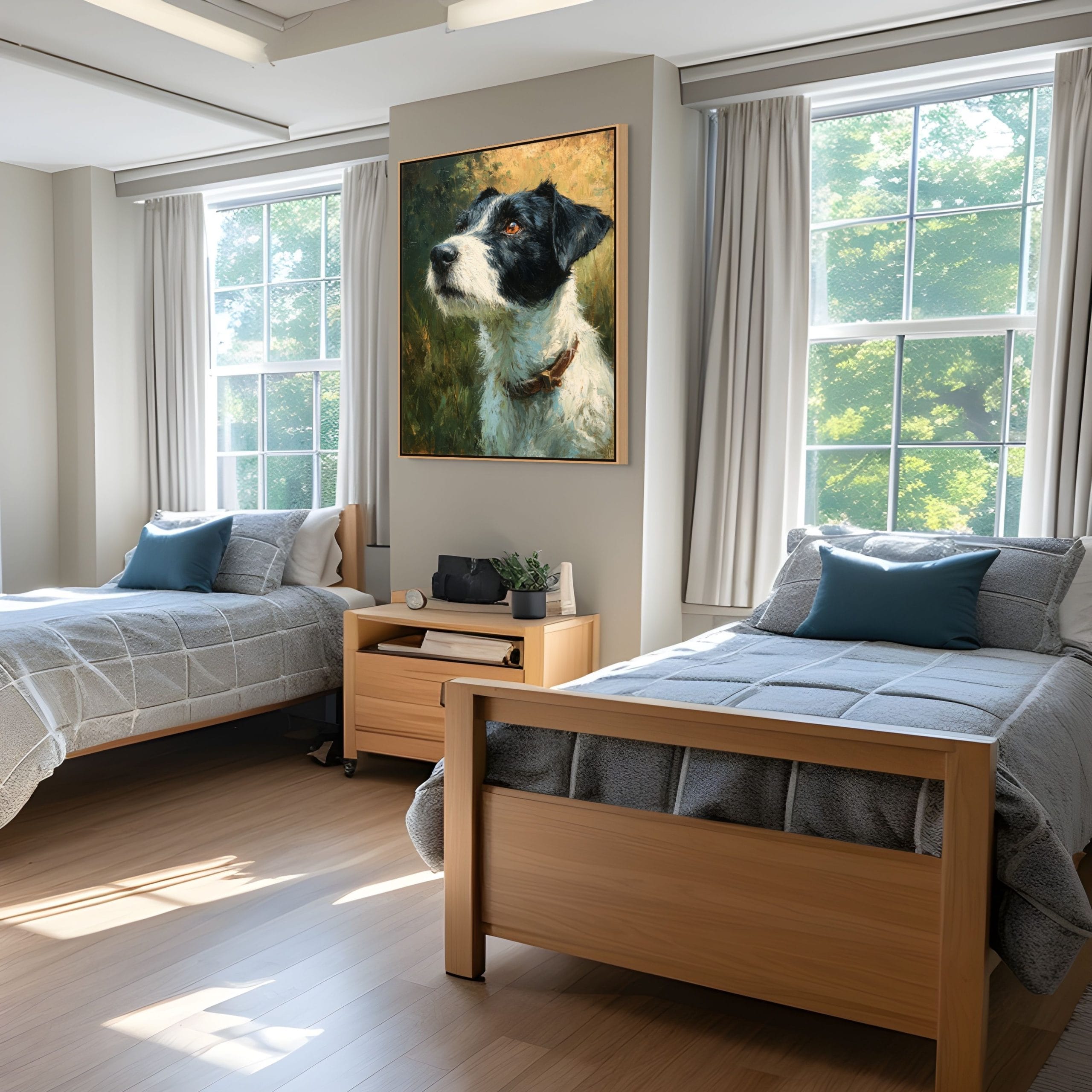 Ručně malovaný portrét psa s moudrým pohledem vnáší do interiéru pocit věrnosti, klidu a hřejivou atmosféru domova v přírodních tónech.