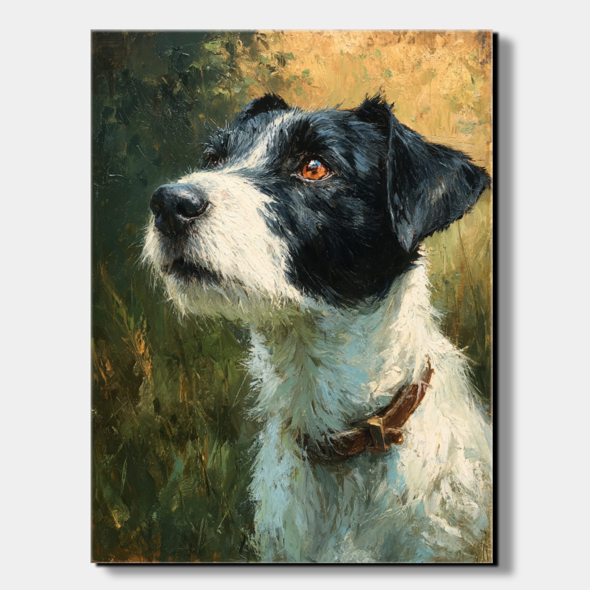 Atmosféra tohoto plátna vás okamžitě přenese do poklidného odpoledne v přírodě, kdy se čas na malý okamžik zastavil v upřeném a oddaném pohledu věrného společníka. Celý výjev je prostoupen intenzivním pocitem lásky a tichého porozumění, který umělec mistrovsky zachytil skrze hřejivé, zlatavé tóny dopadající na srst teriéra. Světlo zde neplní pouze roli obyčejného osvětlení scény, ale stává se hlavním nositelem všech emocí. Jemně modeluje strukturu hrubé srsti, zdůrazňuje jiskru v moudrých očích a vytváří fascinující hru odlesků, což dává vyniknout intimitě a nerušenému vztahu mezi člověkem a zvířetem, který působí velmi upřímným a hlubokým dojmem.