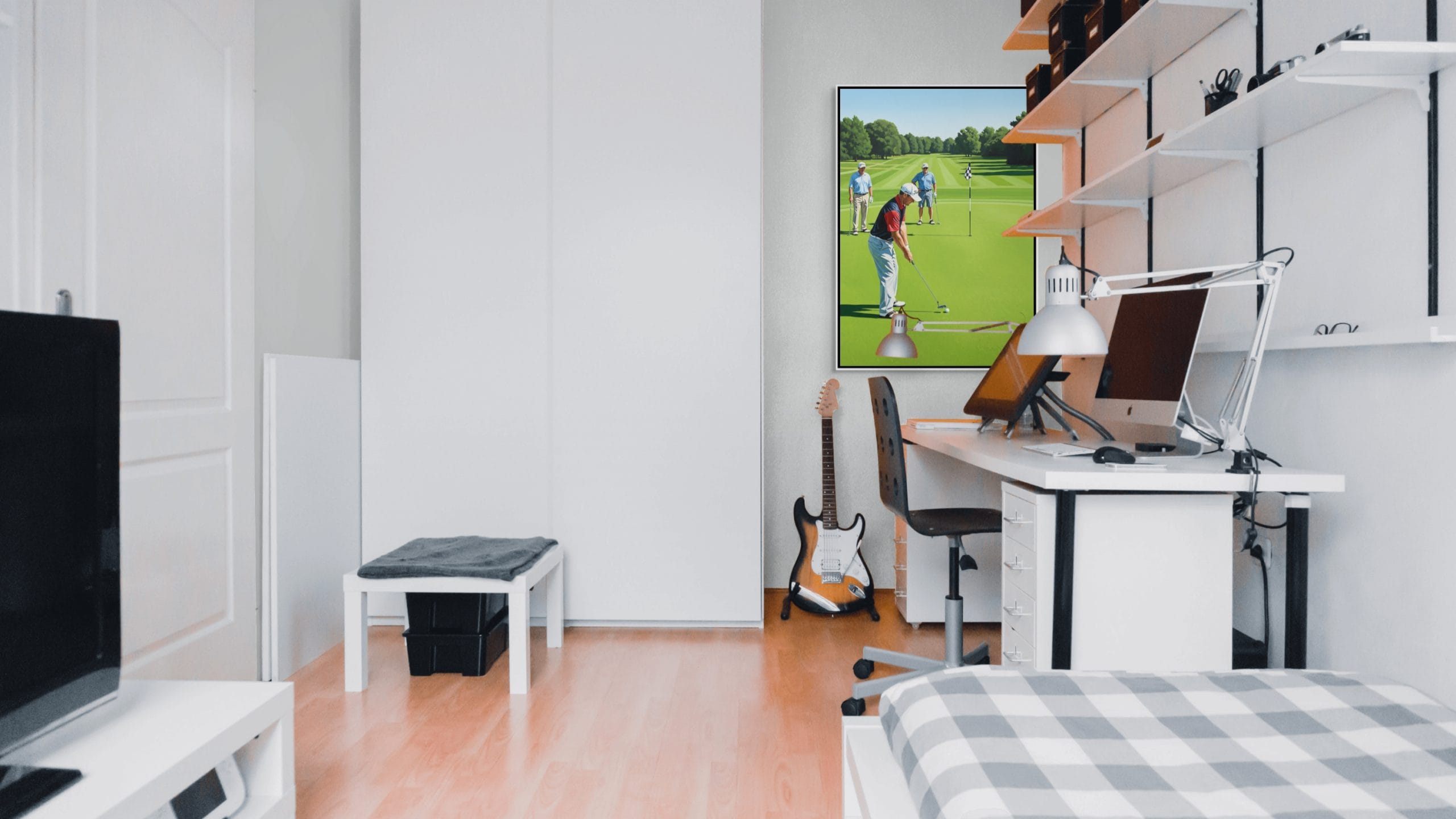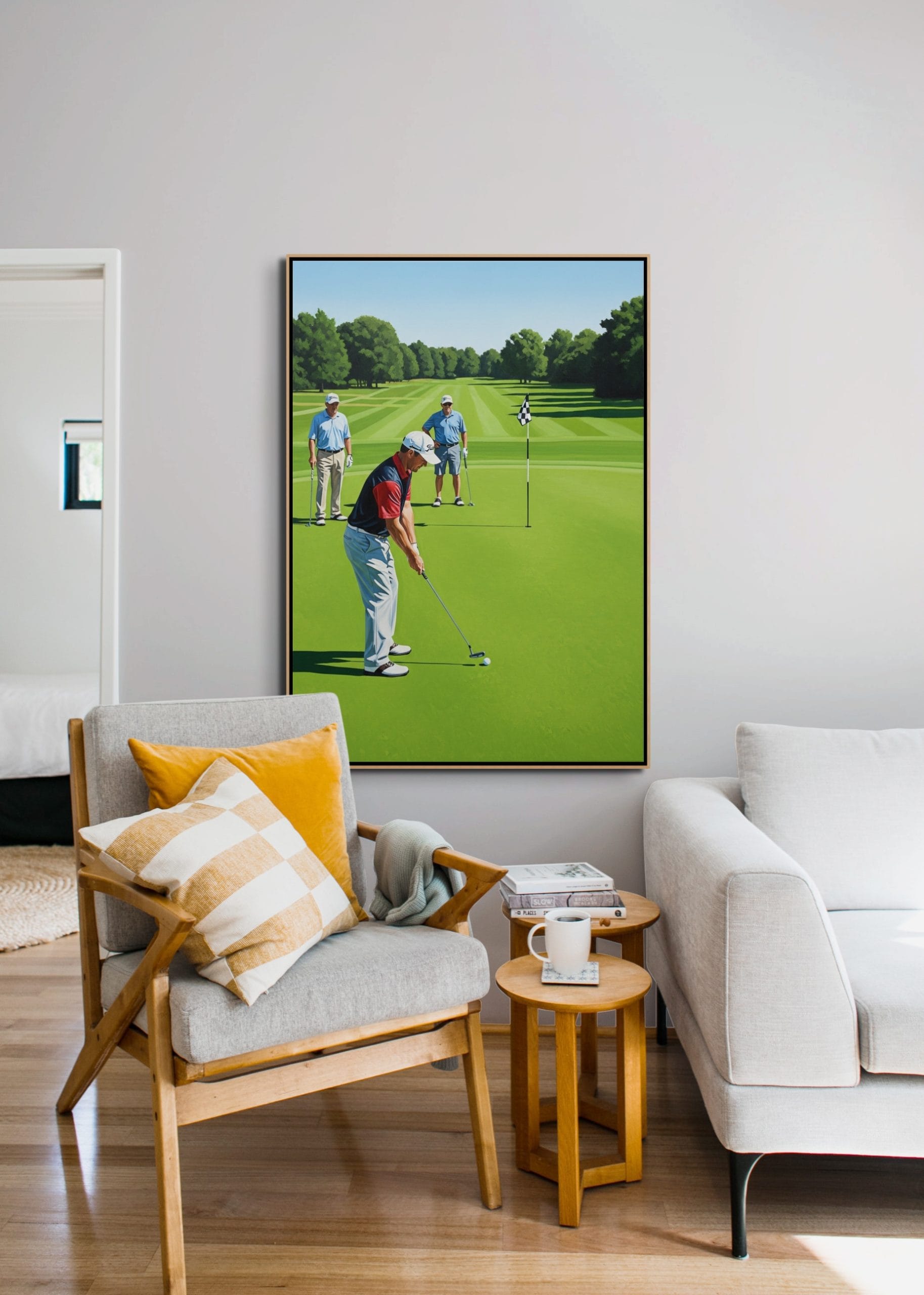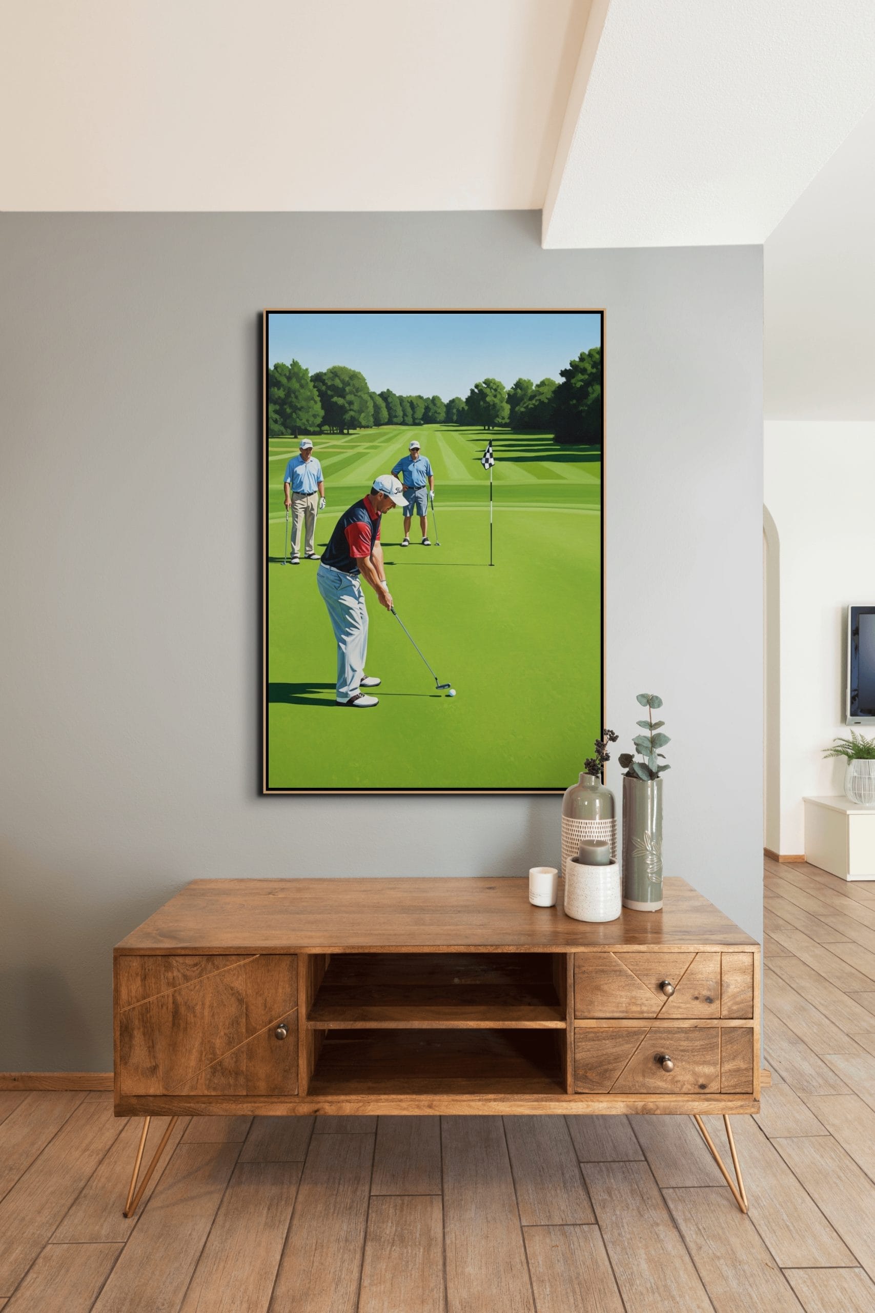 Ručně malovaný obraz zachycující magický moment na greenu vnáší do interiéru sportovní prestiž, hřejivé slunce a atmosféru vítězného turnaje.