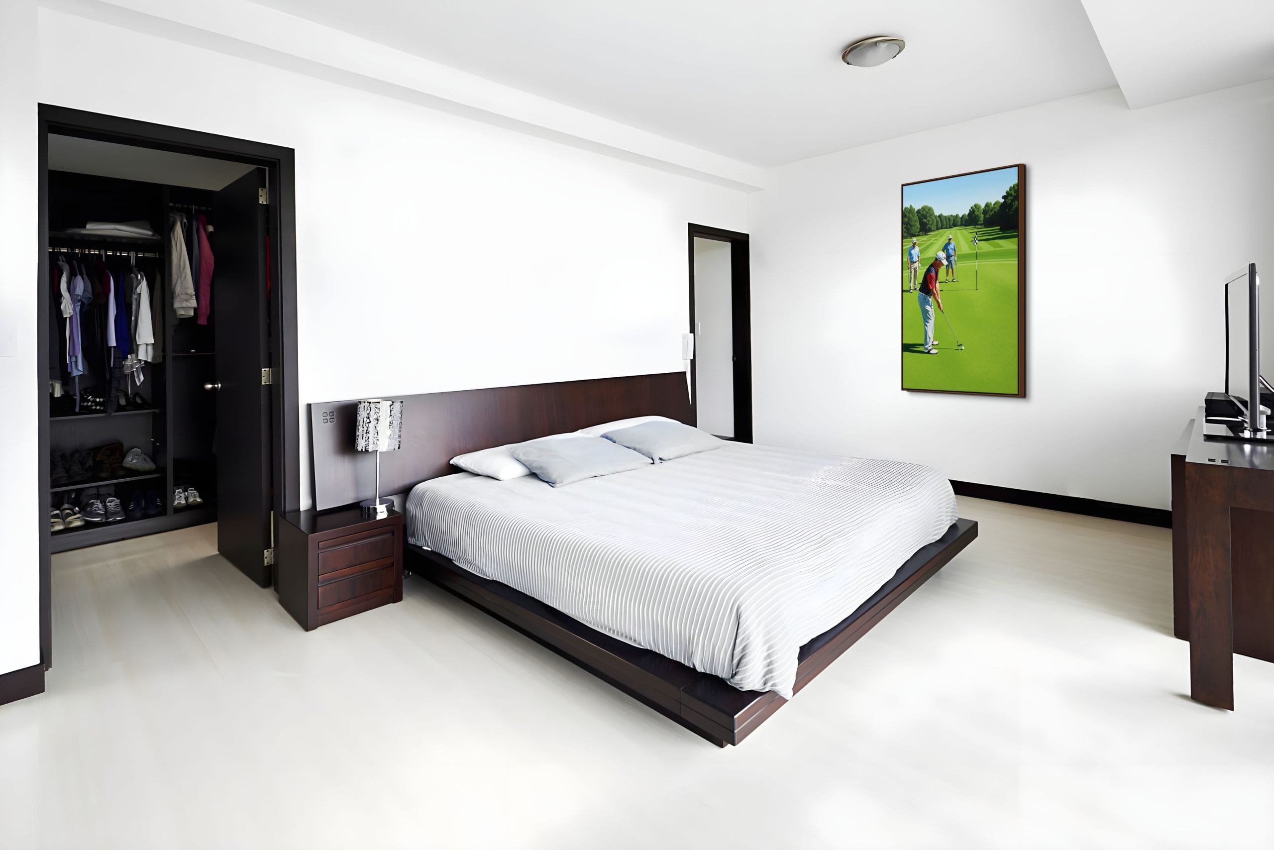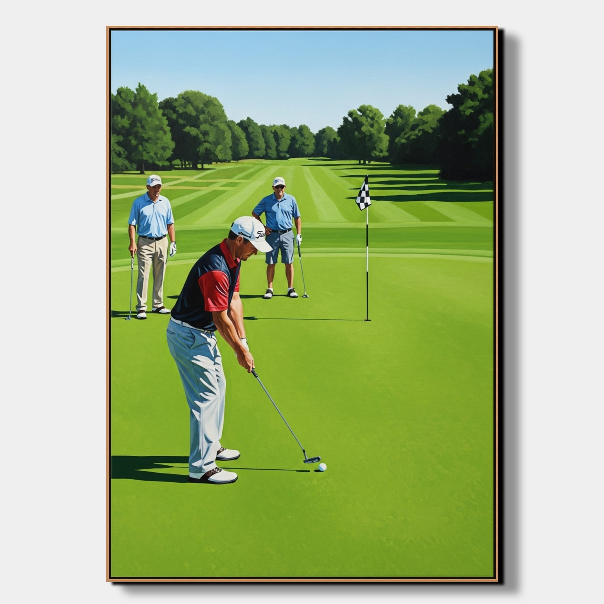 Atmosféra tohoto plátna vás okamžitě přenese do hřejivého letního odpoledne na greenu, kdy se čas na malý okamžik zastavil v absolutním soustředění nad jamkou. Celý výjev je prostoupen intenzivním pocitem očekávání a tiché radosti z dokonale odehrané hry, který umělec mistrovsky zachytil skrze syté, prosluněné tóny dopadající na golfový míček a stébla trávy. Světlo zde neplní pouze roli obyčejného osvětlení scény, ale stává se hlavním nositelem napětí celého příběhu. Jemně modeluje texturu golfového vybavení, zdůrazňuje dlouhé stíny blížícího se večera a vytváří fascinující hru odlesků na nerezových detailech, což dává vyniknout intimitě okamžiku, který působí velmi autentickým a prestižním dojmem.