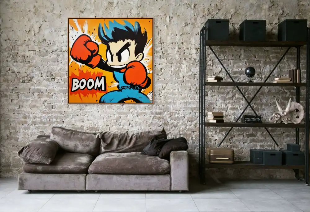 Tato výrazná malba inspirovaná komiksovou estetikou zaujme odvážným motivem a výraznou barevností. Hlavní postava s rudými boxerskými rukavicemi a dynamickým gestem vytváří okamžitý dojem pohybu a napětí.