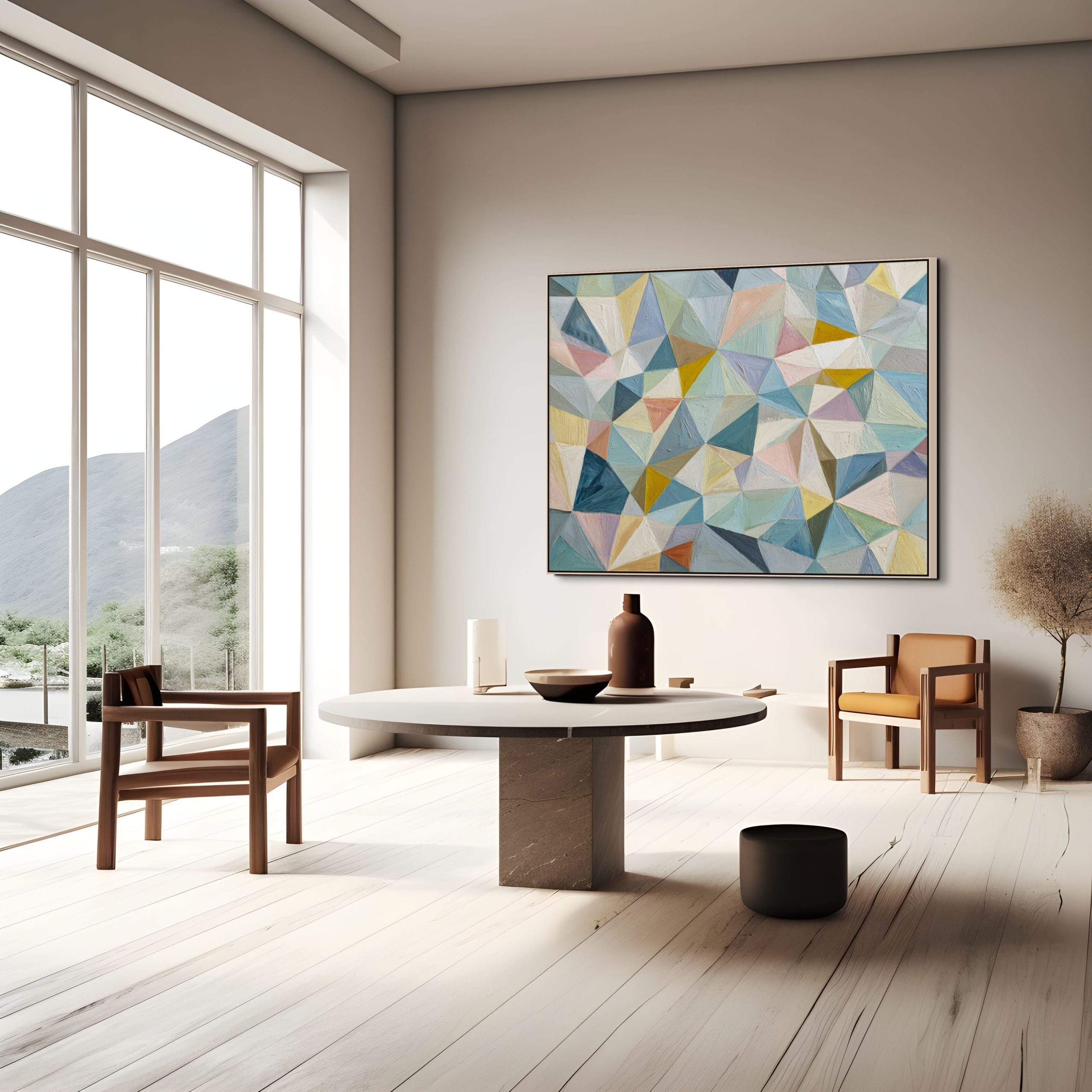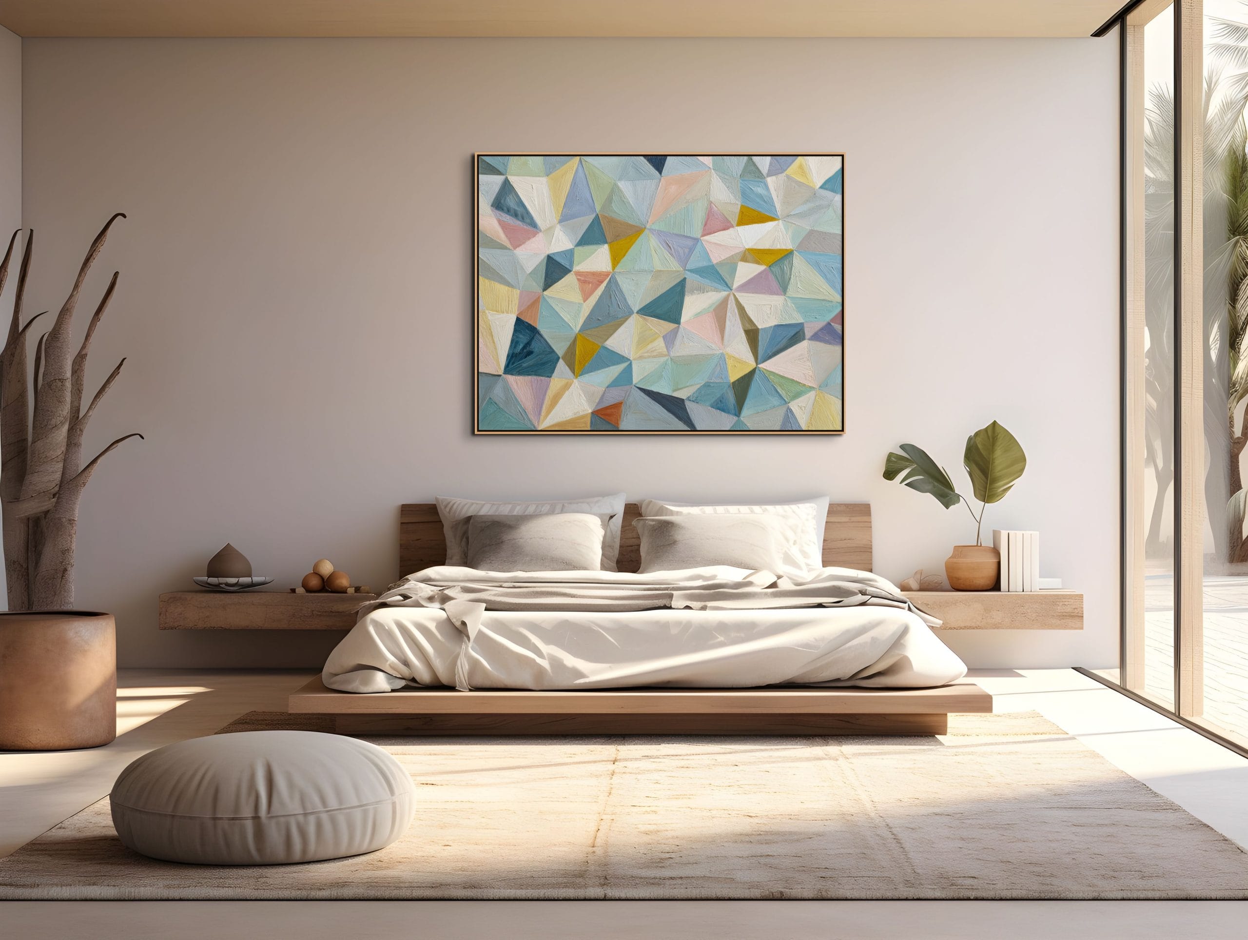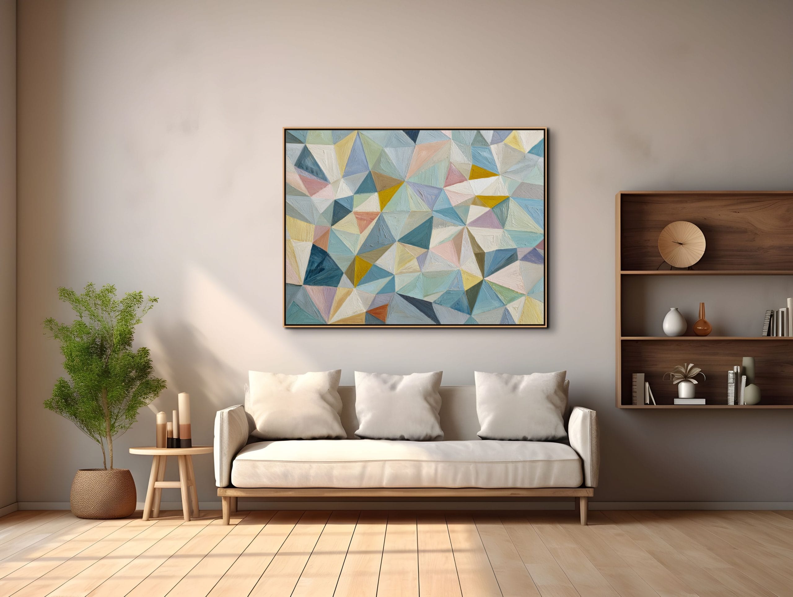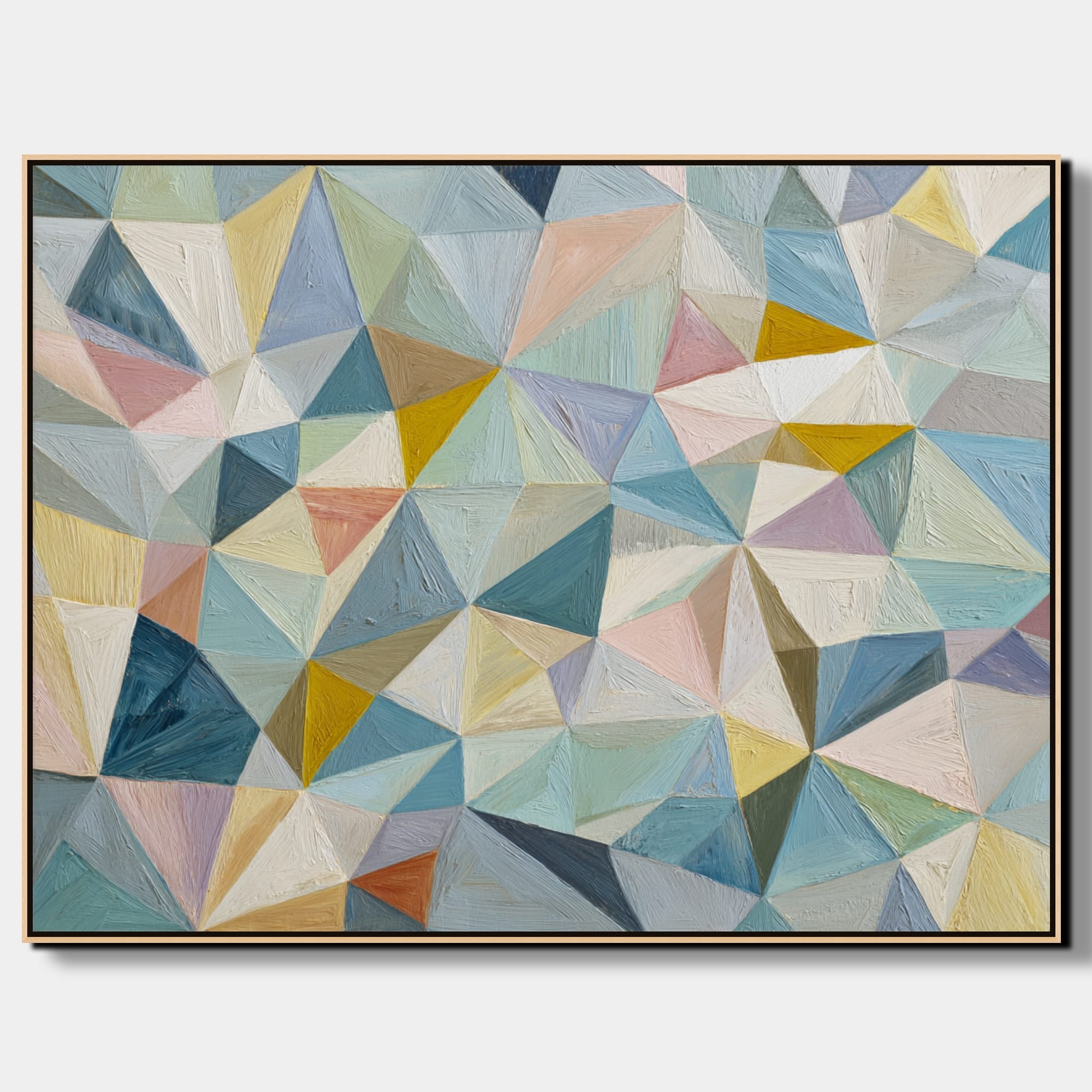 Struktura složená z přesně navazujících ploch. Tento obraz je vystavěný na mozaice trojúhelníkových a polygonálních tvarů, které do sebe zapadají a vytvářejí pevný vizuální systém. Pastelové odstíny modré, tyrkysové, béžové a jemně růžové jsou doplněny teplejšími akcenty žluté a okrové, což udržuje kompozici vyváženou a přehlednou.