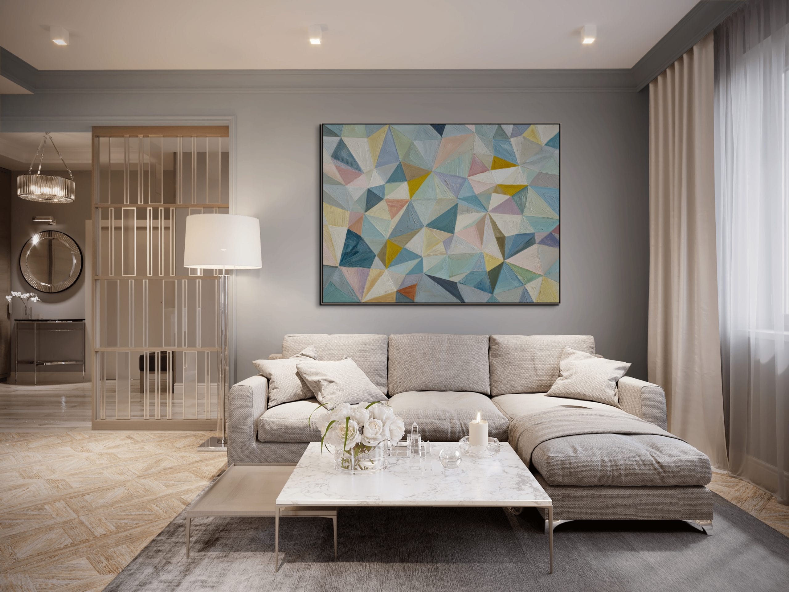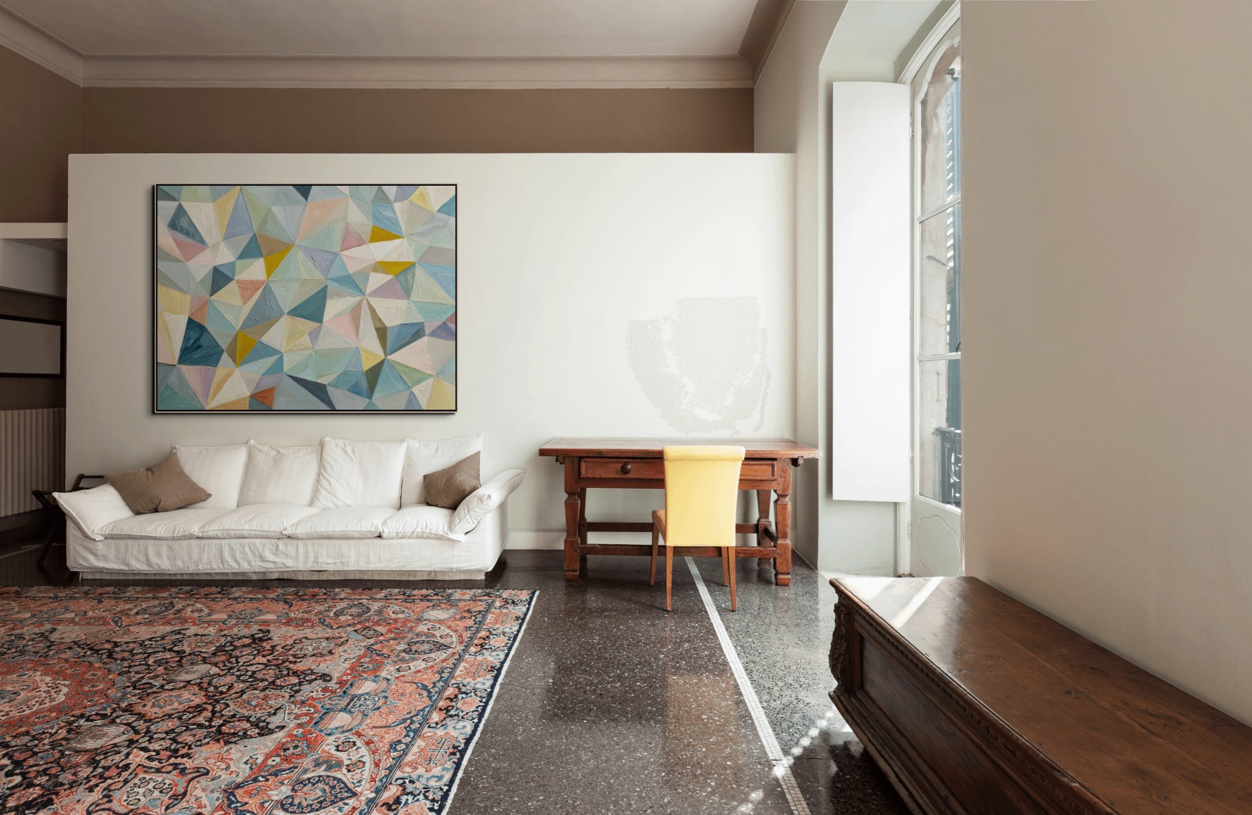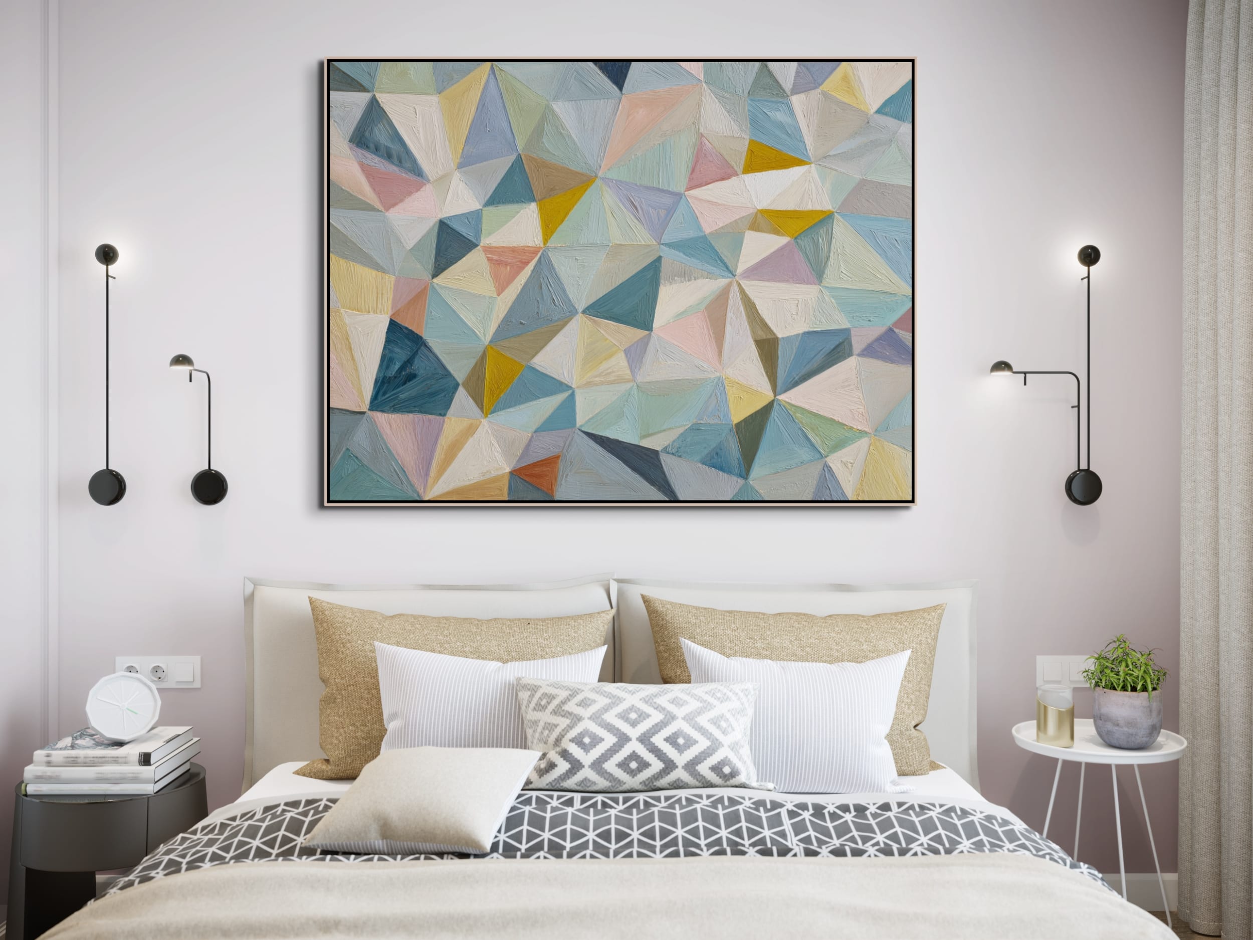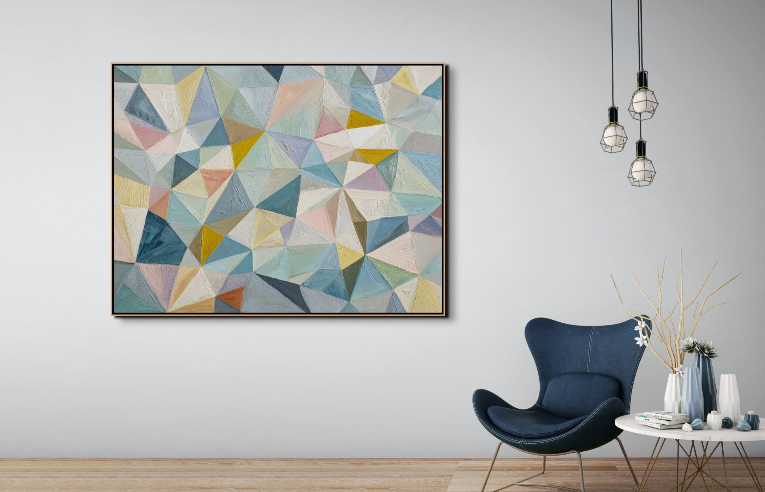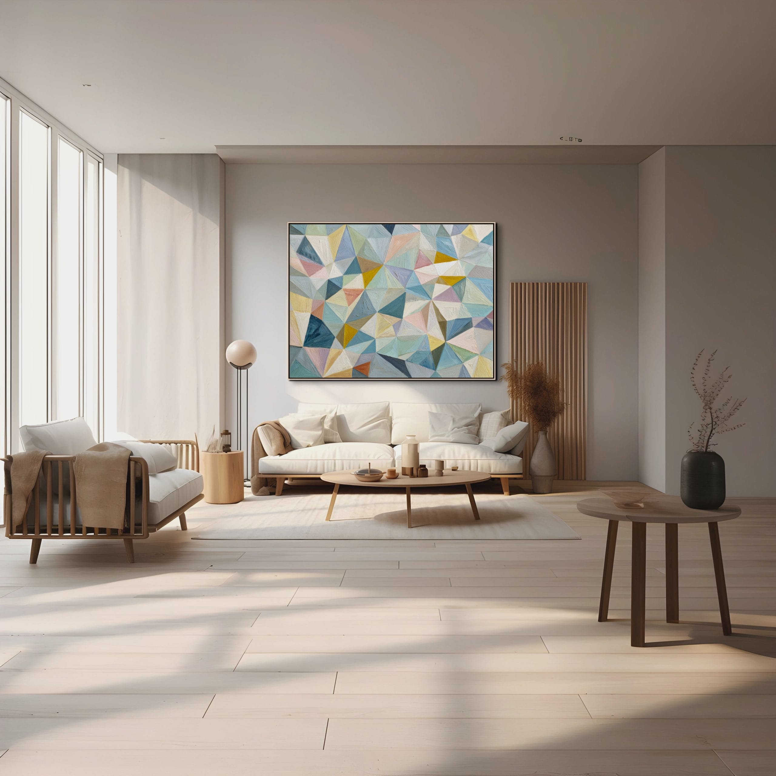 Struktura složená z přesně navazujících ploch. Tento obraz je vystavěný na mozaice trojúhelníkových a polygonálních tvarů, které do sebe zapadají a vytvářejí pevný vizuální systém. Pastelové odstíny modré, tyrkysové, béžové a jemně růžové jsou doplněny teplejšími akcenty žluté a okrové, což udržuje kompozici vyváženou a přehlednou.