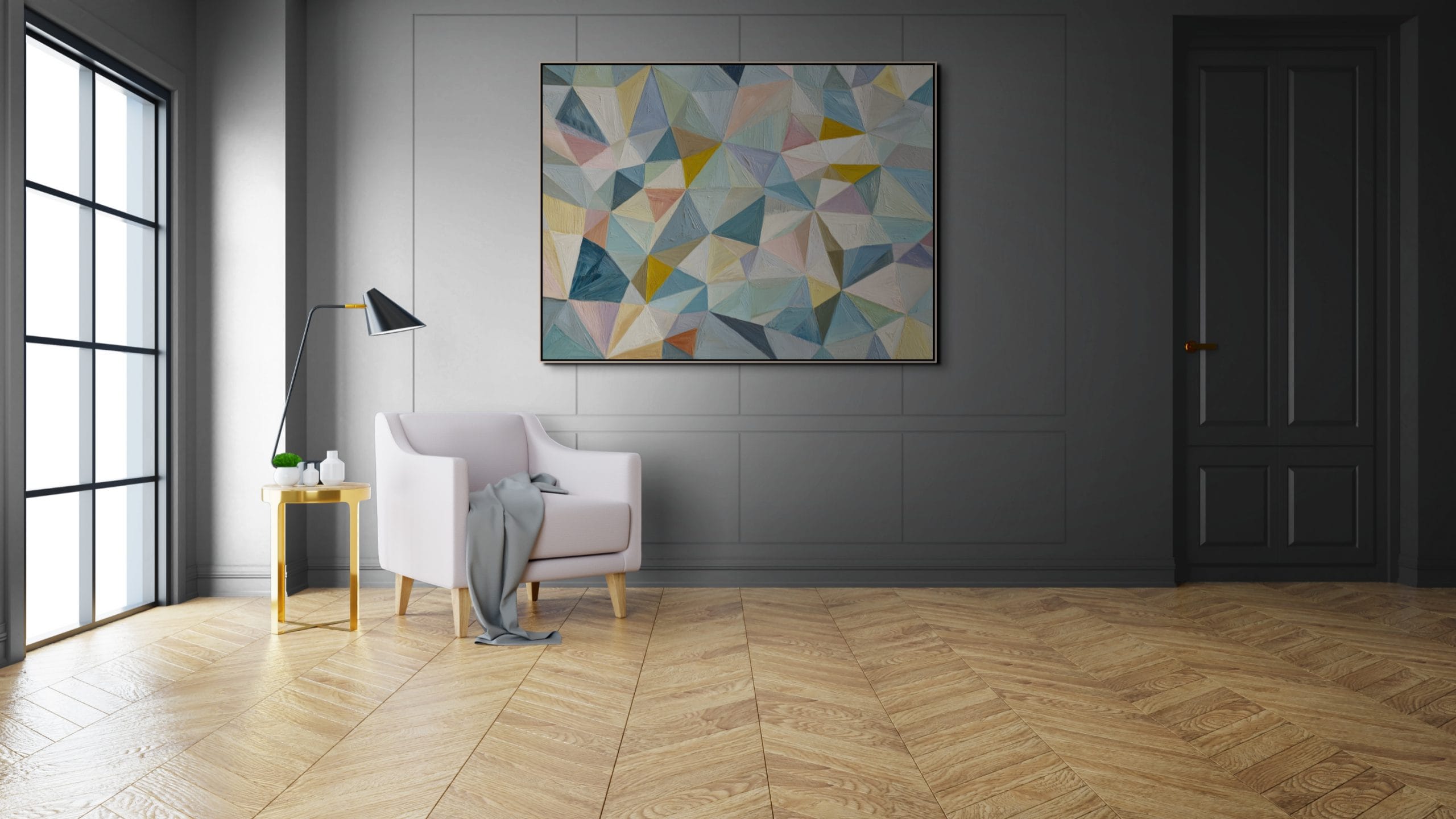 Ručně malované vrstvy barev vytvářejí jemnou reliéfní strukturu – geometrické tvary, která se mění podle dopadu světla. Viditelné tahy štětce dodávají obrazu přirozenost a zabraňují tomu, aby působil technicky nebo sterilně.