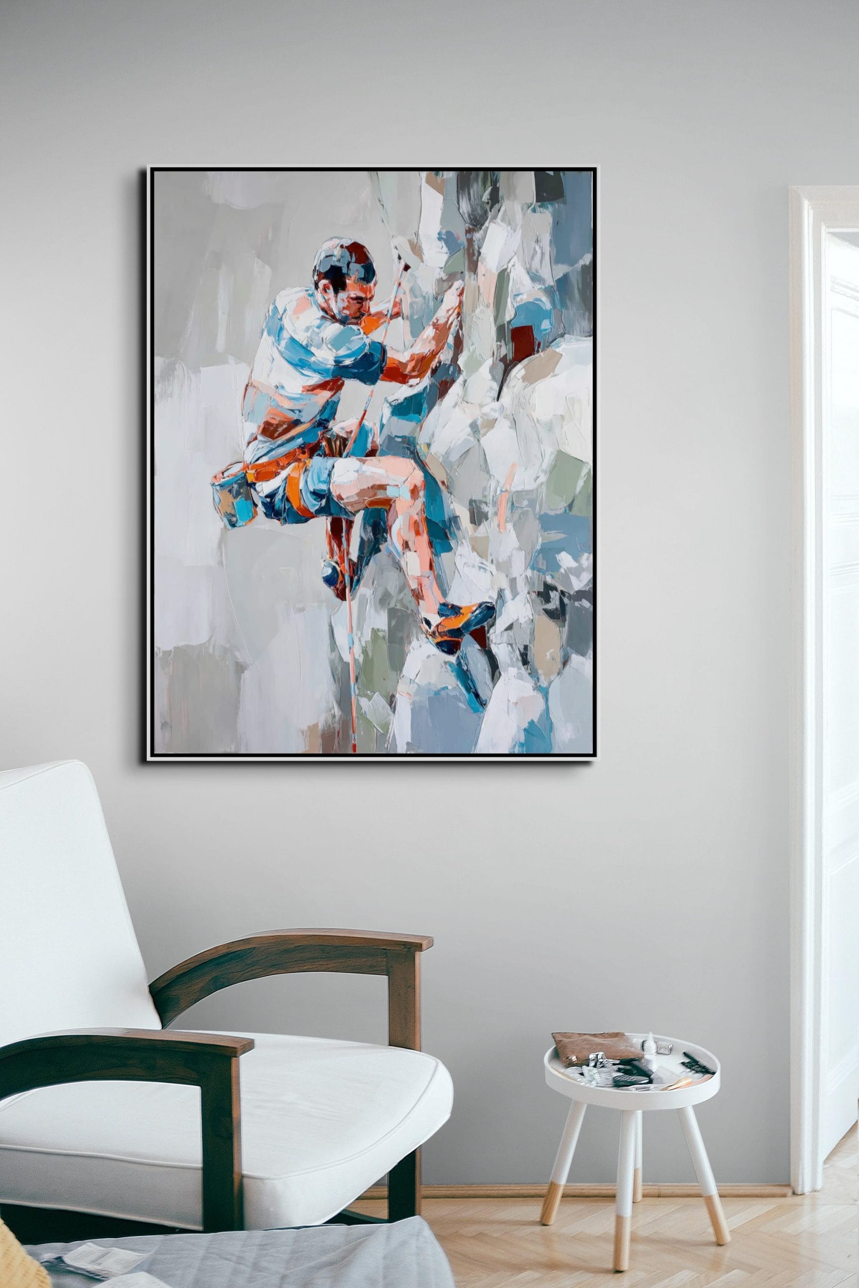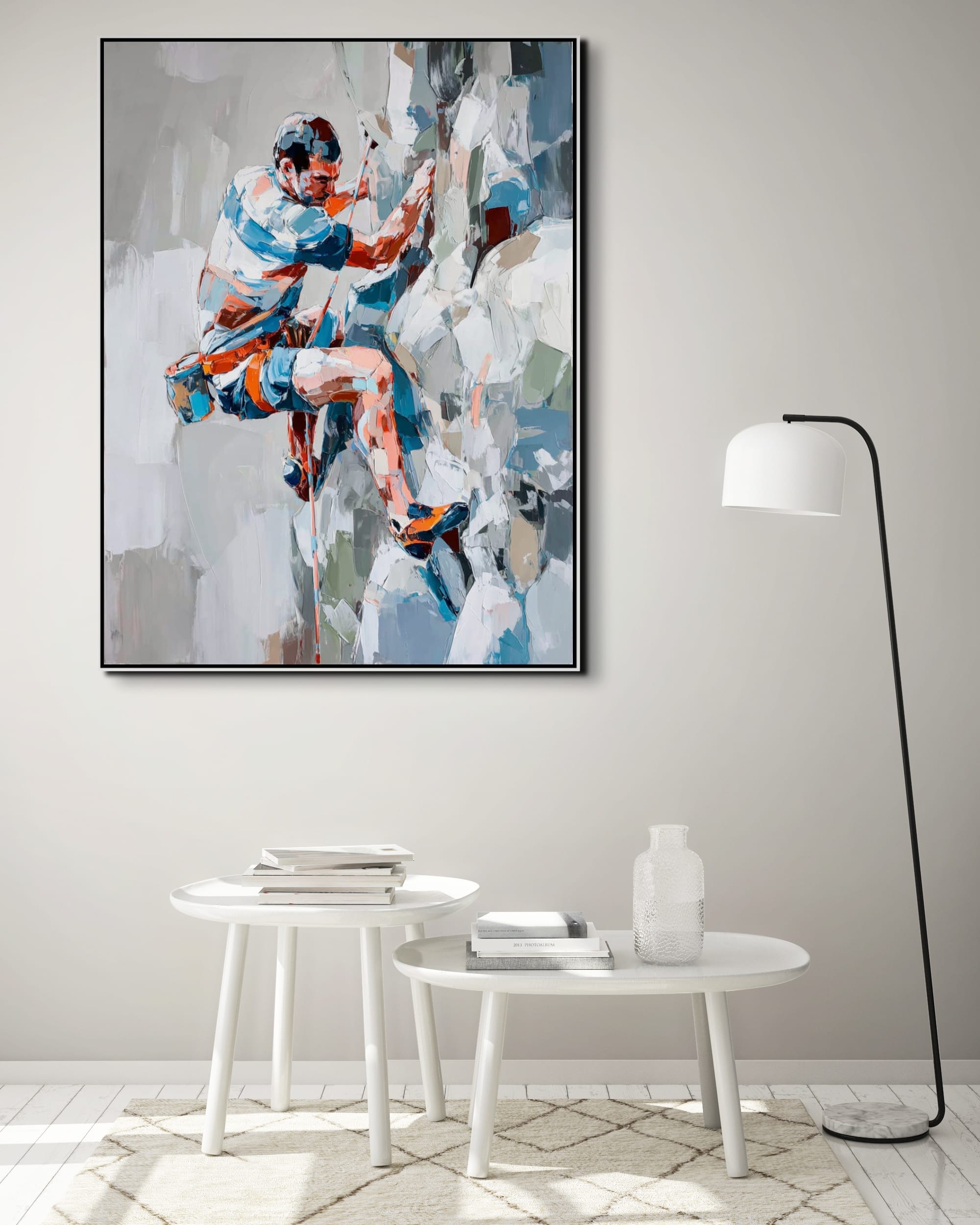 V interiéru obraz funguje jako výrazný vizuální akcent, který symbolizuje odhodlání, vytrvalost a překonávání překážek. Obraz horolezce se hodí do moderních obývacích pokojů, pracoven i kanceláří, kde podporuje motivaci a aktivní přístup k životu.