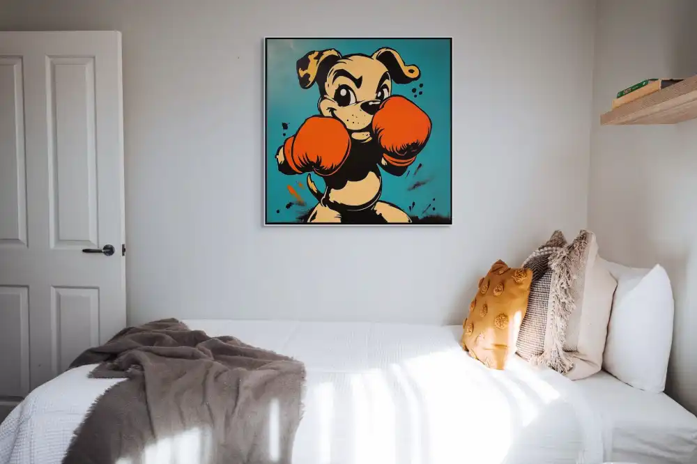 Pop art obraz se psem v boxerských rukavicích vnáší do interiéru energii, humor a hravost. Stylizovaný animovaný pejsek s výrazem odhodlání a komicky velkými rukavicemi kontrastuje s čistým tyrkysovým pozadím. Silné kontury, syté barvy a výrazná postava jsou typickými znaky pop art stylu s komiksovým nádechem.