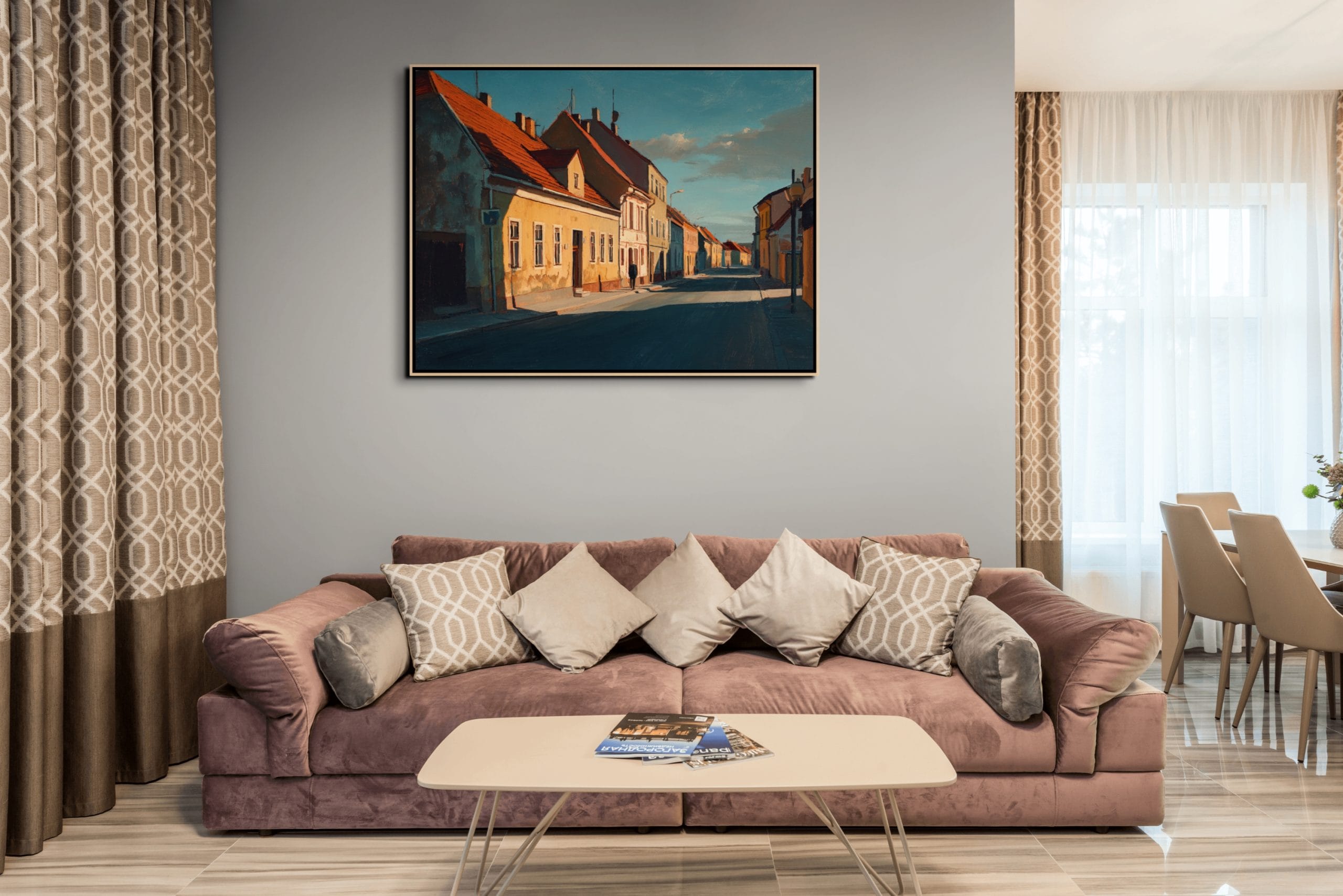 Pokud vás oslovují podobné náměty s touto městskou tematikou, rozhodně si prohlédněte také dílo Paměť města, které pracuje s podobně tichou atmosférou a pastelovými odstíny fasád. Pro milovníky barevnějšího a živějšího ruchu je pak ideální volbou obraz Romantika staré čtvrti, jenž zachycuje atmosféru slunné ulice s kavárnami. Tento obraz města se ve vaší sbírce může skvěle doplňovat s dalšími architektonickými náměty a vytvářet ucelenou tematickou kolekci, která je plná světla, nostalgie a poctivé řemeslné zručnosti, která vynikne v každém detailu ruční malby na plátně.