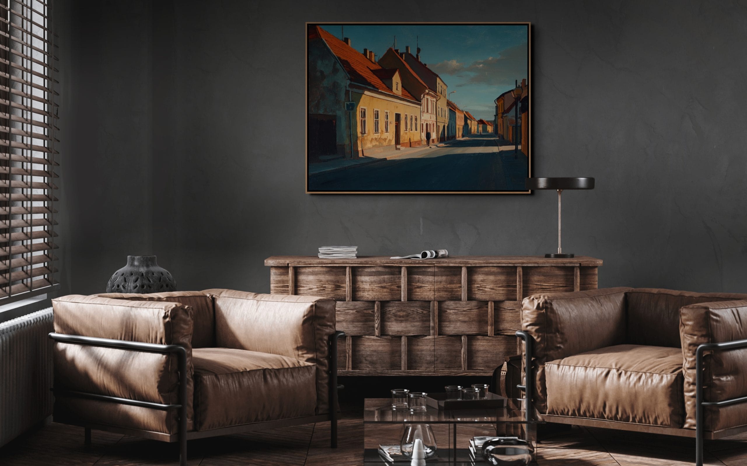Atmosféra tohoto plátna vás okamžitě přenese do hřejivého letního dne v křivolakých uličkách historického centra, kdy se čas na malý okamžik zastavil v ostrém kontrastu poledního slunce a hlubokých stínů. Celý výjev je prostoupen intenzivním pocitem klidu a nostalgie, který umělec mistrovsky zachytil skrze syté, zemité tóny okrových fasád a terakotových střech. Světlo zde neplní pouze roli obyčejného osvětlení scény, ale stává se hlavním nositelem dynamiky prostoru. Jemně modeluje hrubou omítku starých domů a vytváří fascinující diagonální stíny na dlažbě, což dává vyniknout intimitě a nerušenému tichu opuštěné ulice, která působí velmi autentickým a podmanivým dojmem.