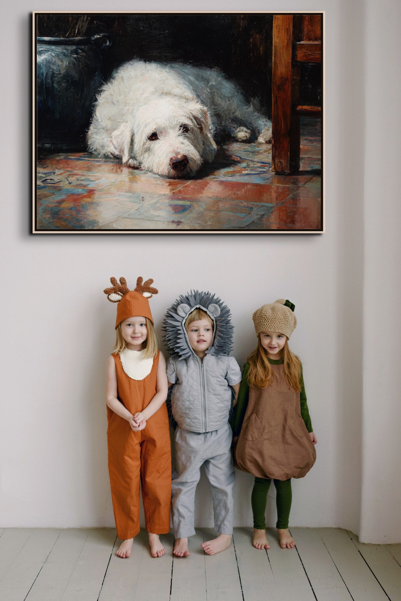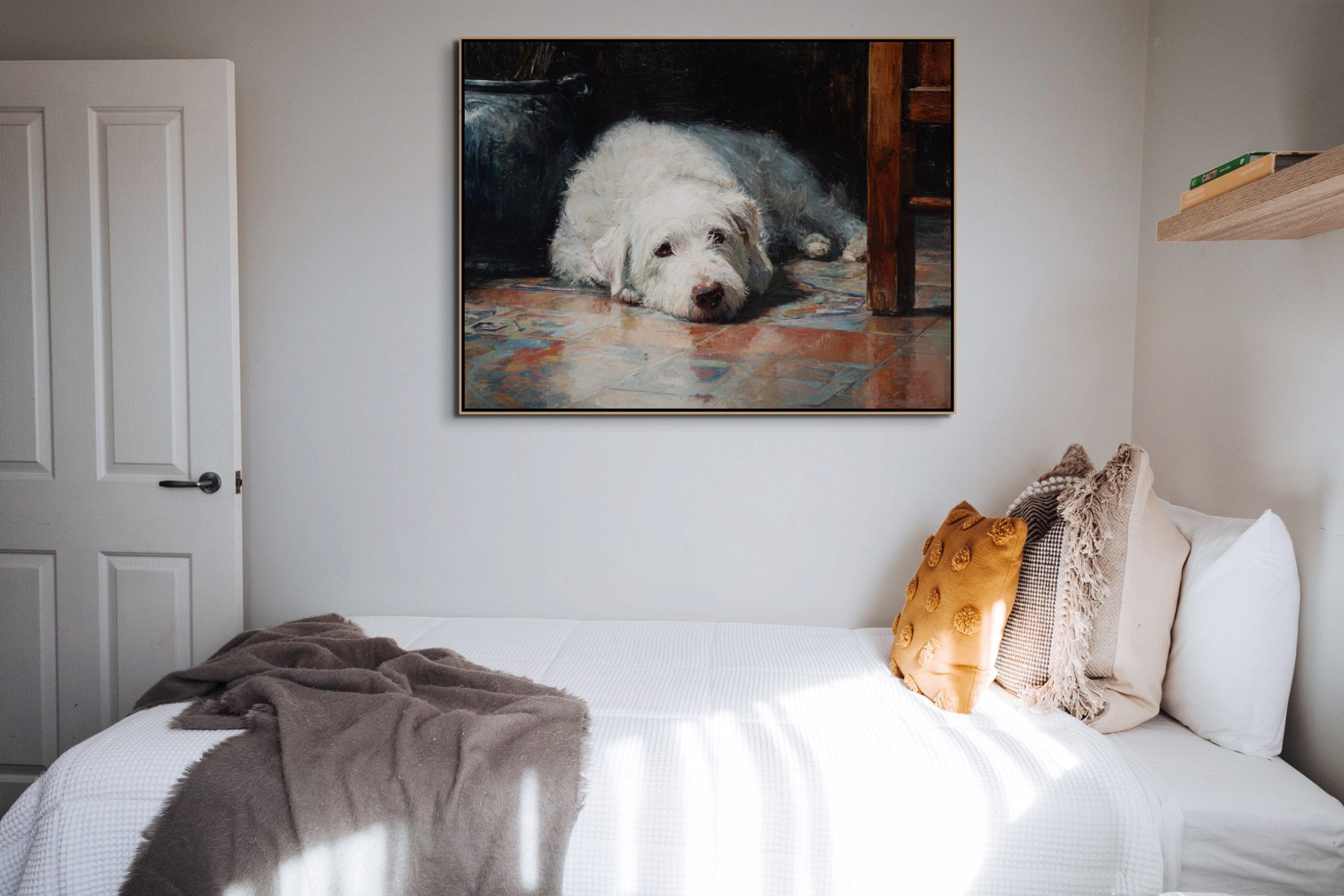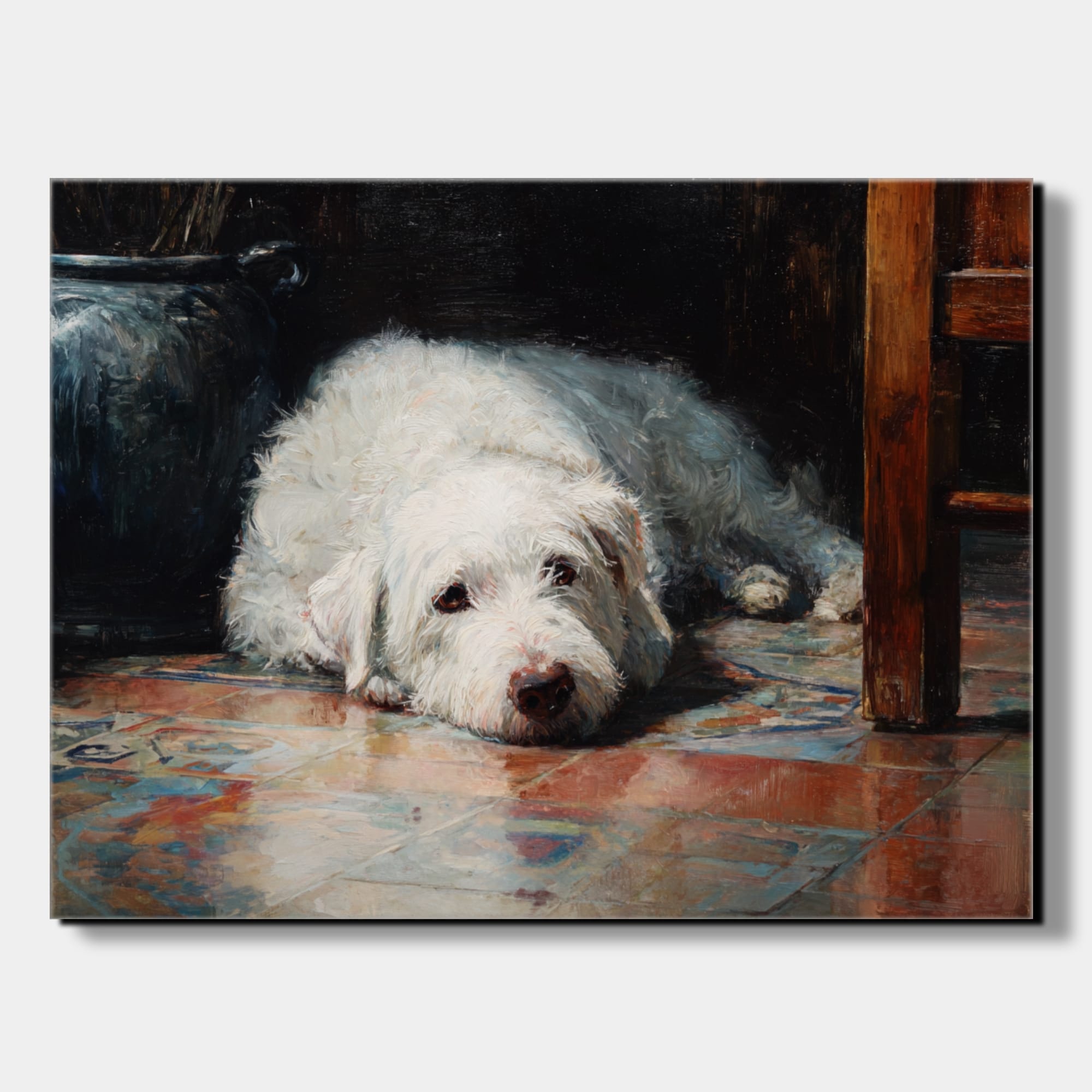Atmosféra tohoto plátna vás okamžitě přenese do poklidného odpoledne v útulném interiéru, kdy se čas na malý okamžik zastavil v odevzdaném a klidném pohledu ležícího zvířete. Celý výjev je prostoupen intenzivním pocitem bezpečí a tichého spojenectví, který umělec mistrovsky zachytil skrze měkké, zemité tóny dopadající na světlou srst velkého psa. Světlo zde neplní pouze roli obyčejného osvětlení scény, ale stává se hlavním nositelem všech emocí. Jemně modeluje strukturu husté srsti, zdůrazňuje hloubku v moudrých očích a vytváří fascinující hru odlesků na vzorované podlaze, což dává vyniknout intimitě a nerušenému soukromí celého zachyceného okamžiku, který působí velmi konejšivým a hlubokým dojmem.
