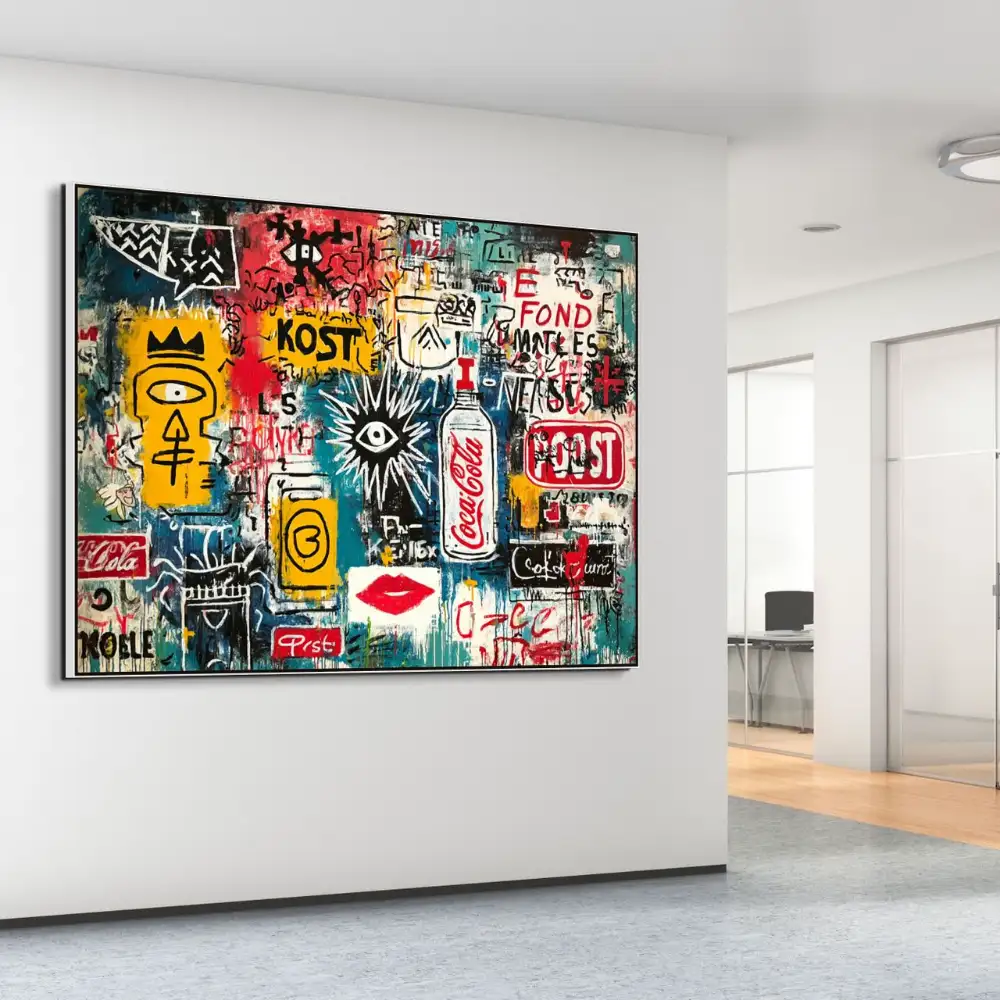 Naše ručně malované obrazy nabízíme v mnoha výtvarných stylech a ručně malovaný street art obraz je skvělou volbou pro ty, kdo chtějí do svého interiéru vnést energii, autenticitu a osobitý městský styl. Na tomto ručně malovaném street art obraze se prolínají ikonické symboly, loga a nápisy jako Coca Cola, Boost, rty nebo oko, které společně vytvářejí barevnou koláž plnou dynamiky a výrazného uměleckého rukopisu. Výrazné tahy štětce, vrstvení barev, škrábance a kapky barvy dodávají celému dílu hloubku a autenticitu skutečné městské zdi.