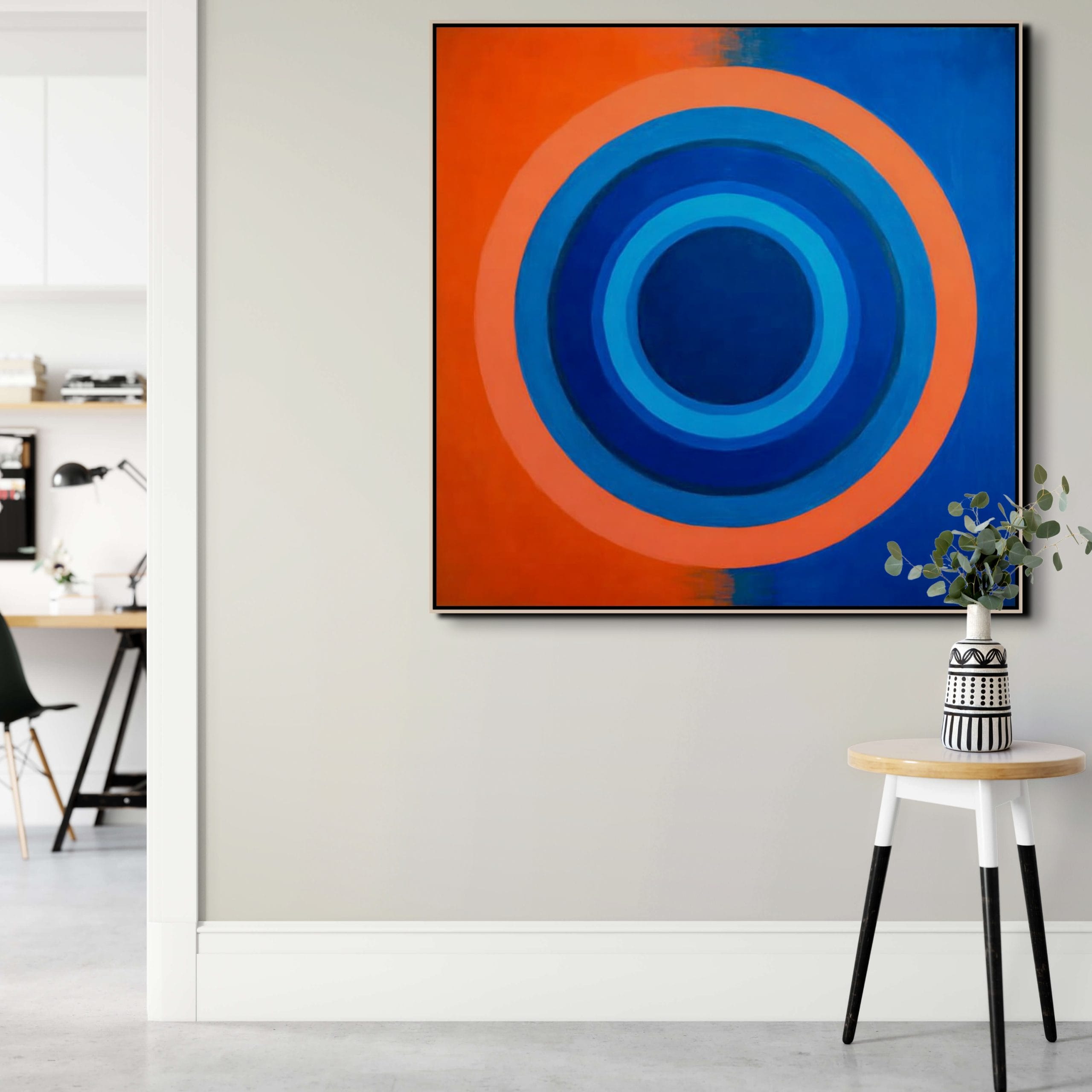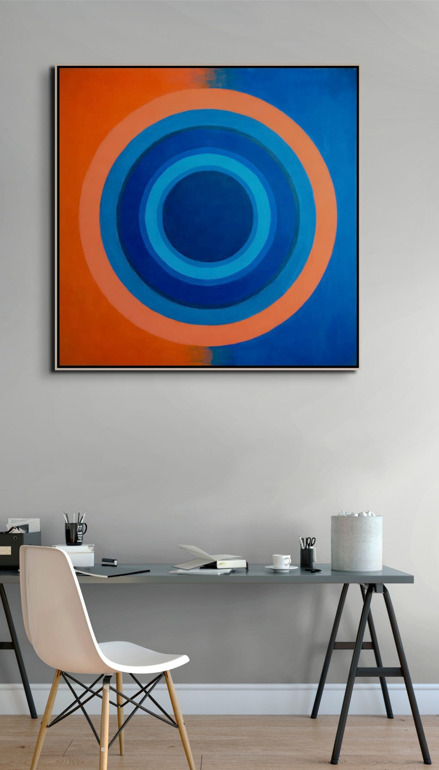 Obraz Terč pracuje s jednoduchým, ale silným geometrickým motivem soustředných kruhů, které přirozeně vedou pozornost diváka do středu kompozice. Kontrast teplých oranžových tónů a chladných odstínů modré vytváří vizuální napětí a pocit rovnováhy mezi energií a klidem. Minimalistické pojetí zdůrazňuje čistotu tvaru a precizní práci s barvou.