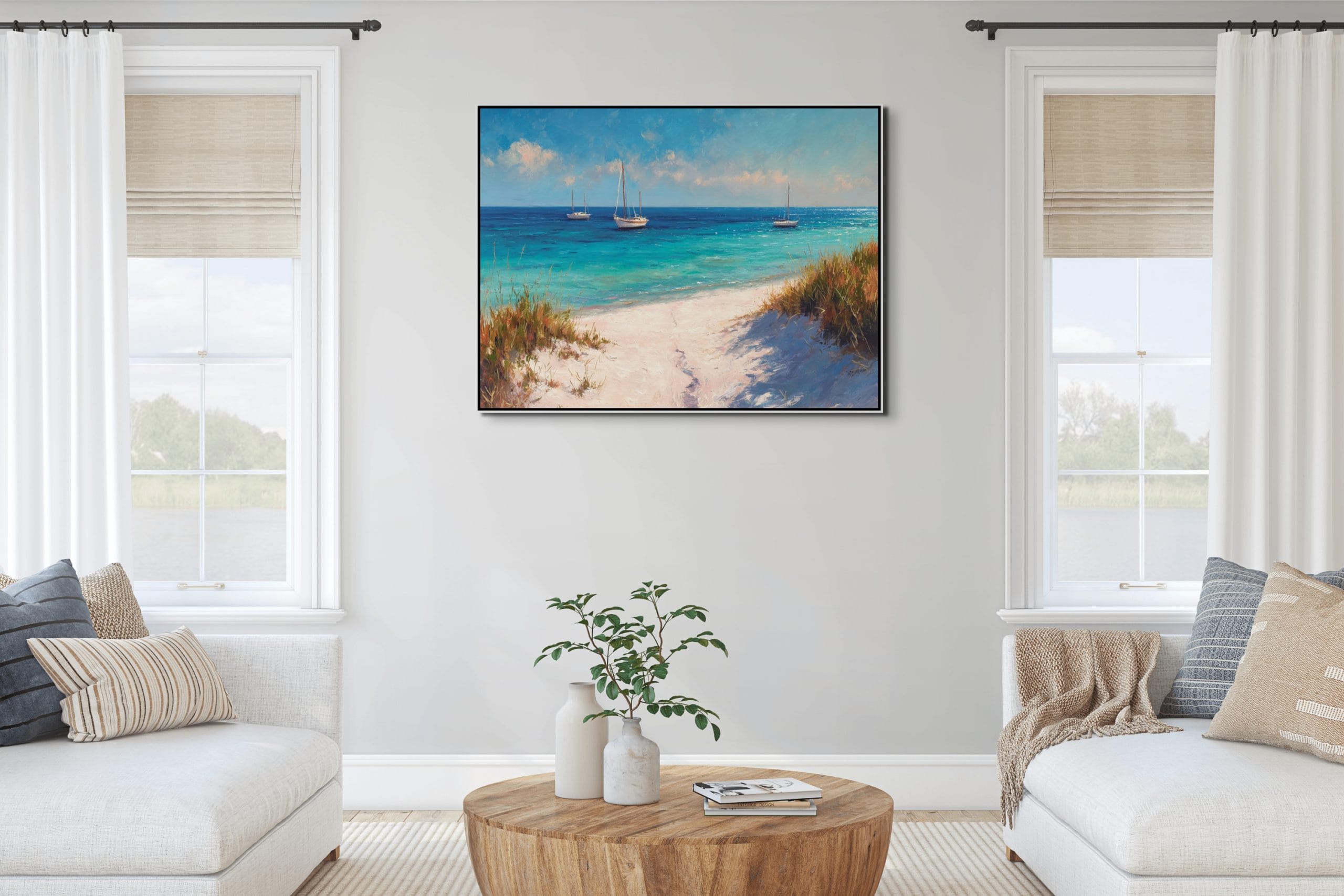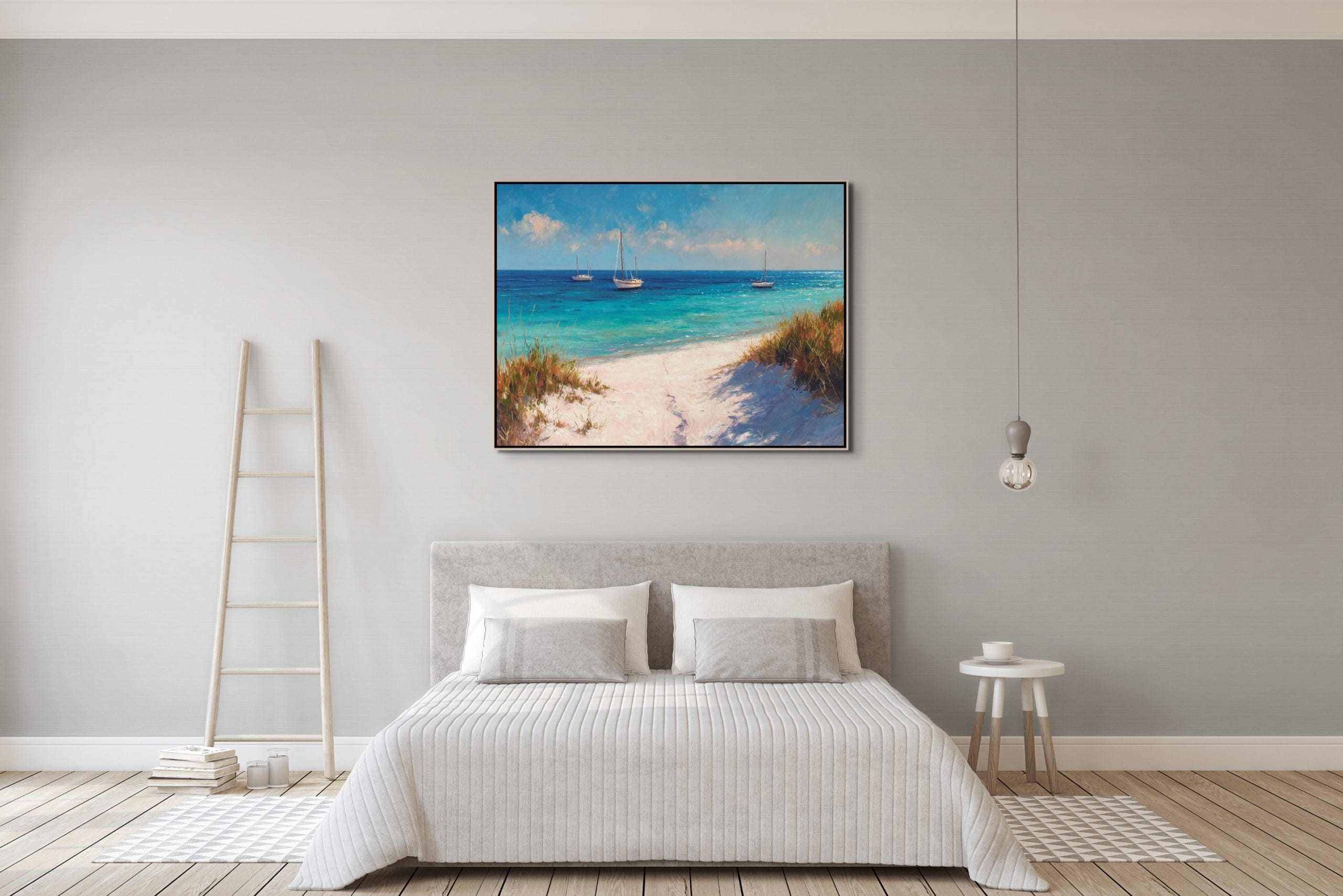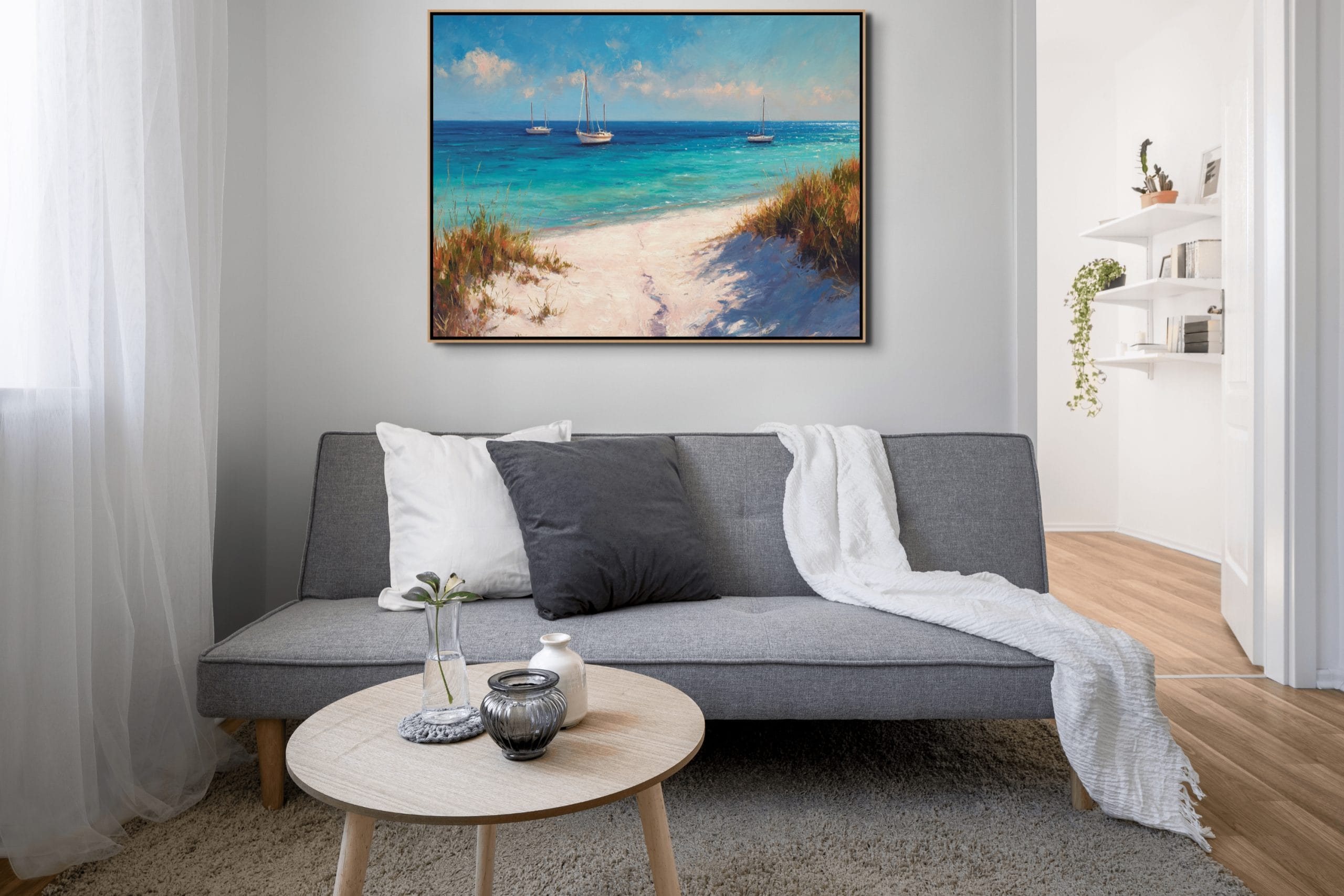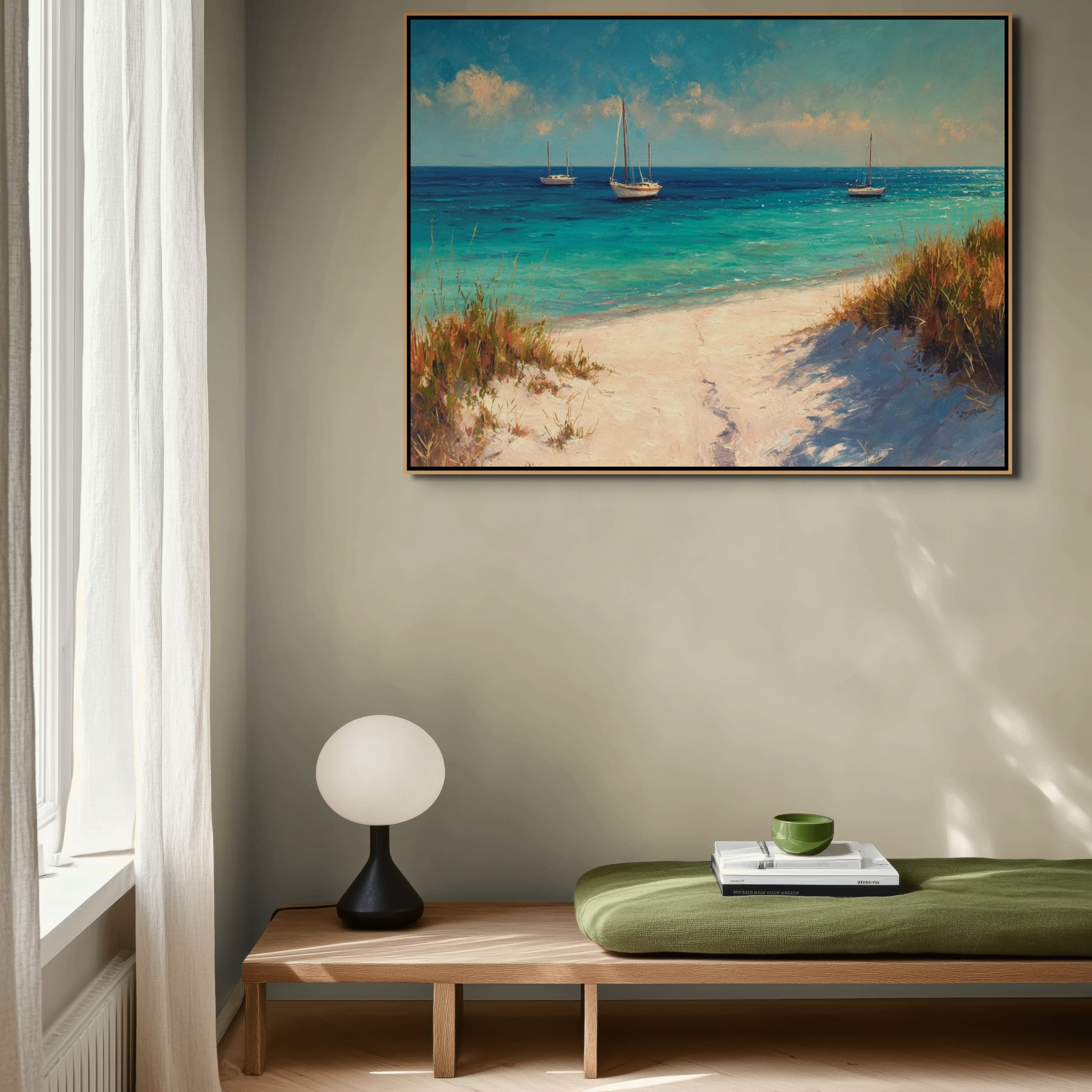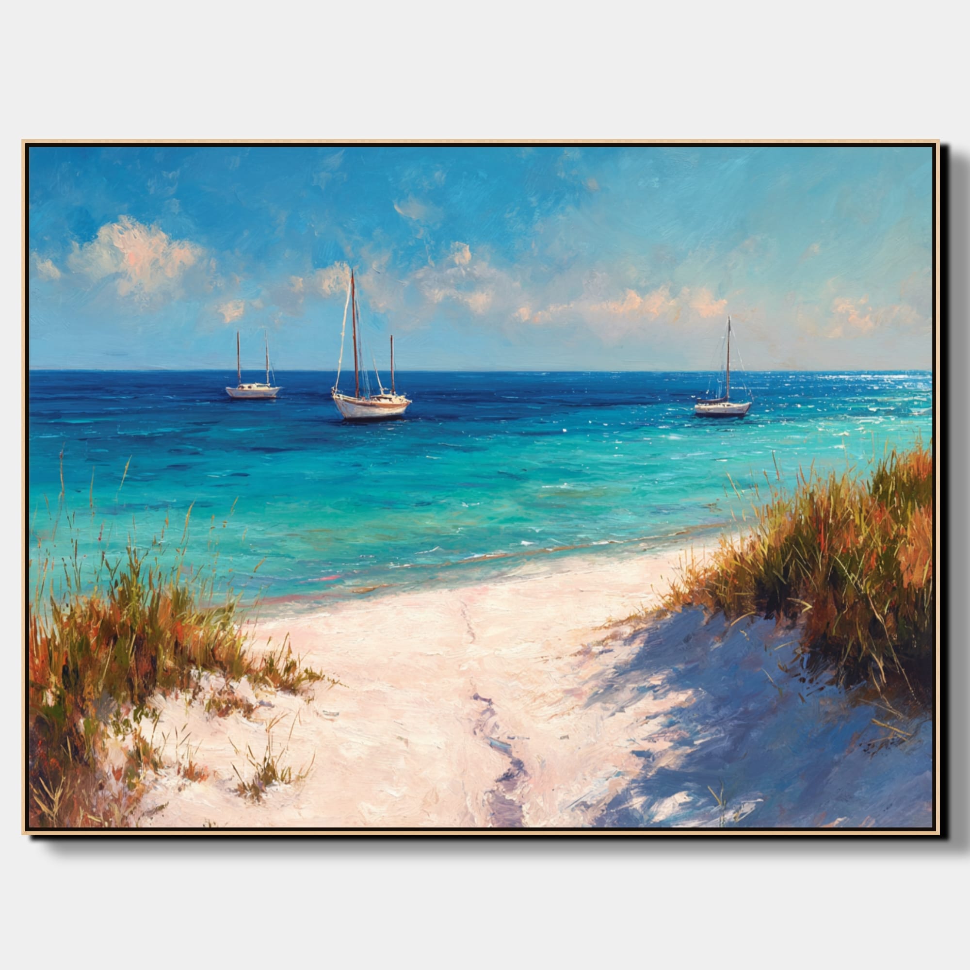 Klidná mořská scenérie, která přenáší atmosféru letního dne přímo do interiéru. Tyrkysová hladina, jemné odlesky světla a lodě zakotvené v dálce vytvářejí pocit otevřeného prostoru a lehkosti. Vzdušná obloha s lehkými oblaky doplňuje celkový dojem harmonie a přirozeného klidu.