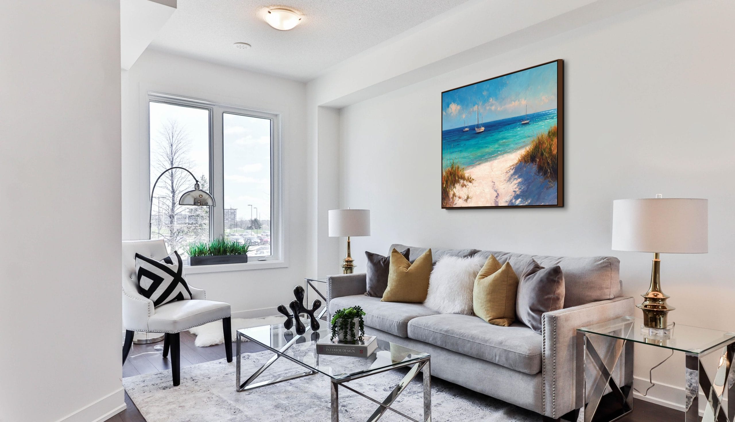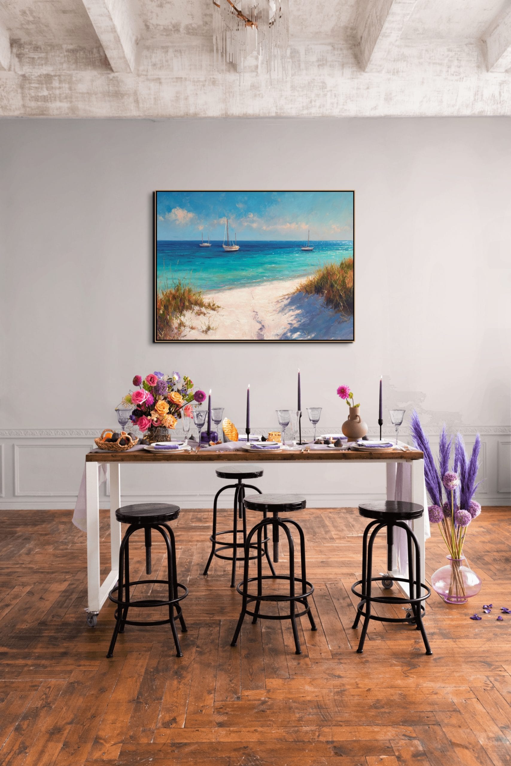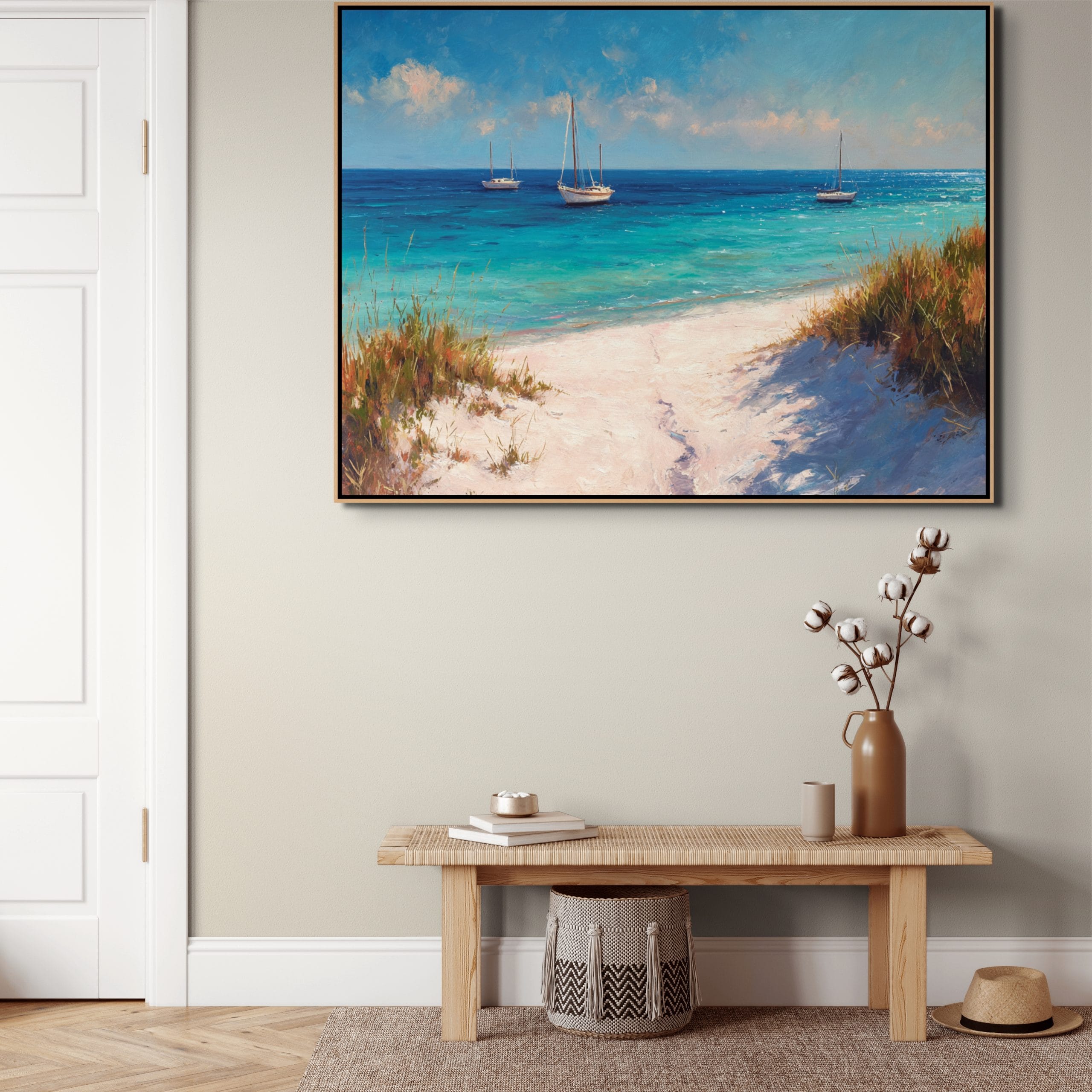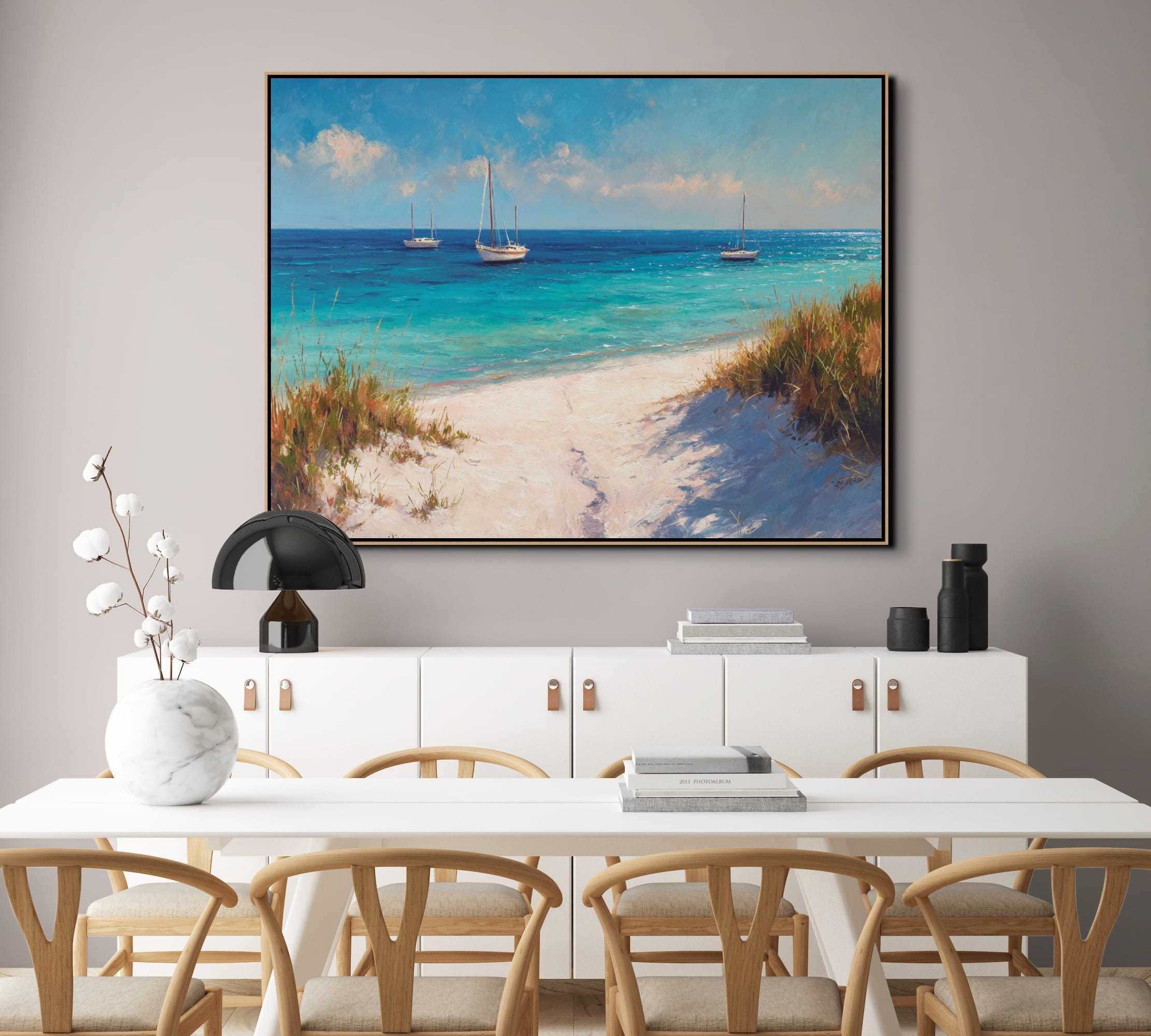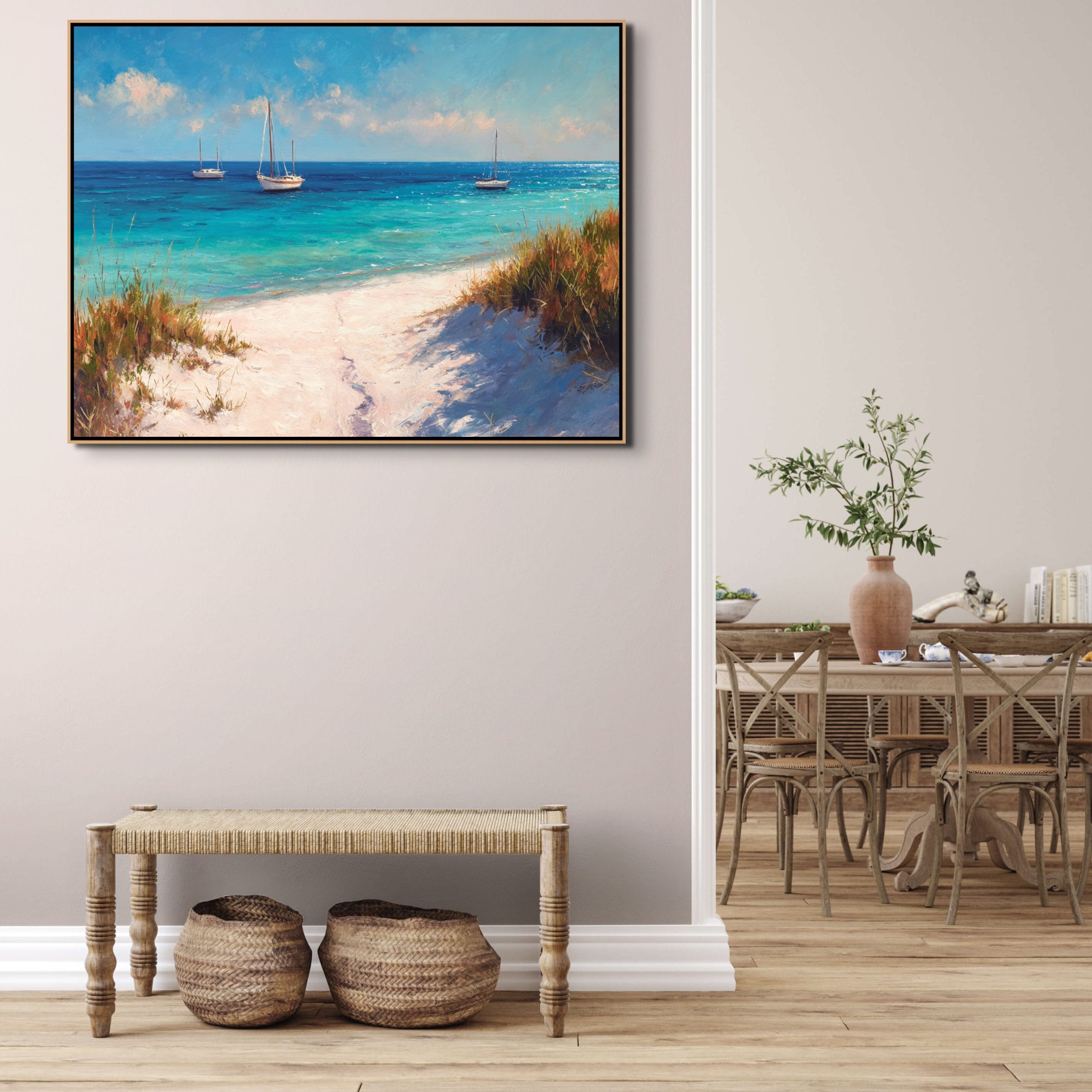 Klidná mořská scenérie, která přenáší atmosféru letního dne přímo do interiéru. Tyrkysová hladina, jemné odlesky světla a lodě zakotvené v dálce vytvářejí pocit otevřeného prostoru a lehkosti. Vzdušná obloha s lehkými oblaky doplňuje celkový dojem harmonie a přirozeného klidu.