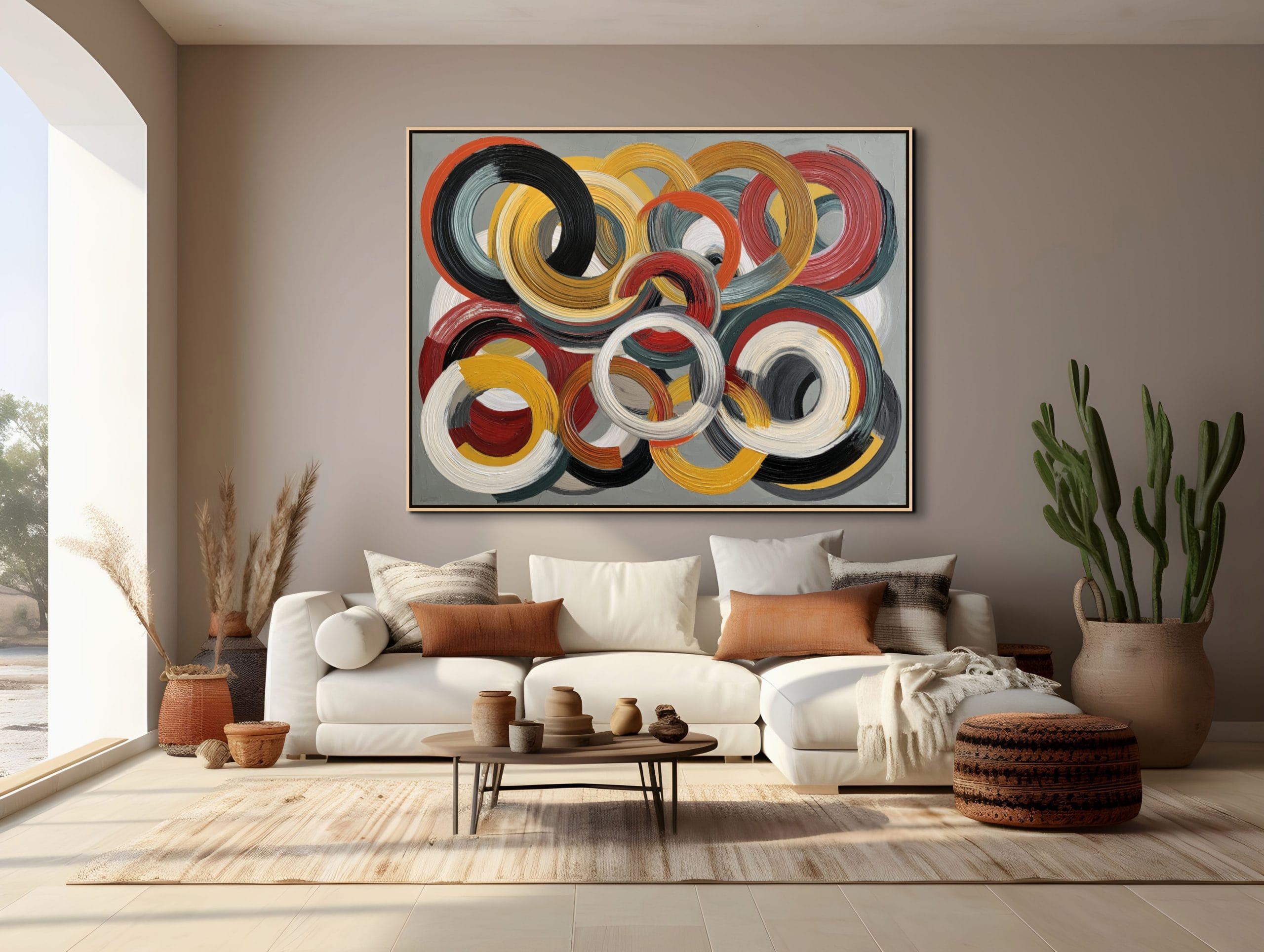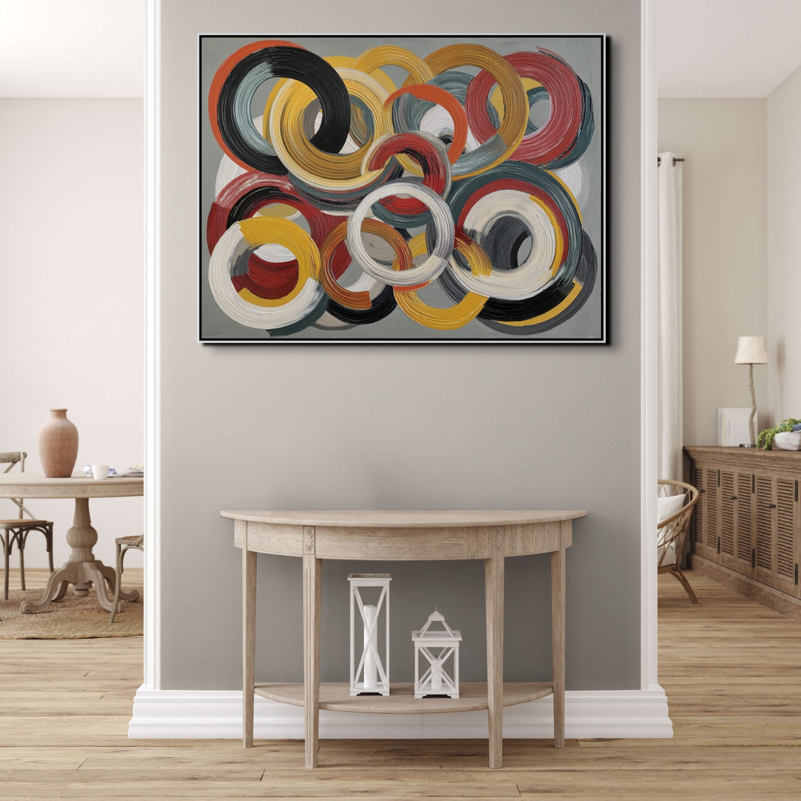 Kompozice pracuje s pocitem cykličnosti a plynutí, kdy jednotlivé kruhy vytvářejí vizuální dialog. Na zeď se tento obraz hodí jako výrazný solitér, který prostoru dodá hloubku a rytmus. Dílo se uplatní v moderních i industriálně laděných interiérech, kde vynikne jeho struktura a barevný kontrast.