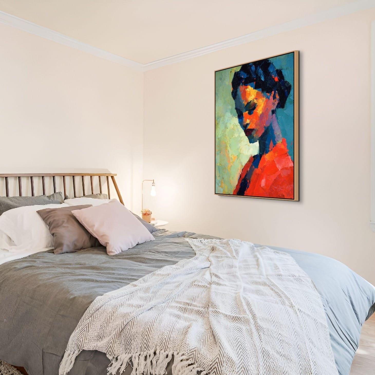 Atmosféra působí intenzivně, ale zároveň soustředěně, jako zachycený moment vnitřního napětí a klidu. Malby na zeď tohoto typu se hodí do moderních interiérů, kde mají být dominantou prostoru a zároveň přinést osobitý výraz.