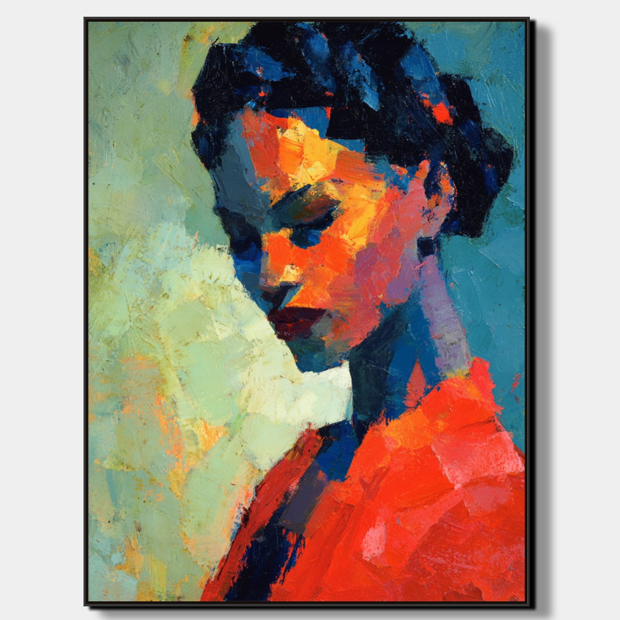 Portrétní malba je postavená na silném kontrastu teplých červenooranžových tónů a hlubokých modrých stínů, které vytvářejí dramatickou modelaci tváře. Viditelné, výrazné tahy štětce skládají obraz do barevných ploch a ponechávají v něm energii gestické malby. Pozadí v tlumených zelených a tyrkysových odstínech zjemňuje celkový dojem a nechává vyniknout hlavní motiv.